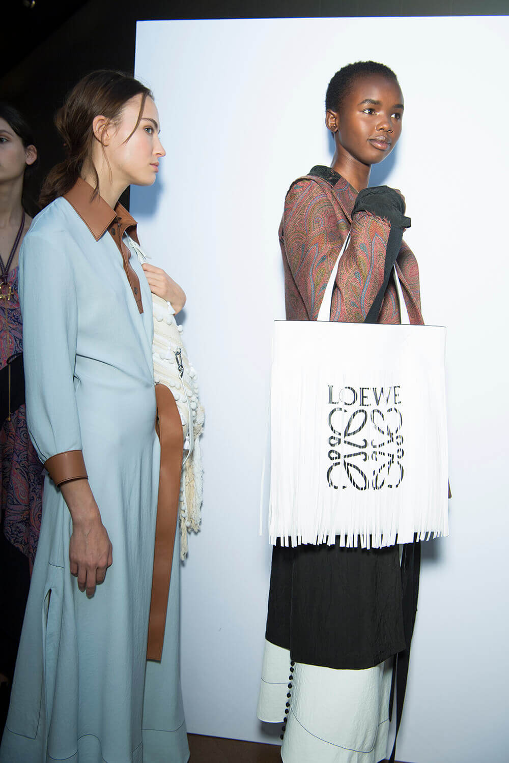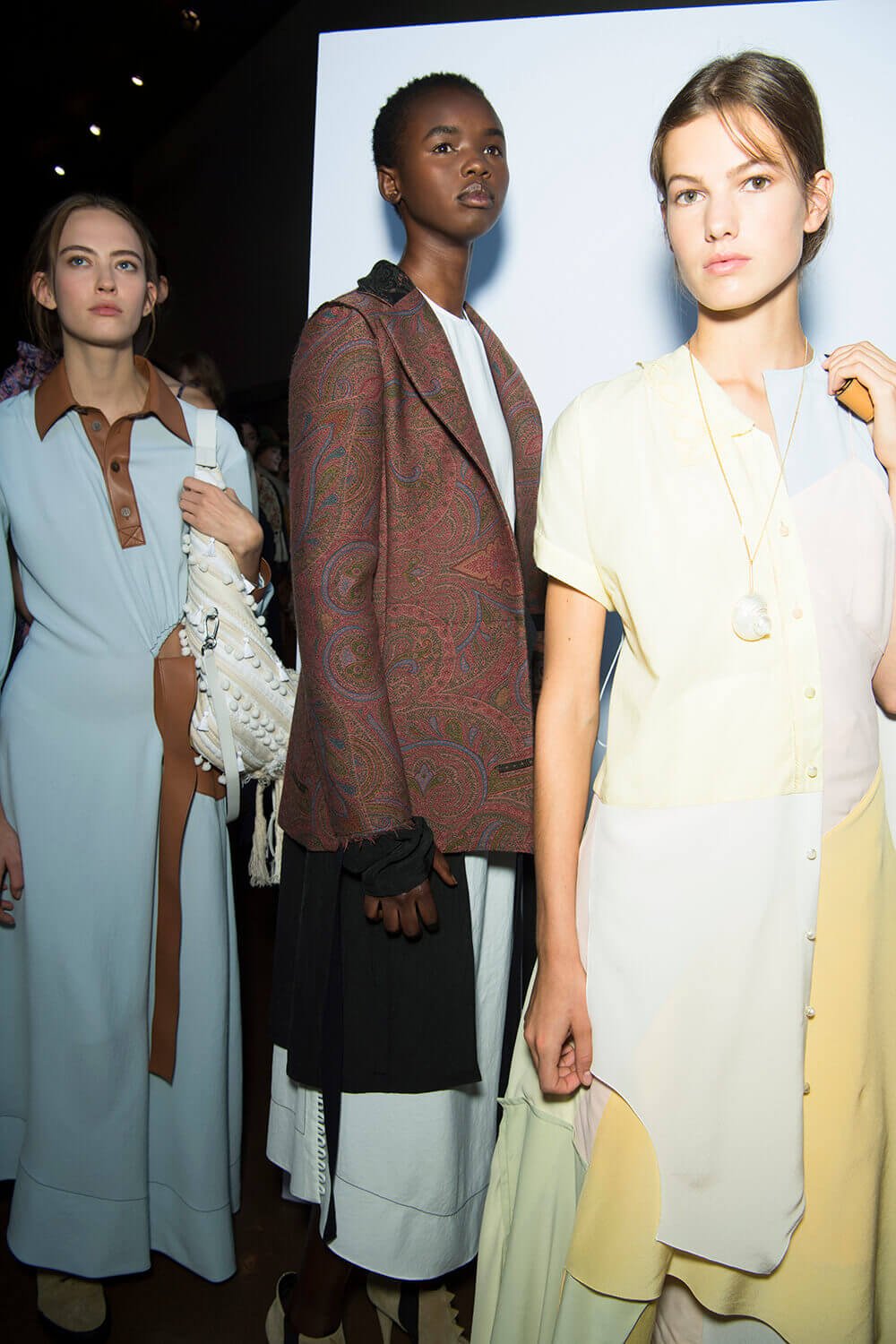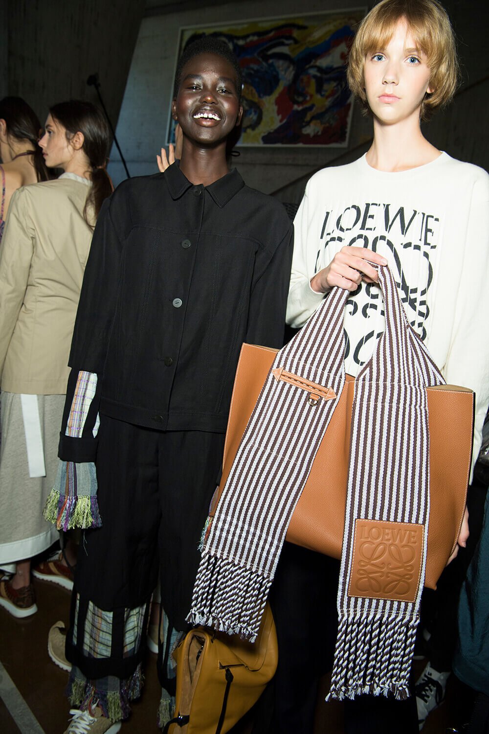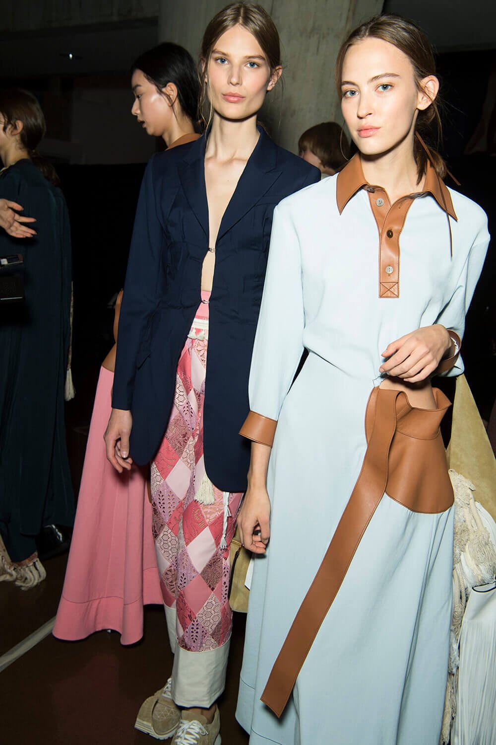 From the first dress out – a long white tee-dress with a superimposed crinkly and pastel patchwork pattern from a seemingly different dress – things got better and better. Intermixed were masculine and wider trouser looks, worn with roomy and or nipped jackets. One pair of trousers was patchwork quilt and a new take on Loewe’s commercially successful ‘Fisherman’ jeans.