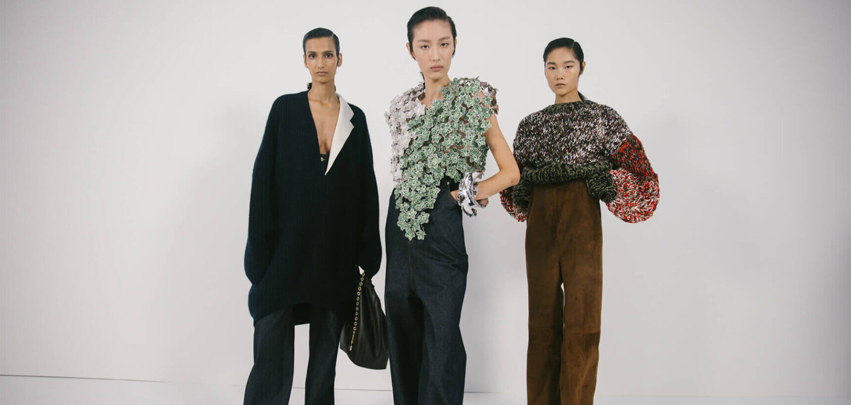 He’s done crazy (remember that car dress?) but now Jonathan Anderson is transitioning Loewe away from viral fashion madness towards something more wearable. The models stalked past monumental bronze sculptures by American artist Lynda Benglis wearing a collection that sought a balance between eccentricity and dressing for real-life. We saw plenty of menswear-inspired wardrobe classics (white shirts, wool blazers, city coats, jeans, loafers), but don’t worry, none of it looked conventional. Trousers and jeans came ultra high waisted, pockets sat high on the ribs, elongating the silhouette and making the models look like they’d been painted by Lowry. Cocoon-like ponchos looked like they’d been knitted on giant needles. Those same golden needles were pierced through the folded waistbands of skirts and trousers. As for the accessories, crystal ballerina pumps, round-toed leather mules and boiled wool loafers were matched with slouchy sacks and practical bucket bags. The manipulated proportions will be enough to ward-off the ‘normals’ and mark this out as for those in-the-fashion-know.