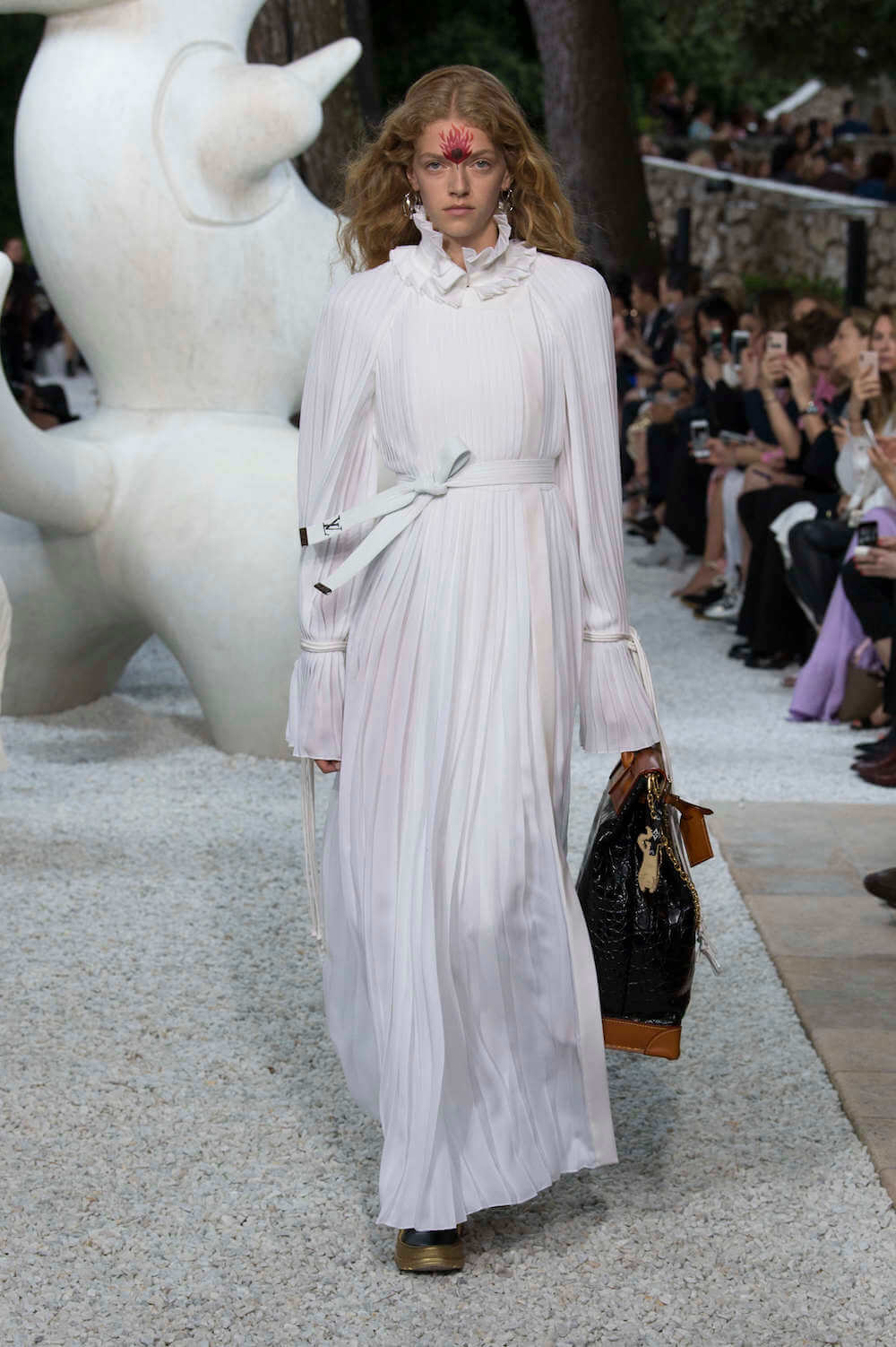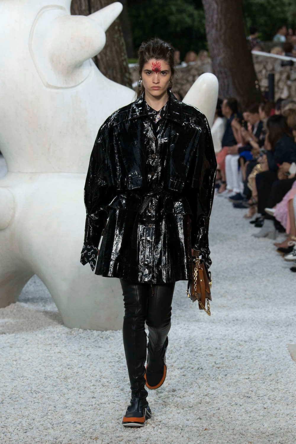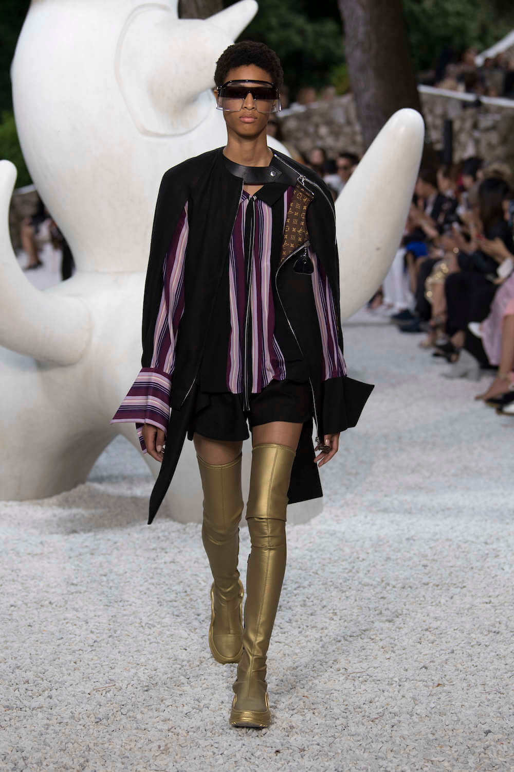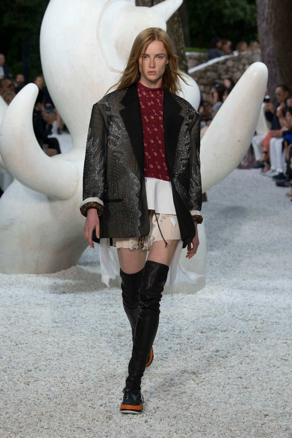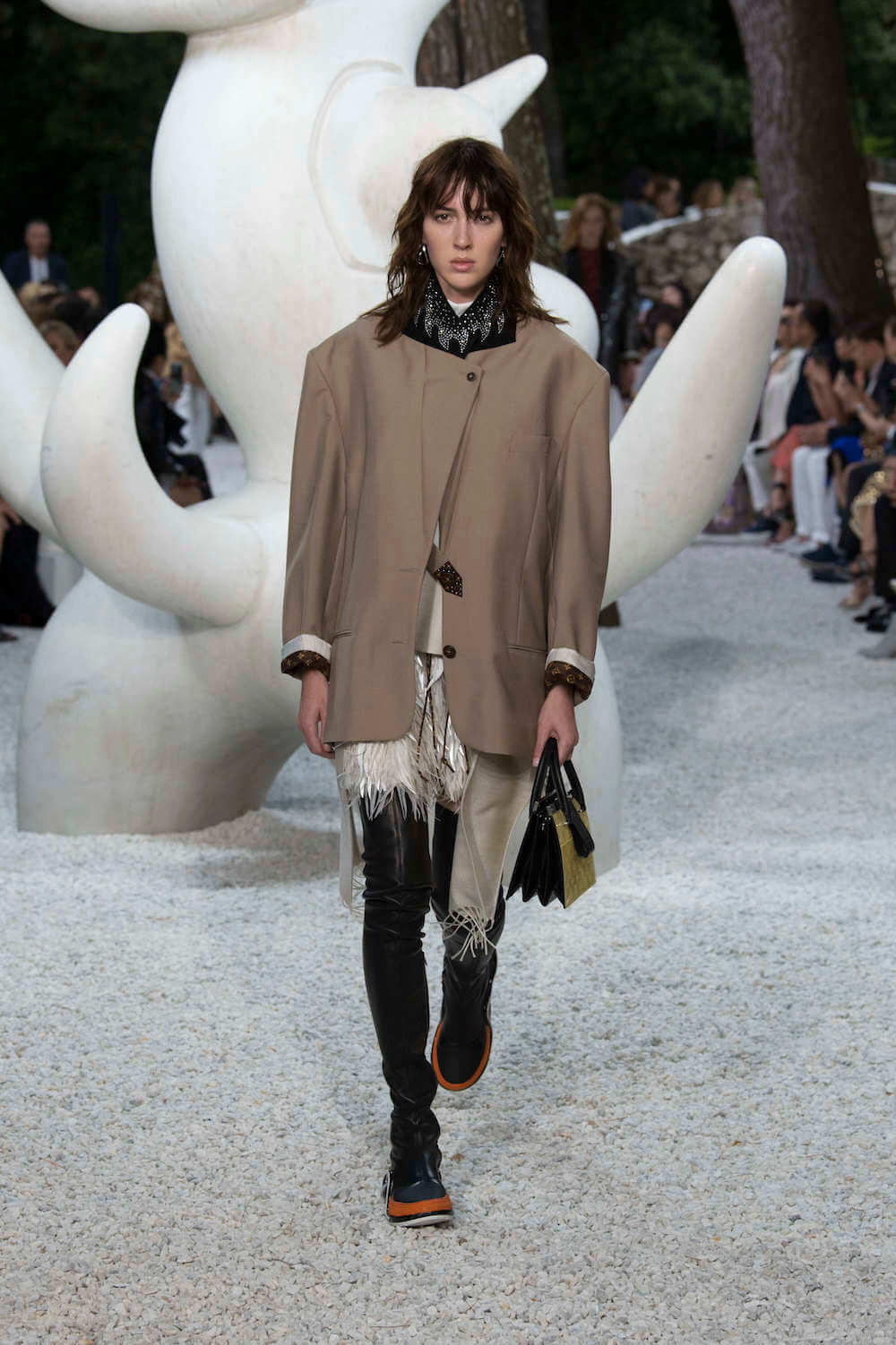 This was the epic tour-de-force fire in Nicolas Ghesquière’s heart, marking a new five year contract at Louis Vuitton. In case you missed the memo last week, Nicolas Ghesquière is #notgoinganywhere. And so we begin this review with a breaking newsworthy collaboration: Louis Vuitton has partnered with Grace Coddington on a capsule collection. Yes, that’s right, her love for cats, that she has always sketched so fabulously, purred on the arms of Ghesquière’s girls as they glided through the grounds of the Foundation Maeght. “I hope it will be a dream come true for Pumpkin, Blanket and Nicolas’ dog – it certainly is for me,” Grace said. “It started with our love for animals, it’s where Nicolas and I really connect beyond fashion.” A connection we are here for. So this was Cruise 2019 and these girls were cruising, their new found territory overlooking the Colline des Gardettes’ hilltop amongst the five elements that Isabelle Maeght said before the show are vegetable, mineral, water, fire and human. Healthy! Yes, it was down to earth, completely grounded in thigh high leather boots that scrunched into solid golden platform sneaker situations leading the way, space walkers. There is always an undercurrent of pretty in Ghesquière’s LV; loose satin shorts were somewhere between boxer and boudoir, giant paillettes flounced like bird feathers on a new-school youthful red carpet, for the next wave of young actors. The purest white pleats sliced sleeves so killer soft with their partners in crime- tough leather panels over shoulders, an armour in full force. Sunglasses were goggle and visor, Princess Anne last week vibes – we knew she was on to something. Each jacket and vest was perfectly sculpted, falling in our direction, the Ghesquière’s effect. It was a fire collection and it all glistened and shined, that Vuitton energy pumping out with the collaboration of the season. Oh how we want a Grace ‘Cat’ Coddington right now. Love partnerships at this clever Vuitton level. Nicolas Ghesquière was right. He’s not going anywhere. Placing order for thigh high sneaker boots now.