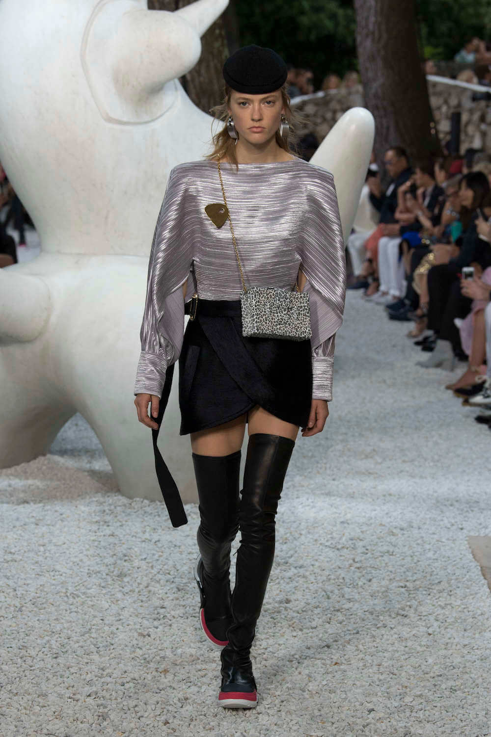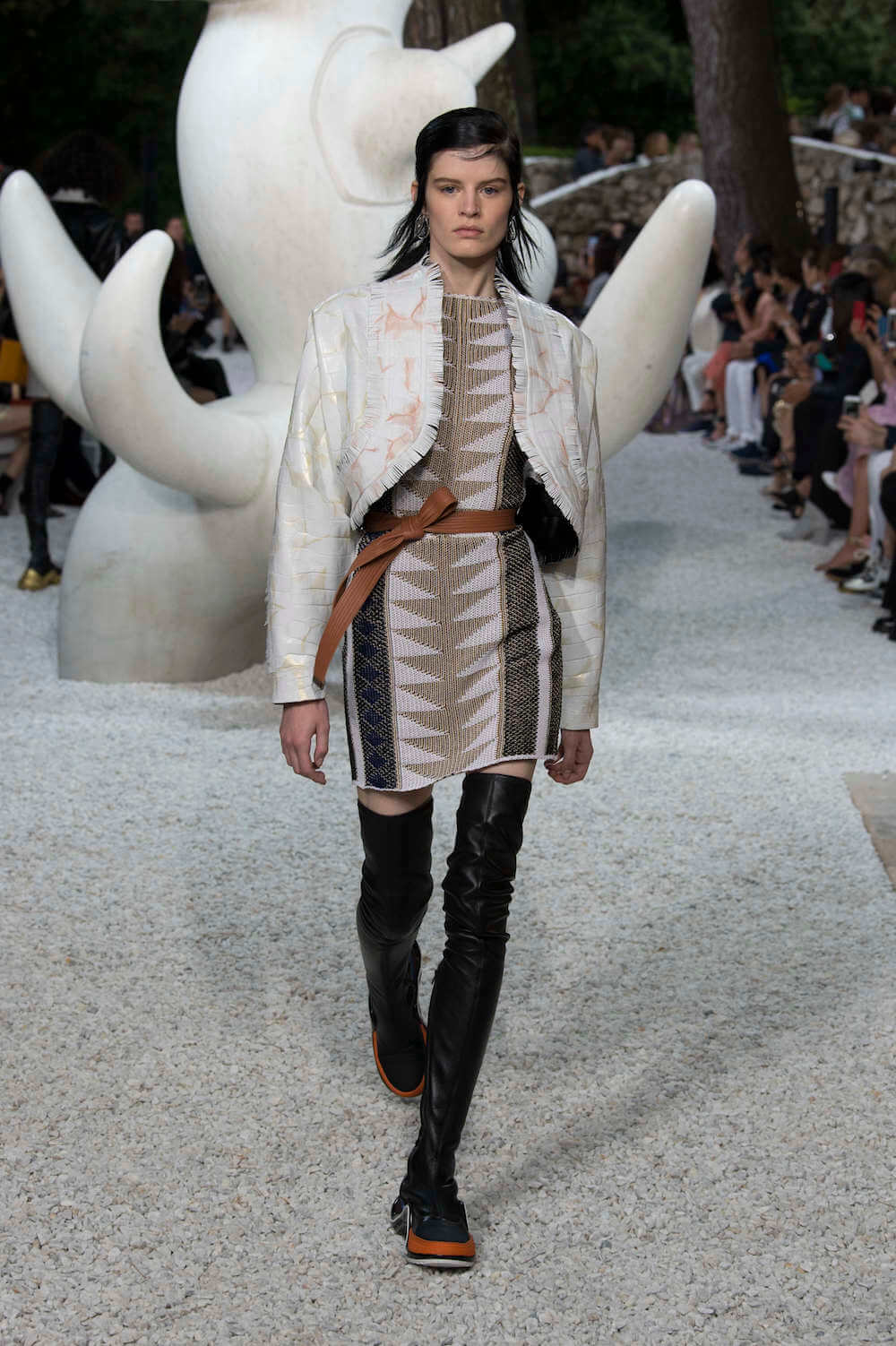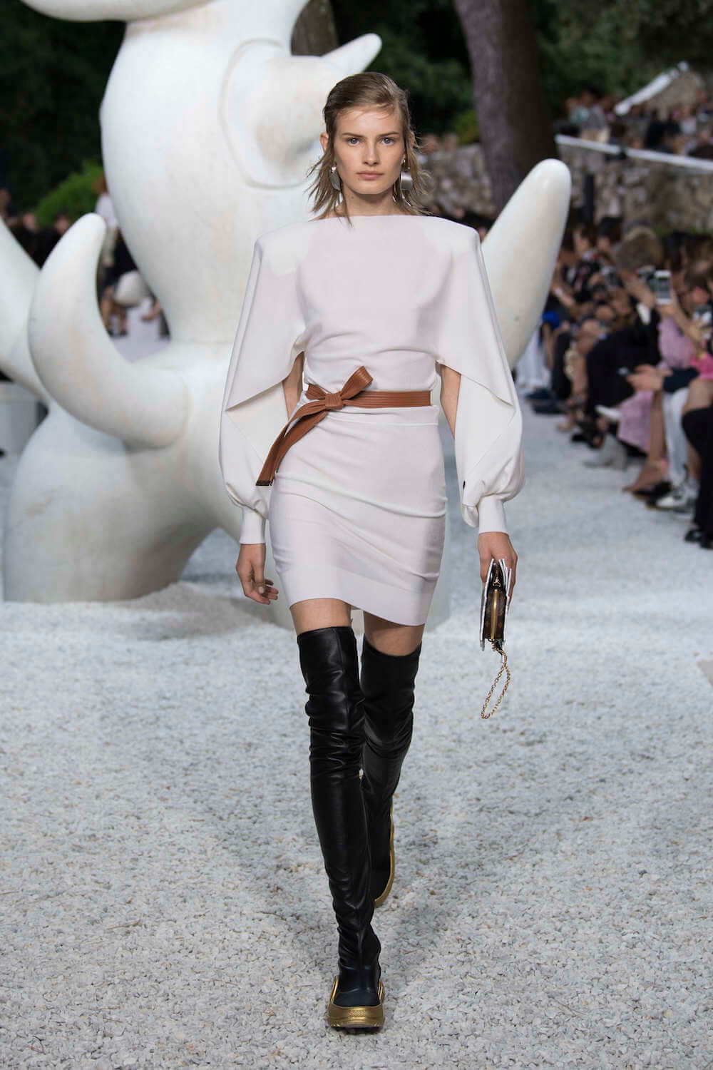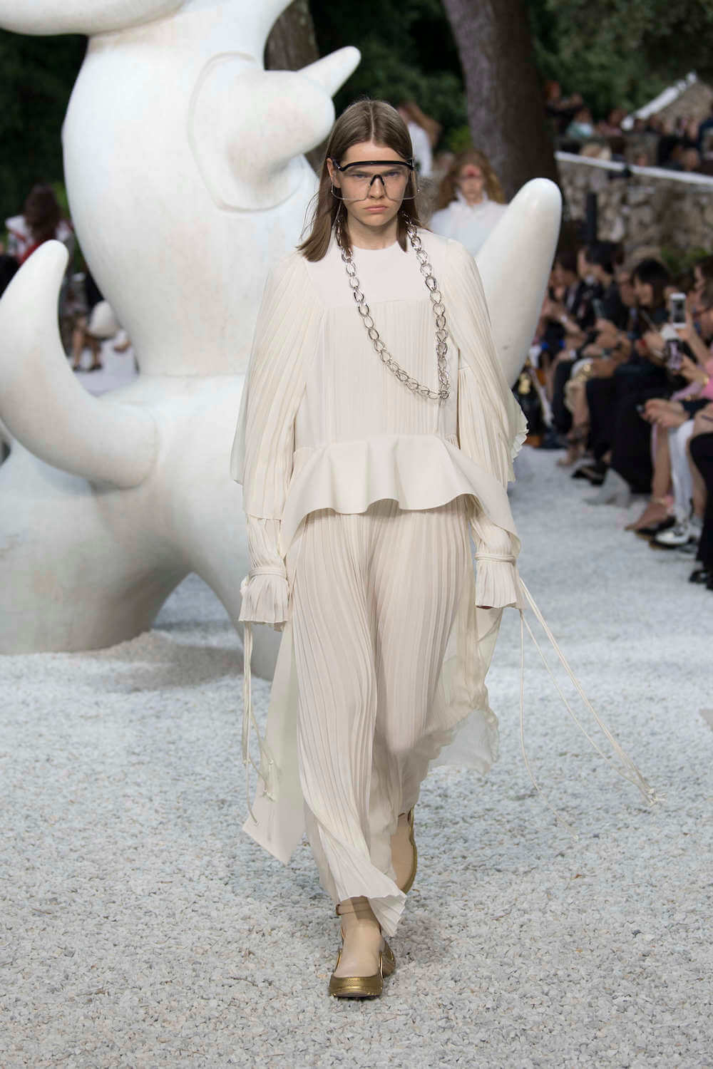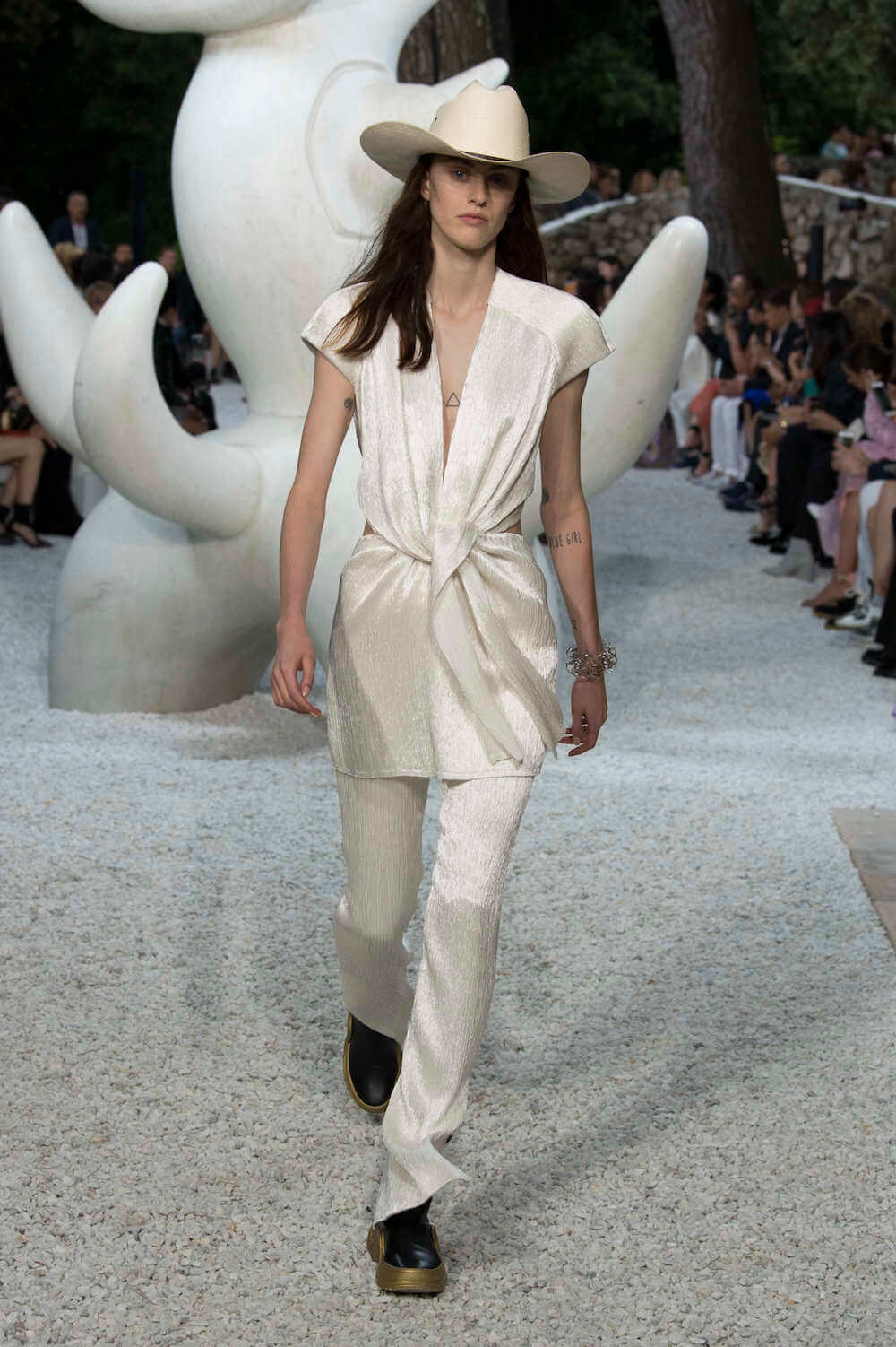 This was the epic tour-de-force fire in Nicolas Ghesquière’s heart, marking a new five year contract at Louis Vuitton. In case you missed the memo last week, Nicolas Ghesquière is #notgoinganywhere. And so we begin this review with a breaking newsworthy collaboration: Louis Vuitton has partnered with Grace Coddington on a capsule collection. Yes, that’s right, her love for cats, that she has always sketched so fabulously, purred on the arms of Ghesquière’s girls as they glided through the grounds of the Foundation Maeght. “I hope it will be a dream come true for Pumpkin, Blanket and Nicolas’ dog – it certainly is for me,” Grace said. “It started with our love for animals, it’s where Nicolas and I really connect beyond fashion.” A connection we are here for. So this was Cruise 2019 and these girls were cruising, their new found territory overlooking the Colline des Gardettes’ hilltop amongst the five elements that Isabelle Maeght said before the show are vegetable, mineral, water, fire and human. Healthy! Yes, it was down to earth, completely grounded in thigh high leather boots that scrunched into solid golden platform sneaker situations leading the way, space walkers. There is always an undercurrent of pretty in Ghesquière’s LV; loose satin shorts were somewhere between boxer and boudoir, giant paillettes flounced like bird feathers on a new-school youthful red carpet, for the next wave of young actors. The purest white pleats sliced sleeves so killer soft with their partners in crime- tough leather panels over shoulders, an armour in full force. Sunglasses were goggle and visor, Princess Anne last week vibes – we knew she was on to something. Each jacket and vest was perfectly sculpted, falling in our direction, the Ghesquière’s effect. It was a fire collection and it all glistened and shined, that Vuitton energy pumping out with the collaboration of the season. Oh how we want a Grace ‘Cat’ Coddington right now. Love partnerships at this clever Vuitton level. Nicolas Ghesquière was right. He’s not going anywhere. Placing order for thigh high sneaker boots now.