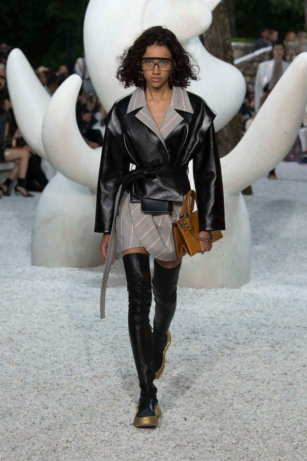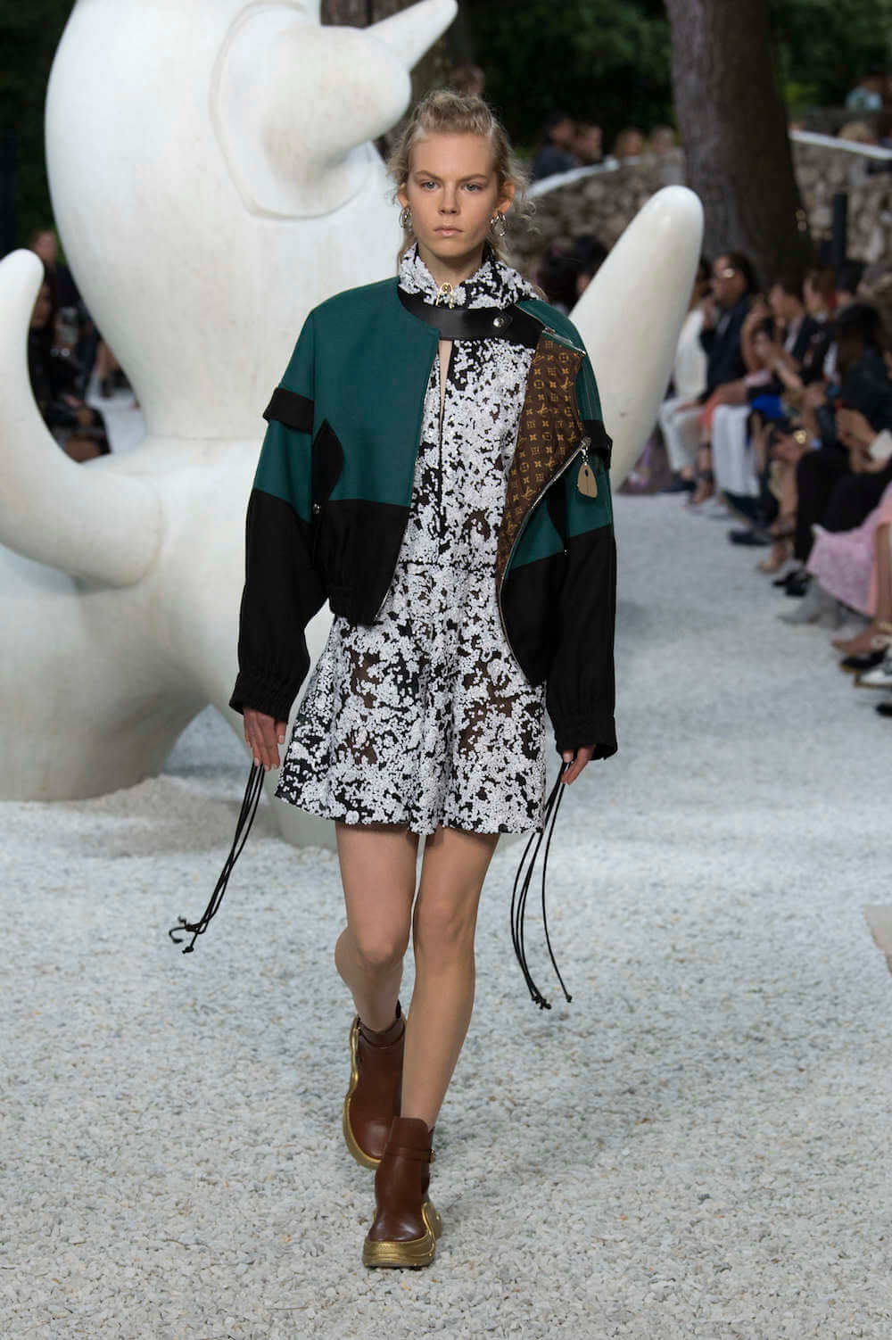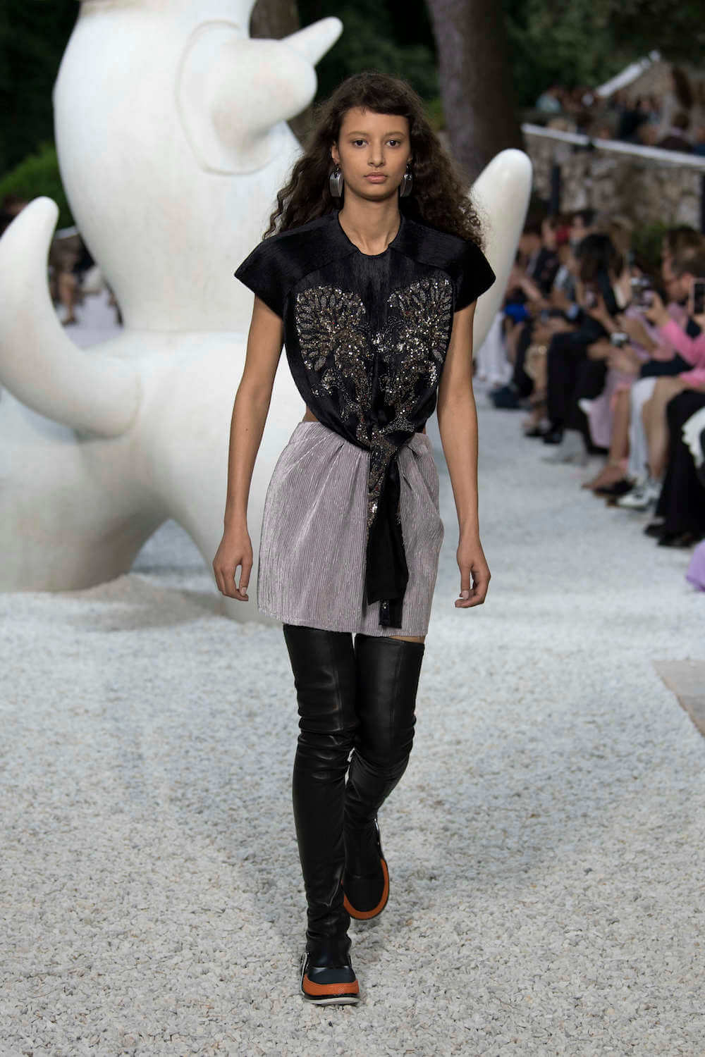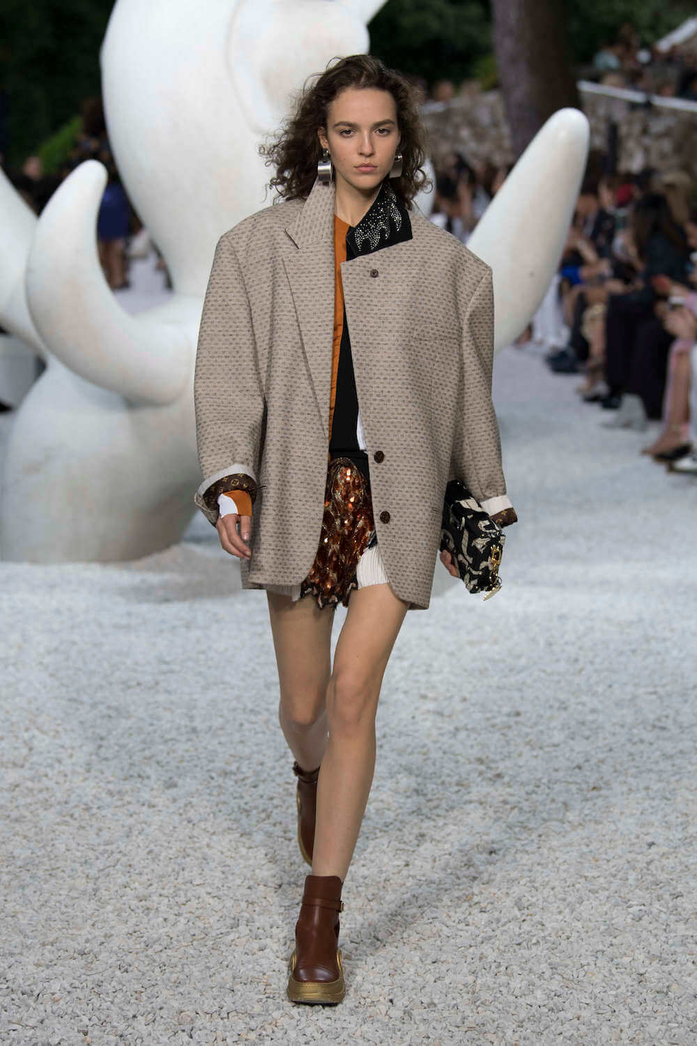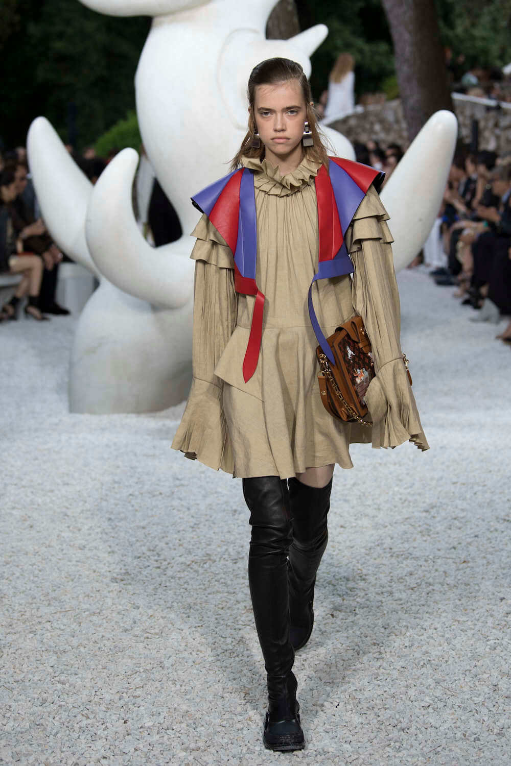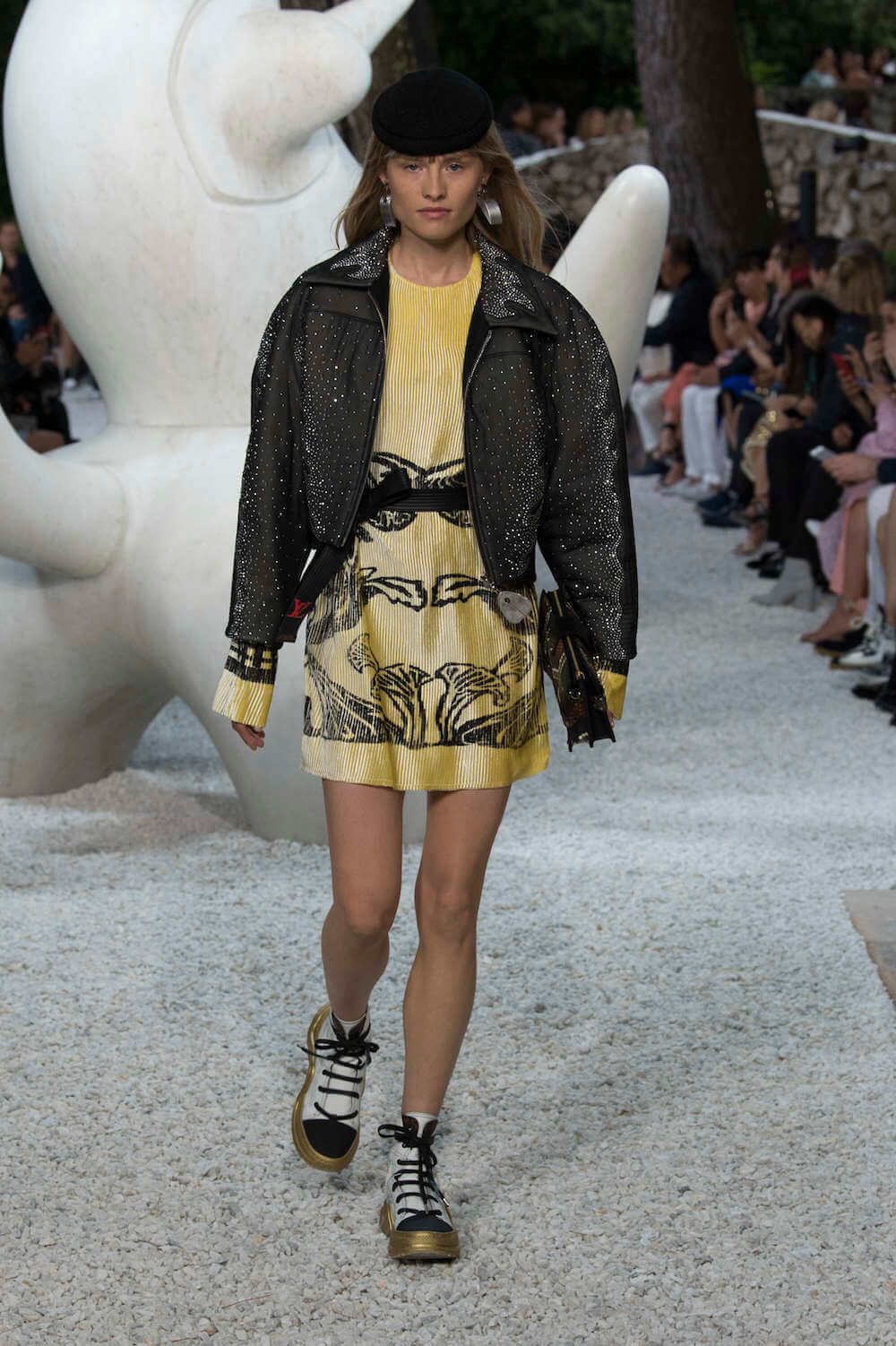 This was the epic tour-de-force fire in Nicolas Ghesquière’s heart, marking a new five year contract at Louis Vuitton. In case you missed the memo last week, Nicolas Ghesquière is #notgoinganywhere. And so we begin this review with a breaking newsworthy collaboration: Louis Vuitton has partnered with Grace Coddington on a capsule collection. Yes, that’s right, her love for cats, that she has always sketched so fabulously, purred on the arms of Ghesquière’s girls as they glided through the grounds of the Foundation Maeght. “I hope it will be a dream come true for Pumpkin, Blanket and Nicolas’ dog – it certainly is for me,” Grace said. “It started with our love for animals, it’s where Nicolas and I really connect beyond fashion.” A connection we are here for. So this was Cruise 2019 and these girls were cruising, their new found territory overlooking the Colline des Gardettes’ hilltop amongst the five elements that Isabelle Maeght said before the show are vegetable, mineral, water, fire and human. Healthy! Yes, it was down to earth, completely grounded in thigh high leather boots that scrunched into solid golden platform sneaker situations leading the way, space walkers. There is always an undercurrent of pretty in Ghesquière’s LV; loose satin shorts were somewhere between boxer and boudoir, giant paillettes flounced like bird feathers on a new-school youthful red carpet, for the next wave of young actors. The purest white pleats sliced sleeves so killer soft with their partners in crime- tough leather panels over shoulders, an armour in full force. Sunglasses were goggle and visor, Princess Anne last week vibes – we knew she was on to something. Each jacket and vest was perfectly sculpted, falling in our direction, the Ghesquière’s effect. It was a fire collection and it all glistened and shined, that Vuitton energy pumping out with the collaboration of the season. Oh how we want a Grace ‘Cat’ Coddington right now. Love partnerships at this clever Vuitton level. Nicolas Ghesquière was right. He’s not going anywhere. Placing order for thigh high sneaker boots now.