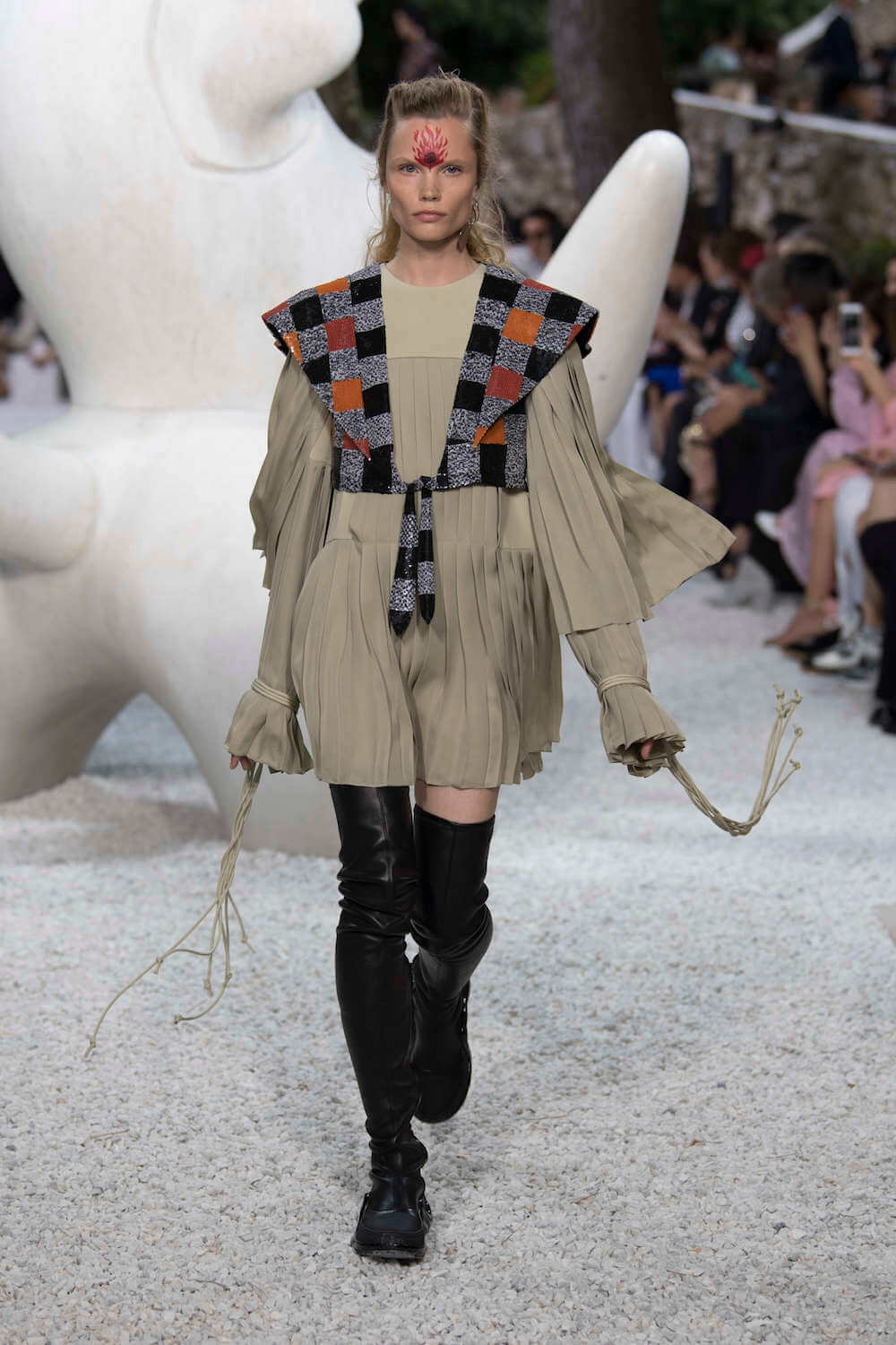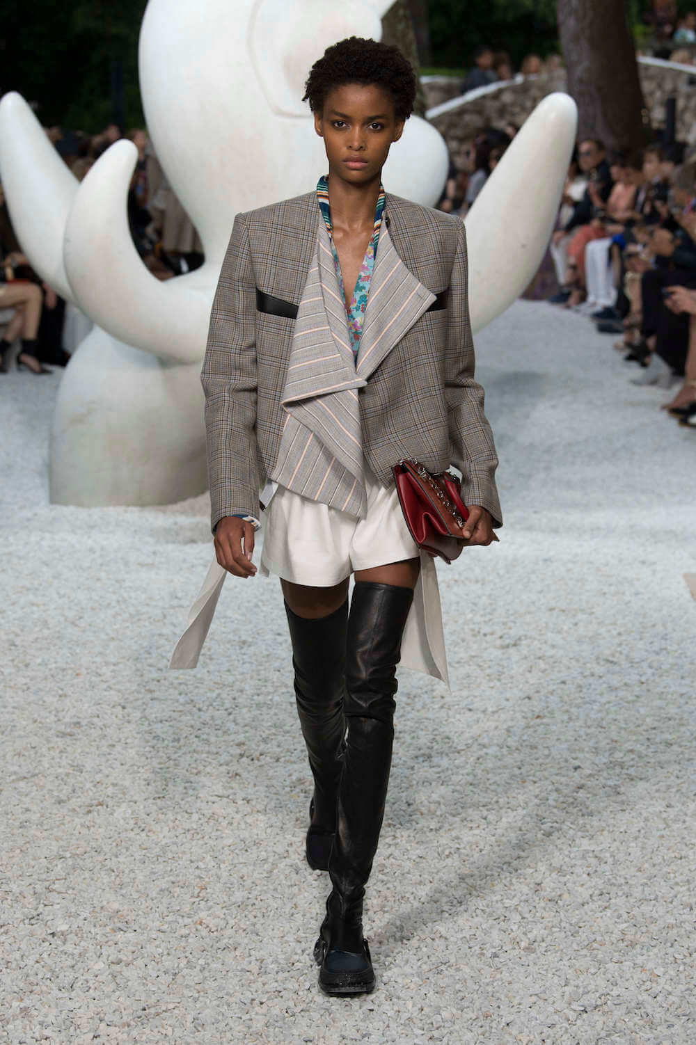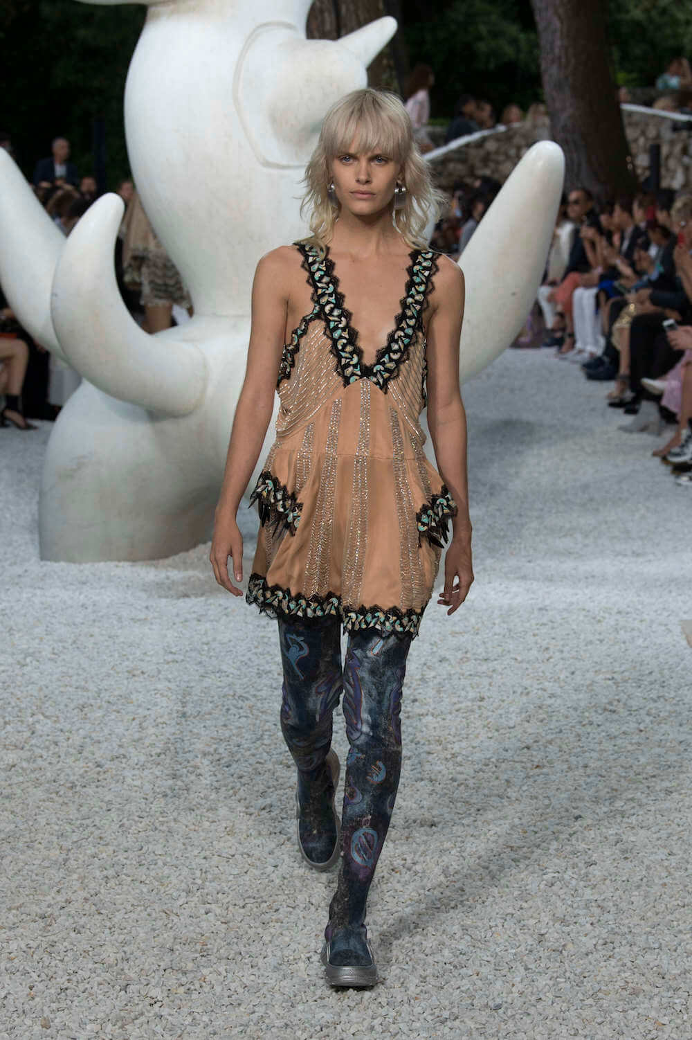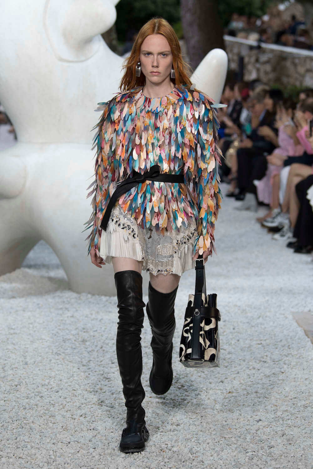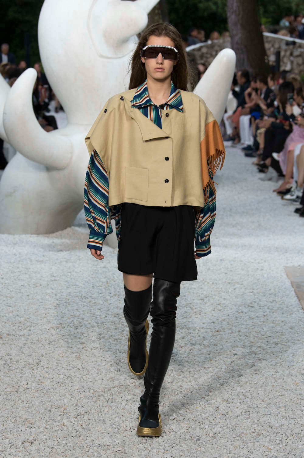 This was the epic tour-de-force fire in Nicolas Ghesquière’s heart, marking a new five year contract at Louis Vuitton. In case you missed the memo last week, Nicolas Ghesquière is #notgoinganywhere. And so we begin this review with a breaking newsworthy collaboration: Louis Vuitton has partnered with Grace Coddington on a capsule collection. Yes, that’s right, her love for cats, that she has always sketched so fabulously, purred on the arms of Ghesquière’s girls as they glided through the grounds of the Foundation Maeght. “I hope it will be a dream come true for Pumpkin, Blanket and Nicolas’ dog – it certainly is for me,” Grace said. “It started with our love for animals, it’s where Nicolas and I really connect beyond fashion.” A connection we are here for. So this was Cruise 2019 and these girls were cruising, their new found territory overlooking the Colline des Gardettes’ hilltop amongst the five elements that Isabelle Maeght said before the show are vegetable, mineral, water, fire and human. Healthy! Yes, it was down to earth, completely grounded in thigh high leather boots that scrunched into solid golden platform sneaker situations leading the way, space walkers. There is always an undercurrent of pretty in Ghesquière’s LV; loose satin shorts were somewhere between boxer and boudoir, giant paillettes flounced like bird feathers on a new-school youthful red carpet, for the next wave of young actors. The purest white pleats sliced sleeves so killer soft with their partners in crime- tough leather panels over shoulders, an armour in full force. Sunglasses were goggle and visor, Princess Anne last week vibes – we knew she was on to something. Each jacket and vest was perfectly sculpted, falling in our direction, the Ghesquière’s effect. It was a fire collection and it all glistened and shined, that Vuitton energy pumping out with the collaboration of the season. Oh how we want a Grace ‘Cat’ Coddington right now. Love partnerships at this clever Vuitton level. Nicolas Ghesquière was right. He’s not going anywhere. Placing order for thigh high sneaker boots now.