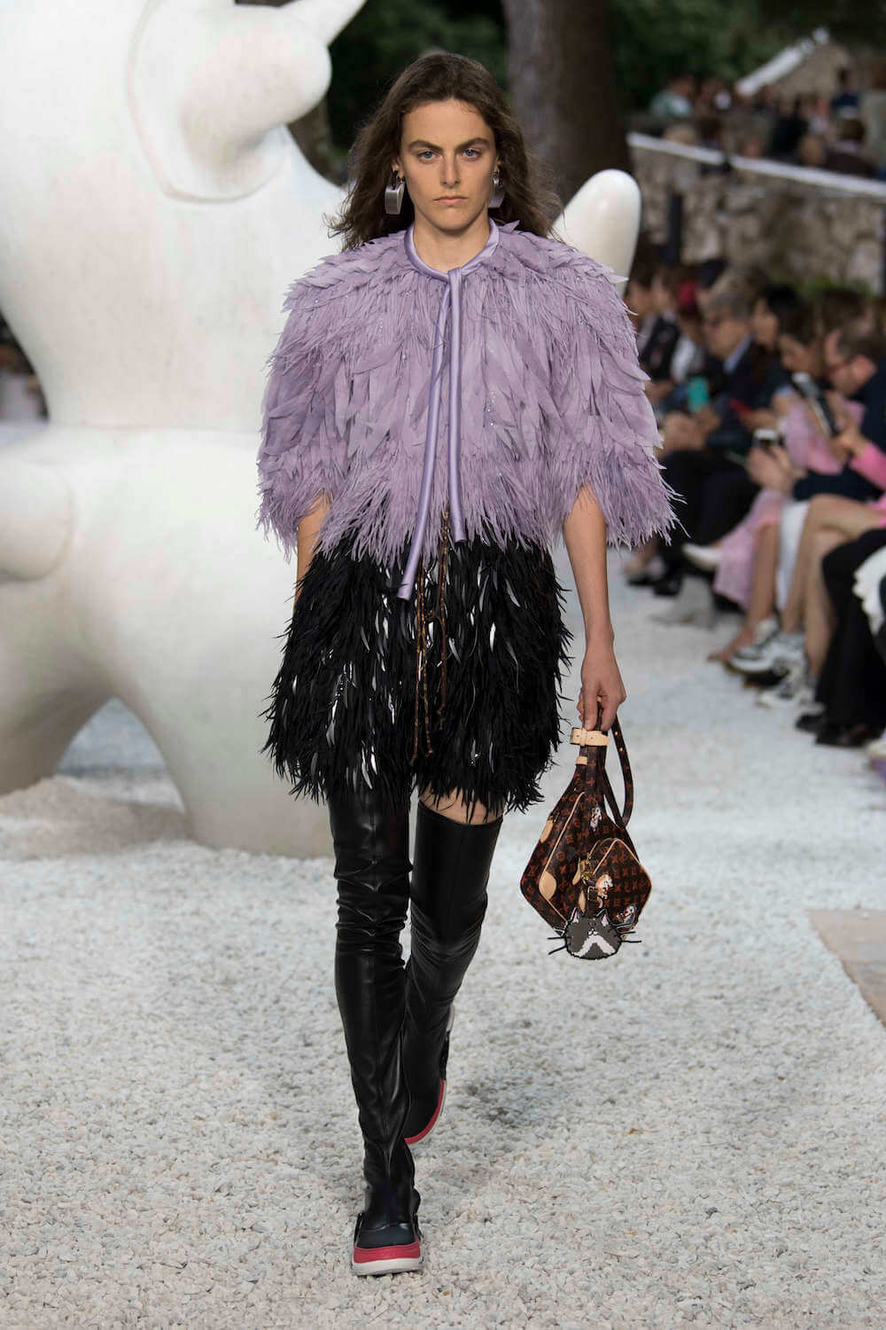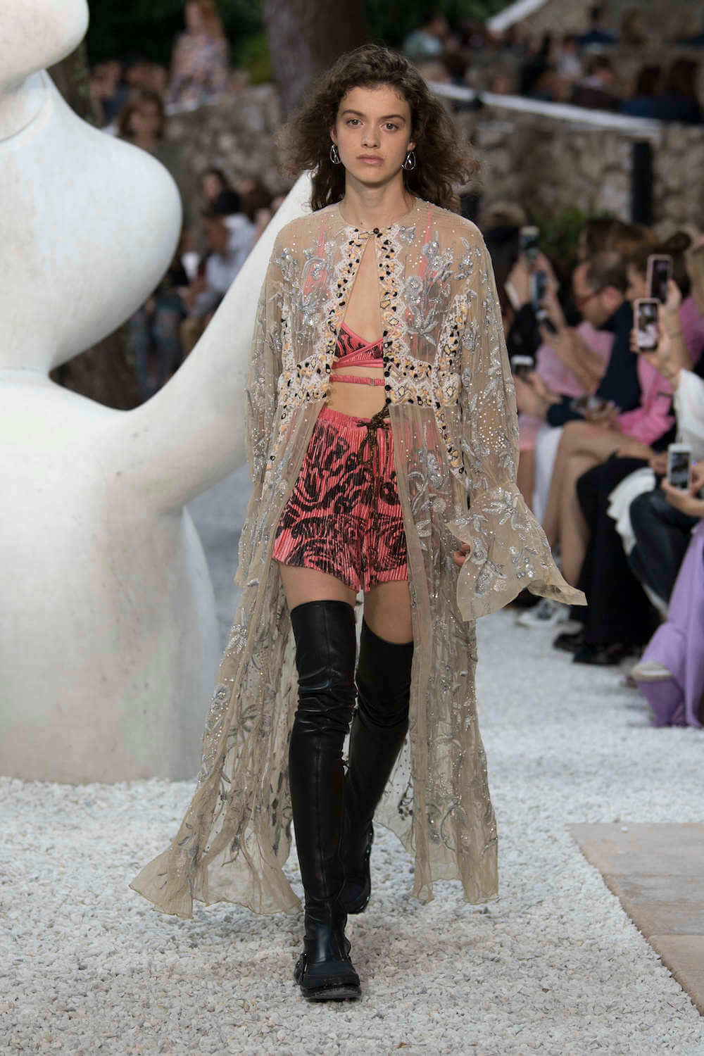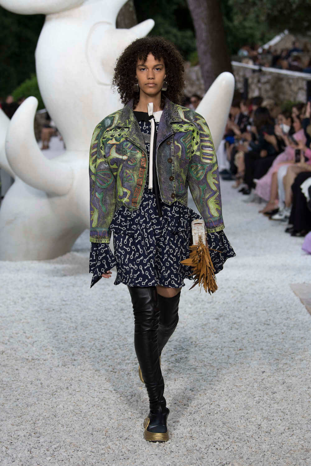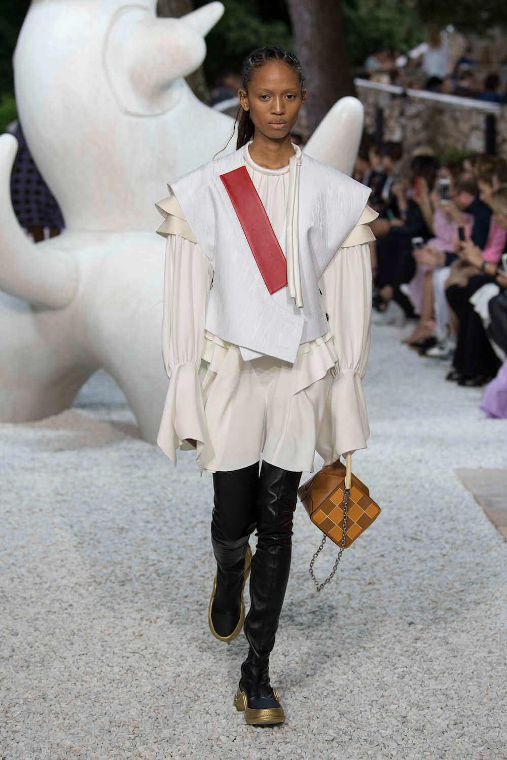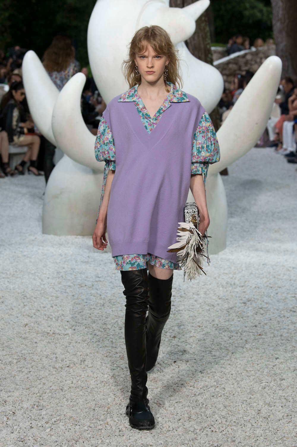 This was the epic tour-de-force fire in Nicolas Ghesquière’s heart, marking a new five year contract at Louis Vuitton. In case you missed the memo last week, Nicolas Ghesquière is #notgoinganywhere. And so we begin this review with a breaking newsworthy collaboration: Louis Vuitton has partnered with Grace Coddington on a capsule collection. Yes, that’s right, her love for cats, that she has always sketched so fabulously, purred on the arms of Ghesquière’s girls as they glided through the grounds of the Foundation Maeght. “I hope it will be a dream come true for Pumpkin, Blanket and Nicolas’ dog – it certainly is for me,” Grace said. “It started with our love for animals, it’s where Nicolas and I really connect beyond fashion.” A connection we are here for. So this was Cruise 2019 and these girls were cruising, their new found territory overlooking the Colline des Gardettes’ hilltop amongst the five elements that Isabelle Maeght said before the show are vegetable, mineral, water, fire and human. Healthy! Yes, it was down to earth, completely grounded in thigh high leather boots that scrunched into solid golden platform sneaker situations leading the way, space walkers. There is always an undercurrent of pretty in Ghesquière’s LV; loose satin shorts were somewhere between boxer and boudoir, giant paillettes flounced like bird feathers on a new-school youthful red carpet, for the next wave of young actors. The purest white pleats sliced sleeves so killer soft with their partners in crime- tough leather panels over shoulders, an armour in full force. Sunglasses were goggle and visor, Princess Anne last week vibes – we knew she was on to something. Each jacket and vest was perfectly sculpted, falling in our direction, the Ghesquière’s effect. It was a fire collection and it all glistened and shined, that Vuitton energy pumping out with the collaboration of the season. Oh how we want a Grace ‘Cat’ Coddington right now. Love partnerships at this clever Vuitton level. Nicolas Ghesquière was right. He’s not going anywhere. Placing order for thigh high sneaker boots now.