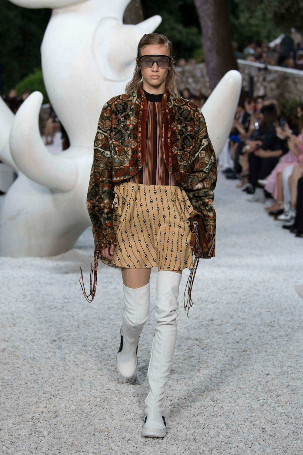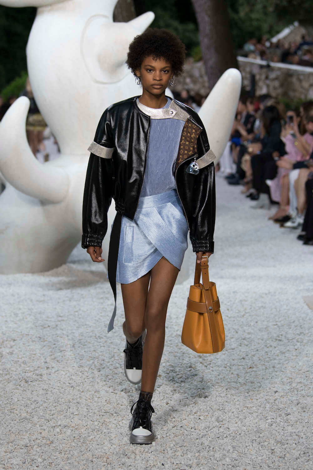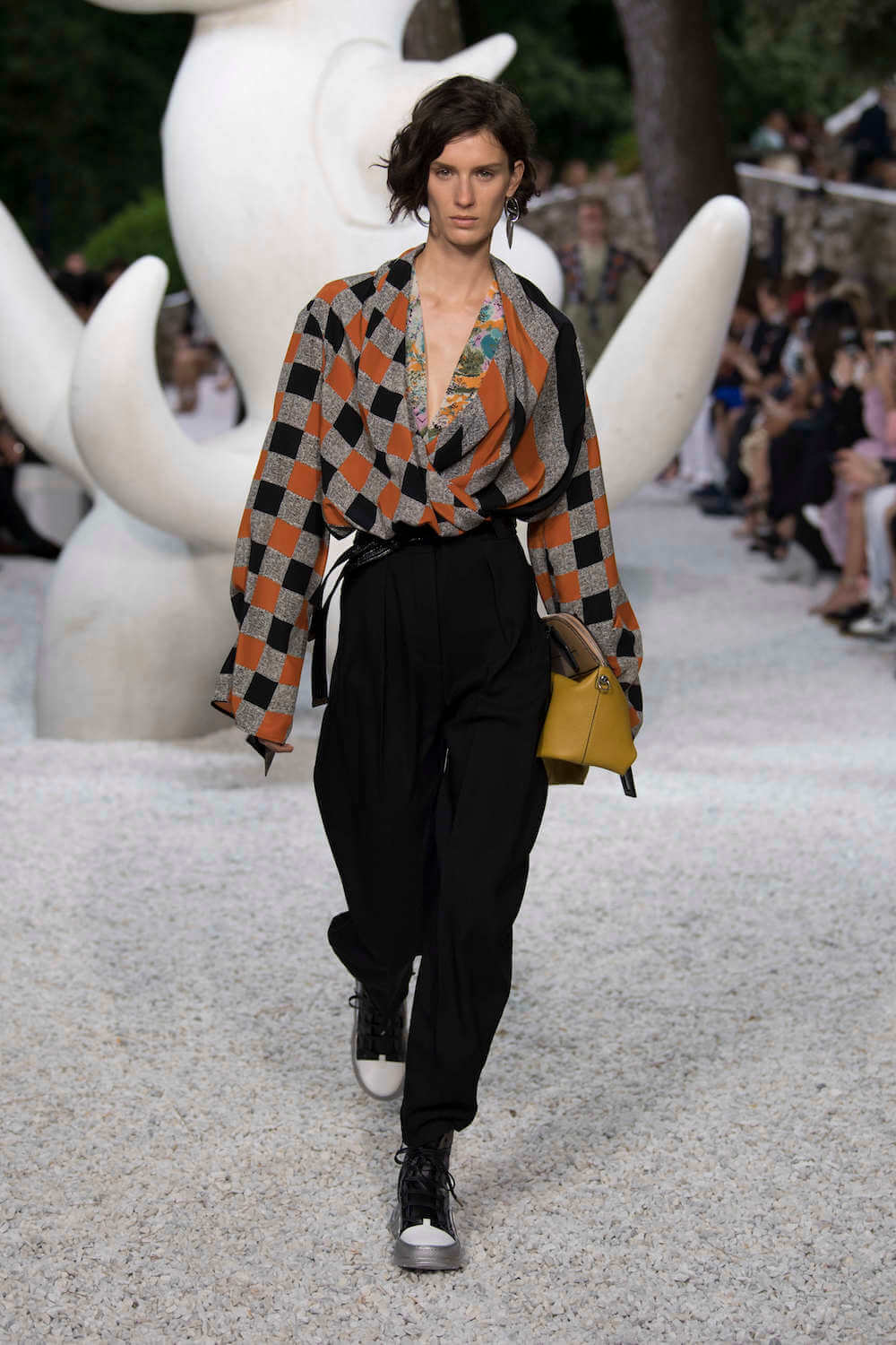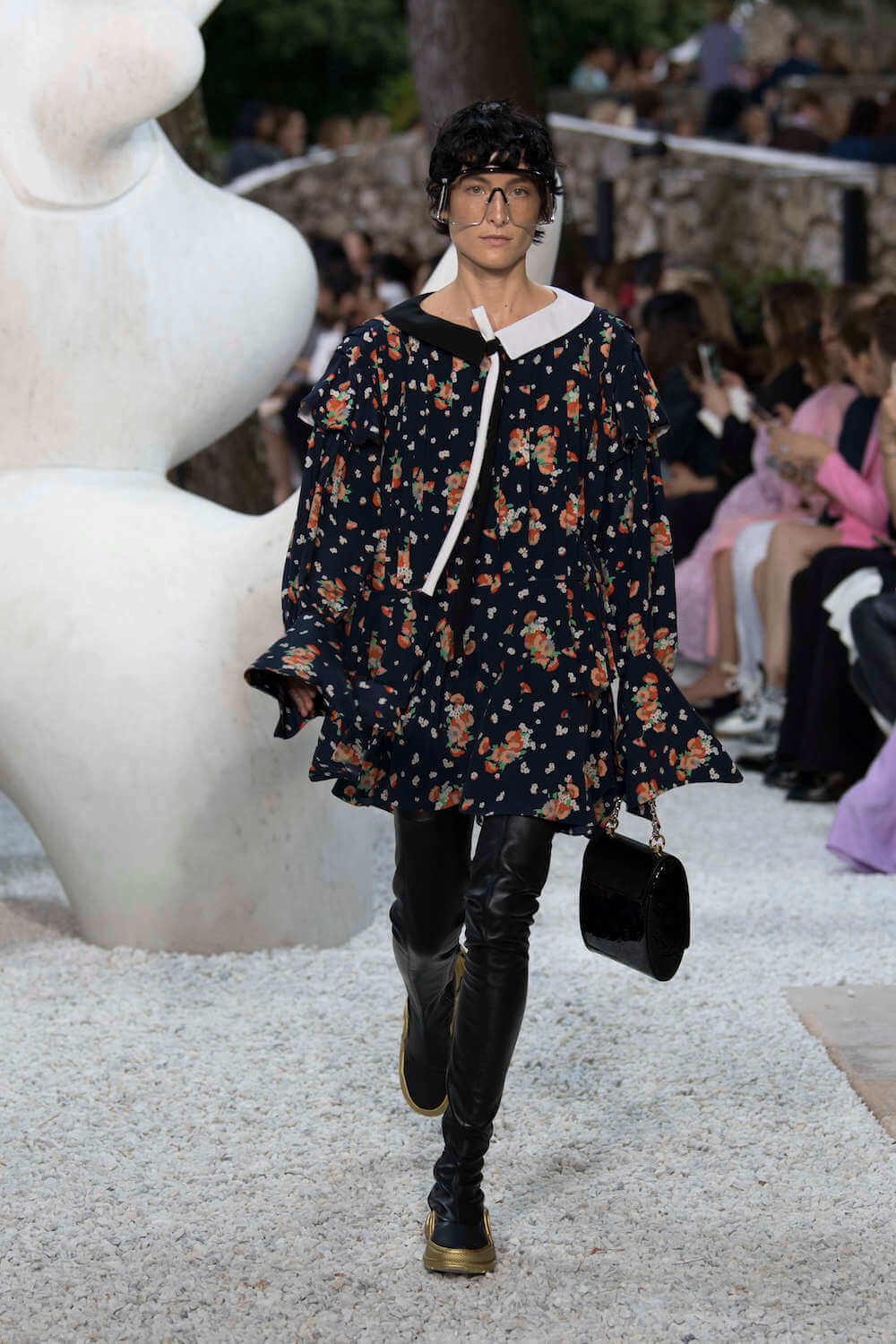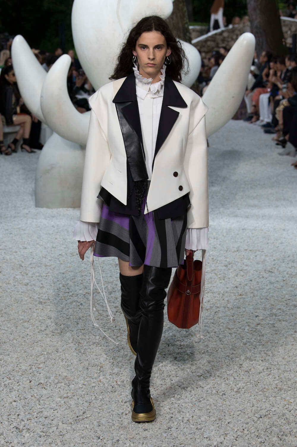 This was the epic tour-de-force fire in Nicolas Ghesquière’s heart, marking a new five year contract at Louis Vuitton. In case you missed the memo last week, Nicolas Ghesquière is #notgoinganywhere. And so we begin this review with a breaking newsworthy collaboration: Louis Vuitton has partnered with Grace Coddington on a capsule collection. Yes, that’s right, her love for cats, that she has always sketched so fabulously, purred on the arms of Ghesquière’s girls as they glided through the grounds of the Foundation Maeght. “I hope it will be a dream come true for Pumpkin, Blanket and Nicolas’ dog – it certainly is for me,” Grace said. “It started with our love for animals, it’s where Nicolas and I really connect beyond fashion.” A connection we are here for. So this was Cruise 2019 and these girls were cruising, their new found territory overlooking the Colline des Gardettes’ hilltop amongst the five elements that Isabelle Maeght said before the show are vegetable, mineral, water, fire and human. Healthy! Yes, it was down to earth, completely grounded in thigh high leather boots that scrunched into solid golden platform sneaker situations leading the way, space walkers. There is always an undercurrent of pretty in Ghesquière’s LV; loose satin shorts were somewhere between boxer and boudoir, giant paillettes flounced like bird feathers on a new-school youthful red carpet, for the next wave of young actors. The purest white pleats sliced sleeves so killer soft with their partners in crime- tough leather panels over shoulders, an armour in full force. Sunglasses were goggle and visor, Princess Anne last week vibes – we knew she was on to something. Each jacket and vest was perfectly sculpted, falling in our direction, the Ghesquière’s effect. It was a fire collection and it all glistened and shined, that Vuitton energy pumping out with the collaboration of the season. Oh how we want a Grace ‘Cat’ Coddington right now. Love partnerships at this clever Vuitton level. Nicolas Ghesquière was right. He’s not going anywhere. Placing order for thigh high sneaker boots now.