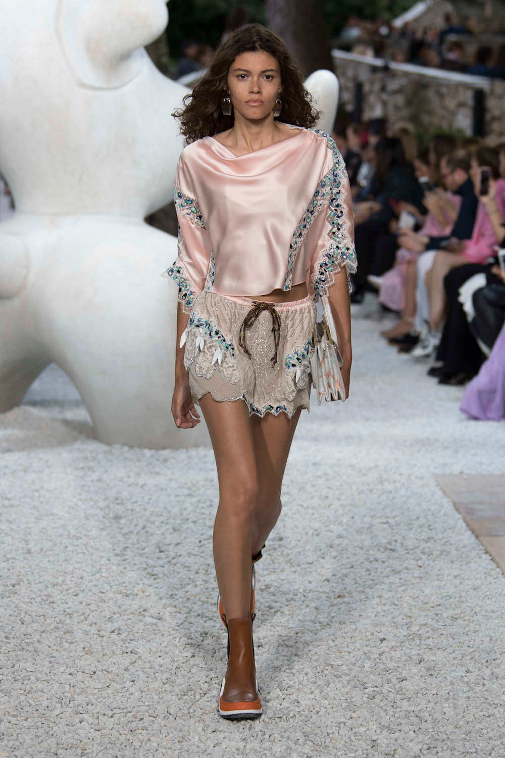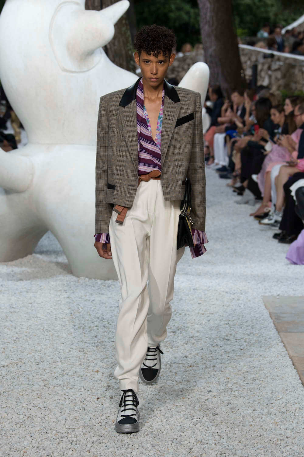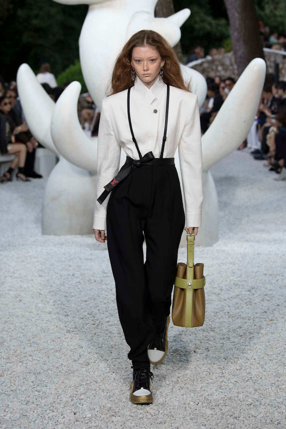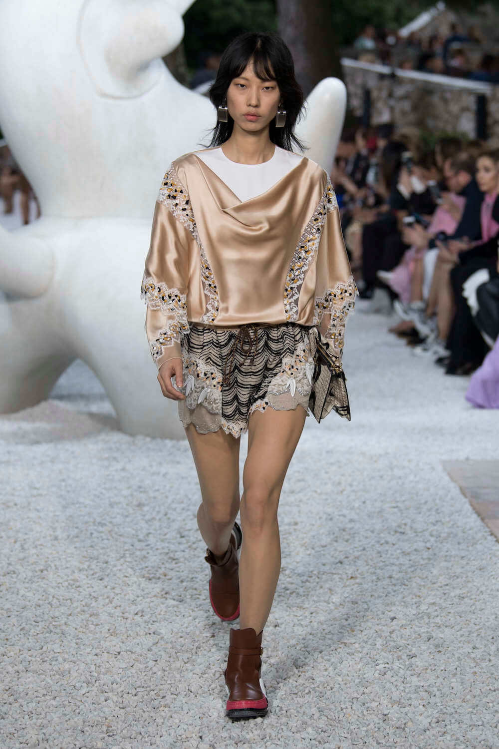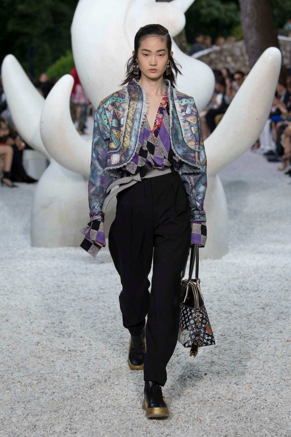This was the epic tour-de-force fire in Nicolas Ghesquière’s heart, marking a new five year contract at Louis Vuitton. In case you missed the memo last week, Nicolas Ghesquière is #notgoinganywhere. And so we begin this review with a breaking newsworthy collaboration: Louis Vuitton has partnered with Grace Coddington on a capsule collection. Yes, that’s right, her love for cats, that she has always sketched so fabulously, purred on the arms of Ghesquière’s girls as they glided through the grounds of the Foundation Maeght. “I hope it will be a dream come true for Pumpkin, Blanket and Nicolas’ dog – it certainly is for me,” Grace said. “It started with our love for animals, it’s where Nicolas and I really connect beyond fashion.” A connection we are here for. So this was Cruise 2019 and these girls were cruising, their new found territory overlooking the Colline des Gardettes’ hilltop amongst the five elements that Isabelle Maeght said before the show are vegetable, mineral, water, fire and human. Healthy! Yes, it was down to earth, completely grounded in thigh high leather boots that scrunched into solid golden platform sneaker situations leading the way, space walkers. There is always an undercurrent of pretty in Ghesquière’s LV; loose satin shorts were somewhere between boxer and boudoir, giant paillettes flounced like bird feathers on a new-school youthful red carpet, for the next wave of young actors. The purest white pleats sliced sleeves so killer soft with their partners in crime- tough leather panels over shoulders, an armour in full force. Sunglasses were goggle and visor, Princess Anne last week vibes – we knew she was on to something. Each jacket and vest was perfectly sculpted, falling in our direction, the Ghesquière’s effect. It was a fire collection and it all glistened and shined, that Vuitton energy pumping out with the collaboration of the season. Oh how we want a Grace ‘Cat’ Coddington right now. Love partnerships at this clever Vuitton level. Nicolas Ghesquière was right. He’s not going anywhere. Placing order for thigh high sneaker boots now.