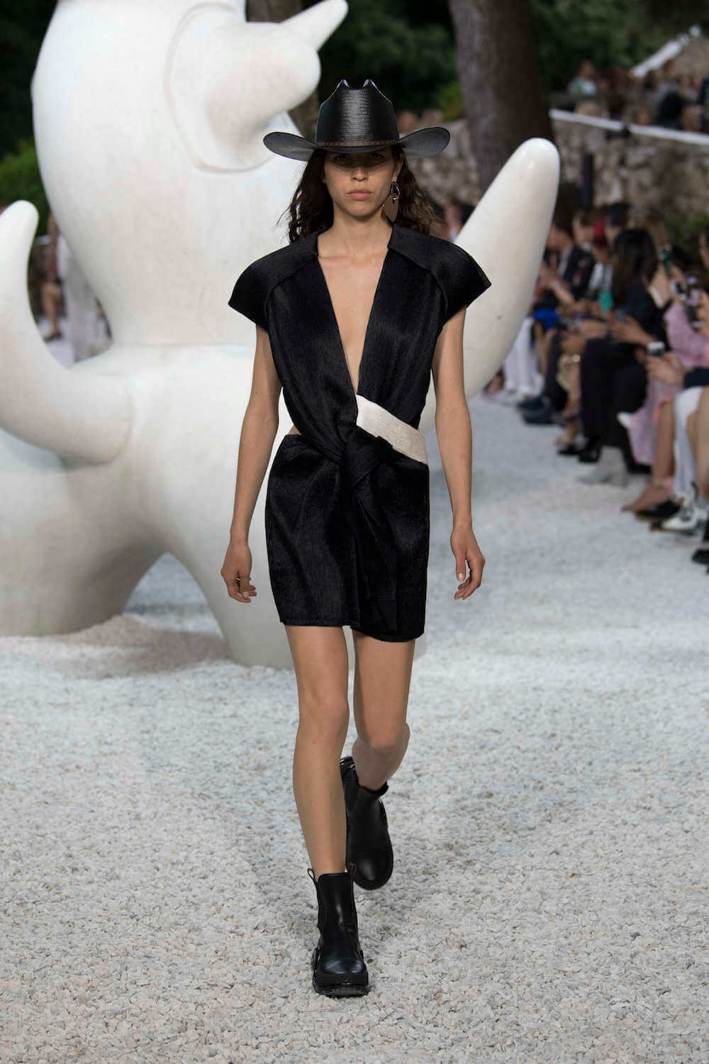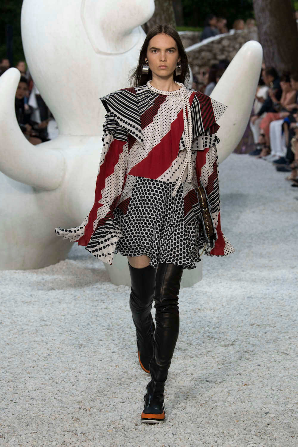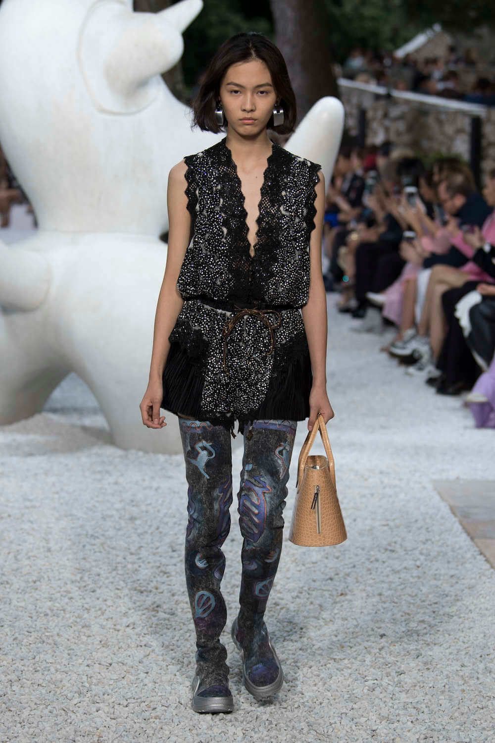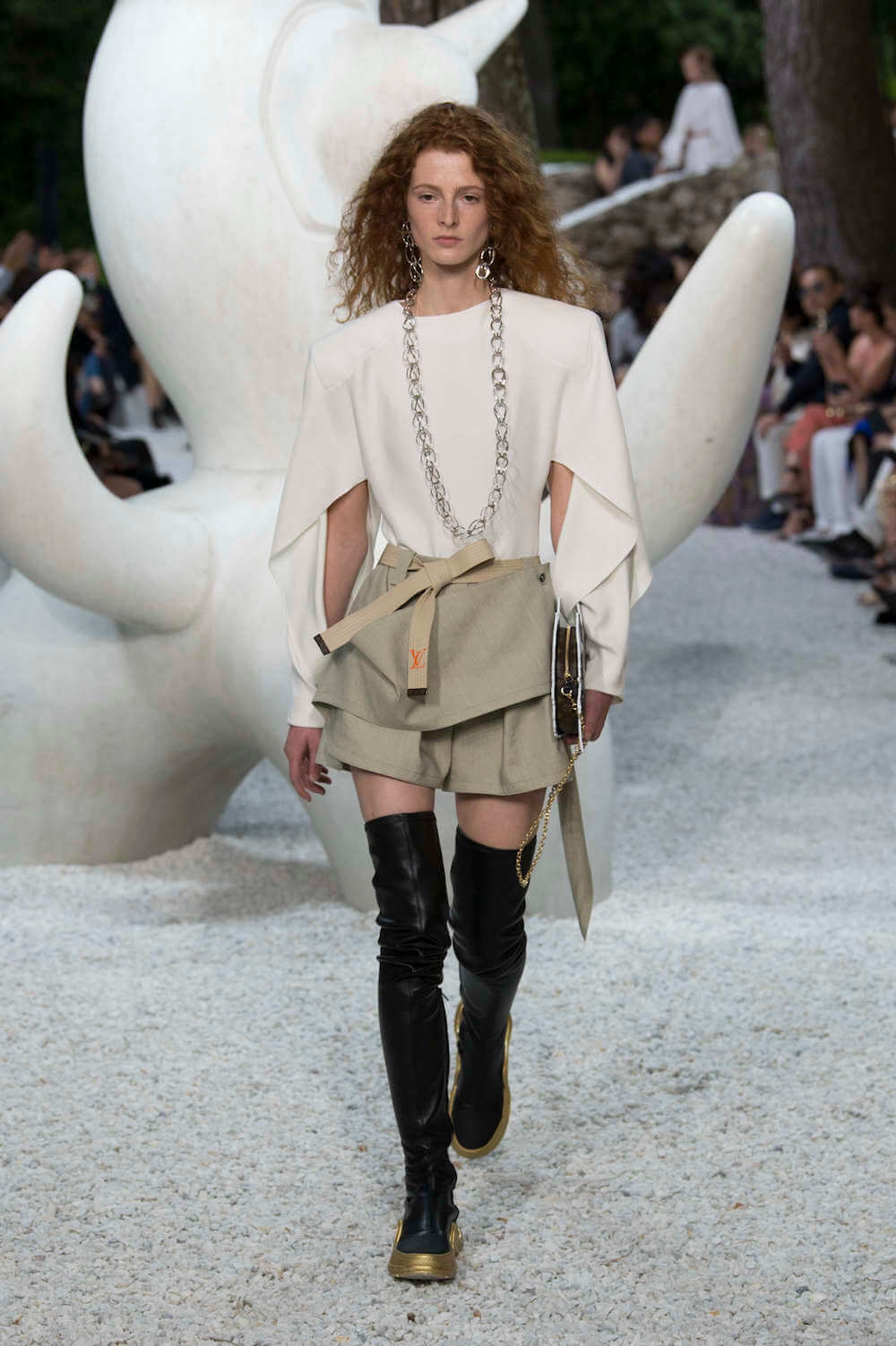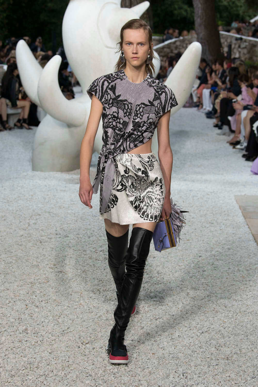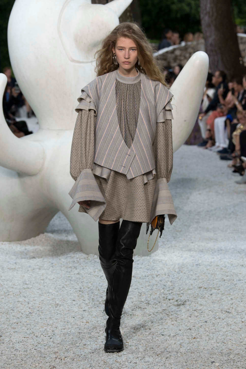 This was the epic tour-de-force fire in Nicolas Ghesquière’s heart, marking a new five year contract at Louis Vuitton. In case you missed the memo last week, Nicolas Ghesquière is #notgoinganywhere. And so we begin this review with a breaking newsworthy collaboration: Louis Vuitton has partnered with Grace Coddington on a capsule collection. Yes, that’s right, her love for cats, that she has always sketched so fabulously, purred on the arms of Ghesquière’s girls as they glided through the grounds of the Foundation Maeght. “I hope it will be a dream come true for Pumpkin, Blanket and Nicolas’ dog – it certainly is for me,” Grace said. “It started with our love for animals, it’s where Nicolas and I really connect beyond fashion.” A connection we are here for. So this was Cruise 2019 and these girls were cruising, their new found territory overlooking the Colline des Gardettes’ hilltop amongst the five elements that Isabelle Maeght said before the show are vegetable, mineral, water, fire and human. Healthy! Yes, it was down to earth, completely grounded in thigh high leather boots that scrunched into solid golden platform sneaker situations leading the way, space walkers. There is always an undercurrent of pretty in Ghesquière’s LV; loose satin shorts were somewhere between boxer and boudoir, giant paillettes flounced like bird feathers on a new-school youthful red carpet, for the next wave of young actors. The purest white pleats sliced sleeves so killer soft with their partners in crime- tough leather panels over shoulders, an armour in full force. Sunglasses were goggle and visor, Princess Anne last week vibes – we knew she was on to something. Each jacket and vest was perfectly sculpted, falling in our direction, the Ghesquière’s effect. It was a fire collection and it all glistened and shined, that Vuitton energy pumping out with the collaboration of the season. Oh how we want a Grace ‘Cat’ Coddington right now. Love partnerships at this clever Vuitton level. Nicolas Ghesquière was right. He’s not going anywhere. Placing order for thigh high sneaker boots now.
