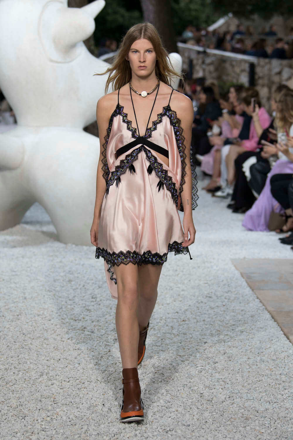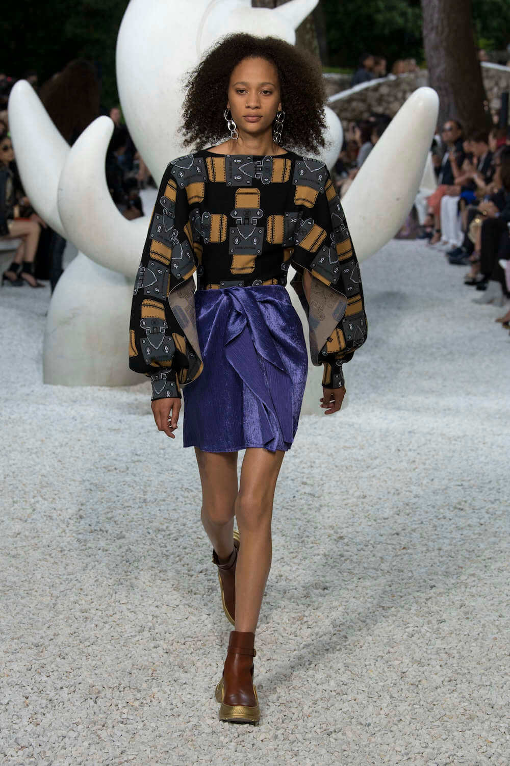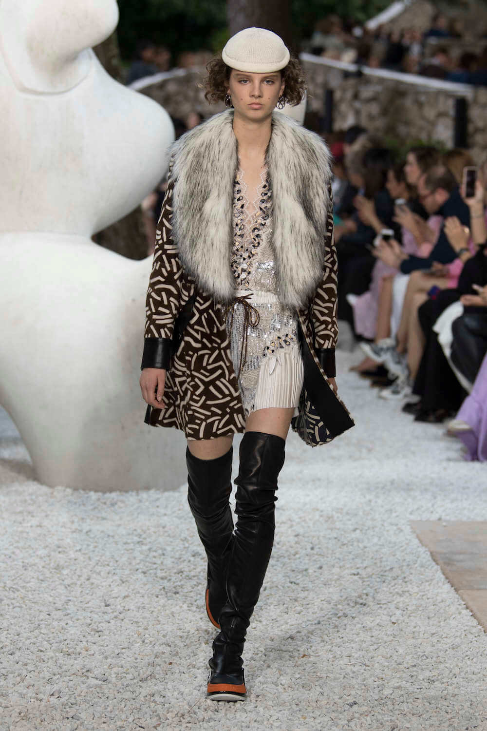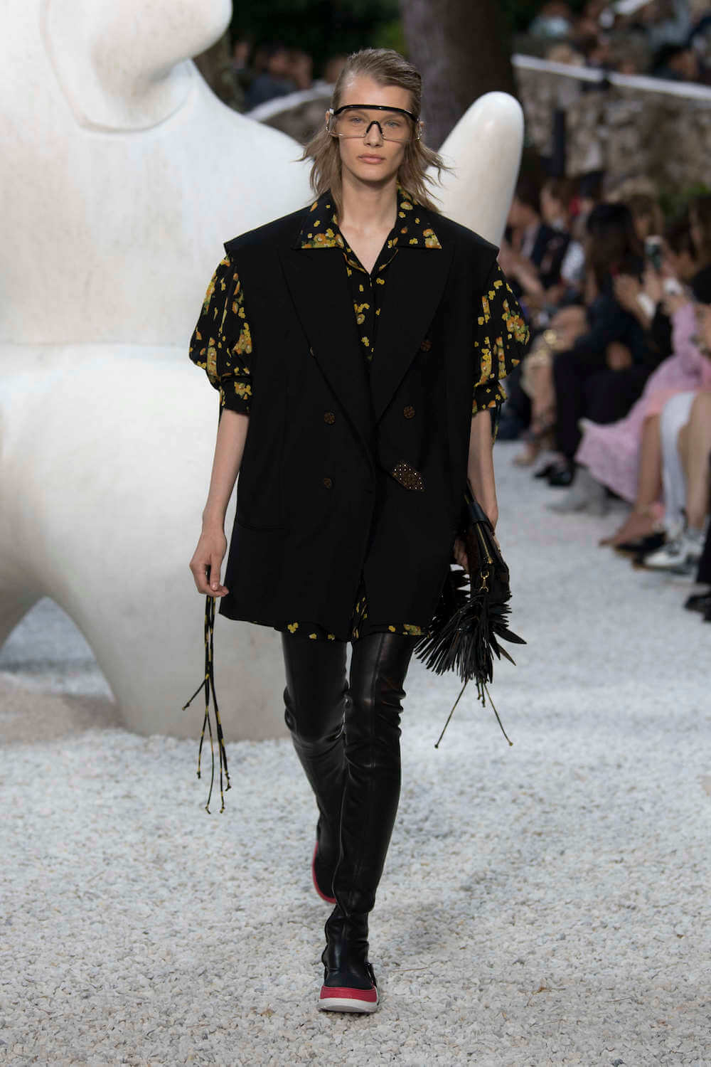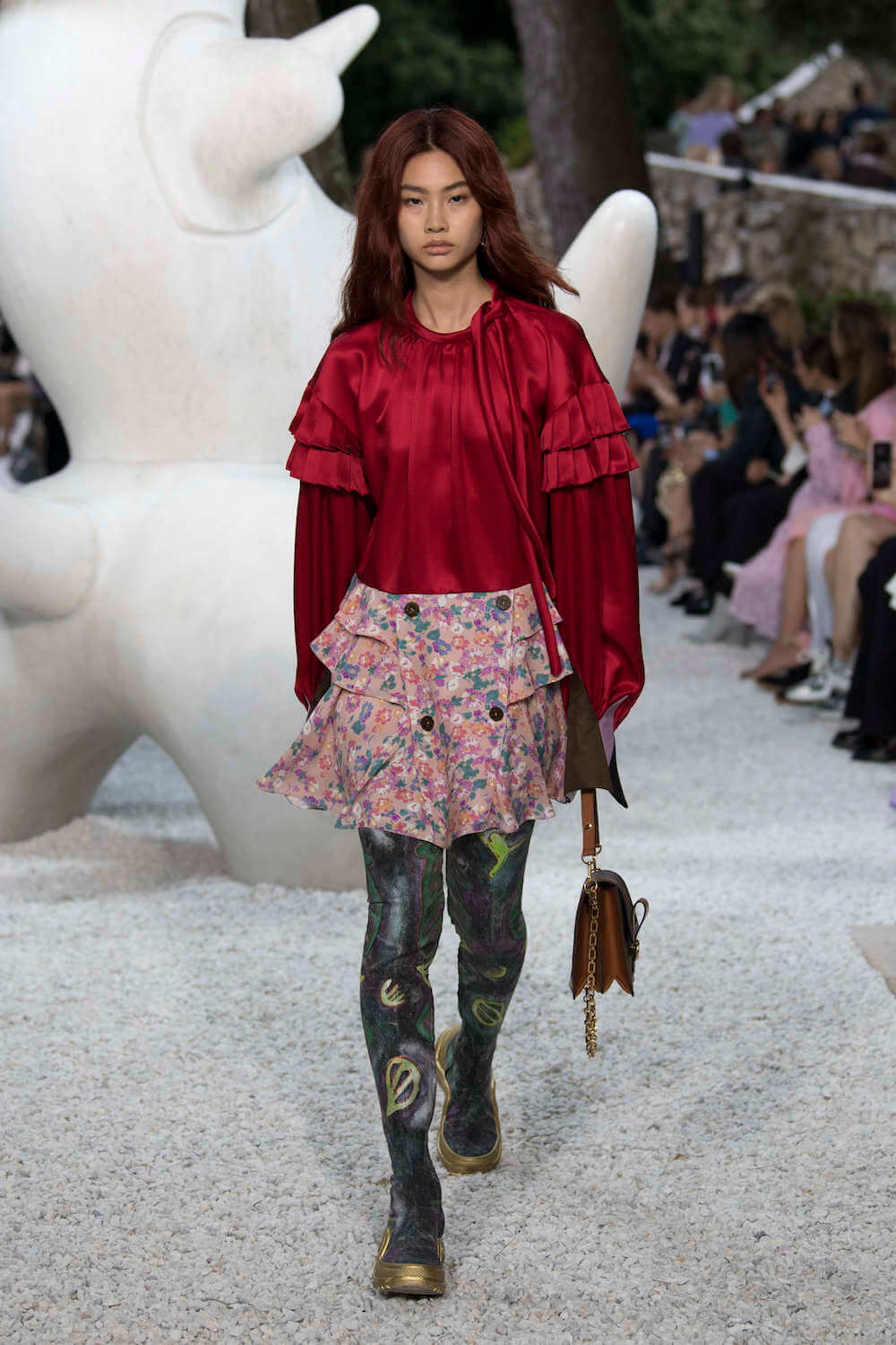 This was the epic tour-de-force fire in Nicolas Ghesquière’s heart, marking a new five year contract at Louis Vuitton. In case you missed the memo last week, Nicolas Ghesquière is #notgoinganywhere. And so we begin this review with a breaking newsworthy collaboration: Louis Vuitton has partnered with Grace Coddington on a capsule collection. Yes, that’s right, her love for cats, that she has always sketched so fabulously, purred on the arms of Ghesquière’s girls as they glided through the grounds of the Foundation Maeght. “I hope it will be a dream come true for Pumpkin, Blanket and Nicolas’ dog – it certainly is for me,” Grace said. “It started with our love for animals, it’s where Nicolas and I really connect beyond fashion.” A connection we are here for. So this was Cruise 2019 and these girls were cruising, their new found territory overlooking the Colline des Gardettes’ hilltop amongst the five elements that Isabelle Maeght said before the show are vegetable, mineral, water, fire and human. Healthy! Yes, it was down to earth, completely grounded in thigh high leather boots that scrunched into solid golden platform sneaker situations leading the way, space walkers. There is always an undercurrent of pretty in Ghesquière’s LV; loose satin shorts were somewhere between boxer and boudoir, giant paillettes flounced like bird feathers on a new-school youthful red carpet, for the next wave of young actors. The purest white pleats sliced sleeves so killer soft with their partners in crime- tough leather panels over shoulders, an armour in full force. Sunglasses were goggle and visor, Princess Anne last week vibes – we knew she was on to something. Each jacket and vest was perfectly sculpted, falling in our direction, the Ghesquière’s effect. It was a fire collection and it all glistened and shined, that Vuitton energy pumping out with the collaboration of the season. Oh how we want a Grace ‘Cat’ Coddington right now. Love partnerships at this clever Vuitton level. Nicolas Ghesquière was right. He’s not going anywhere. Placing order for thigh high sneaker boots now.
