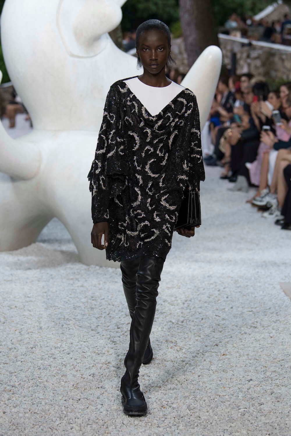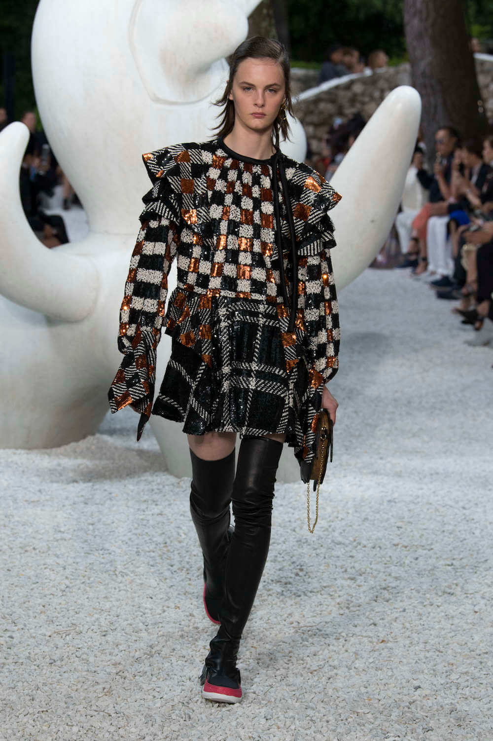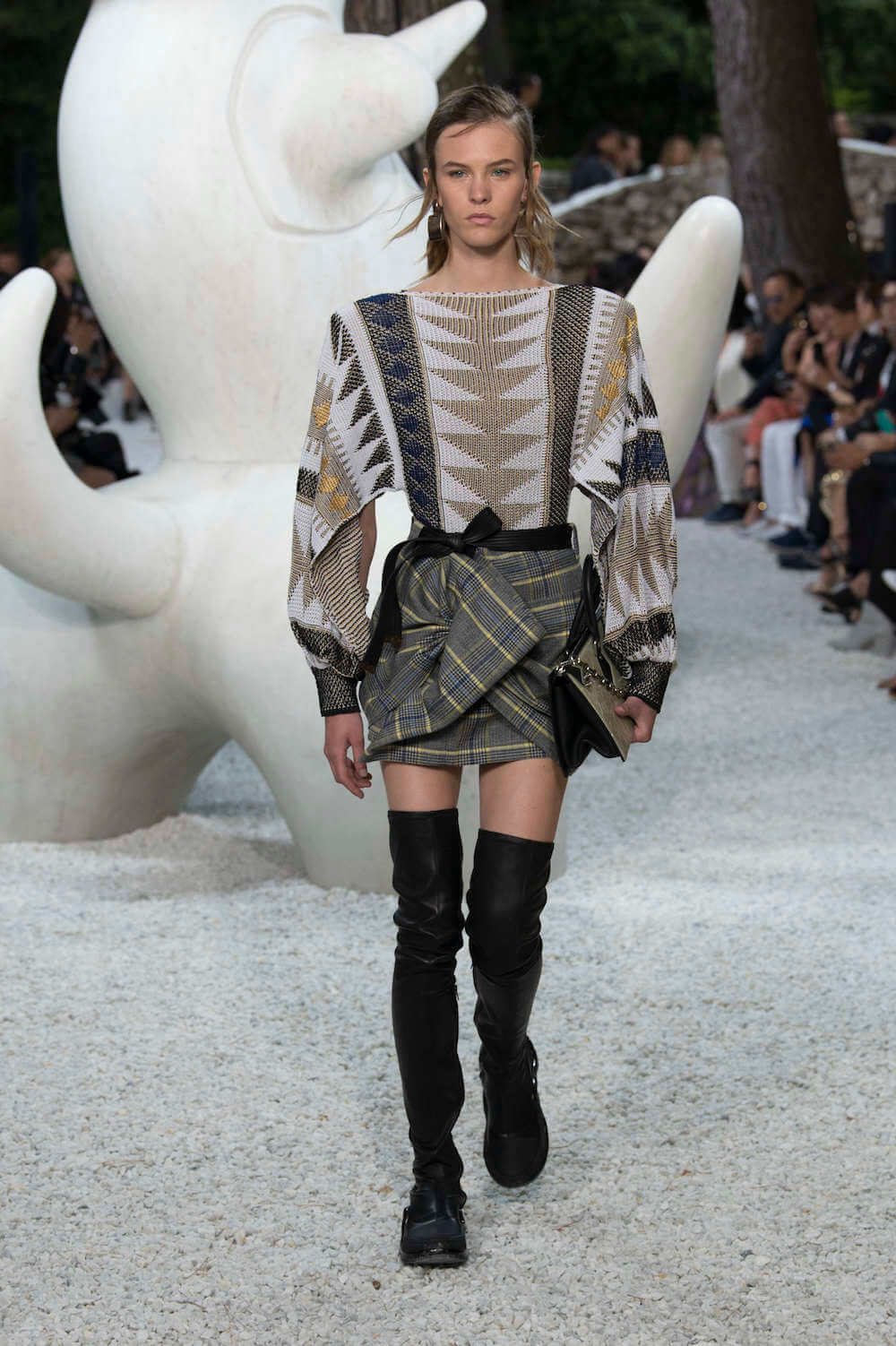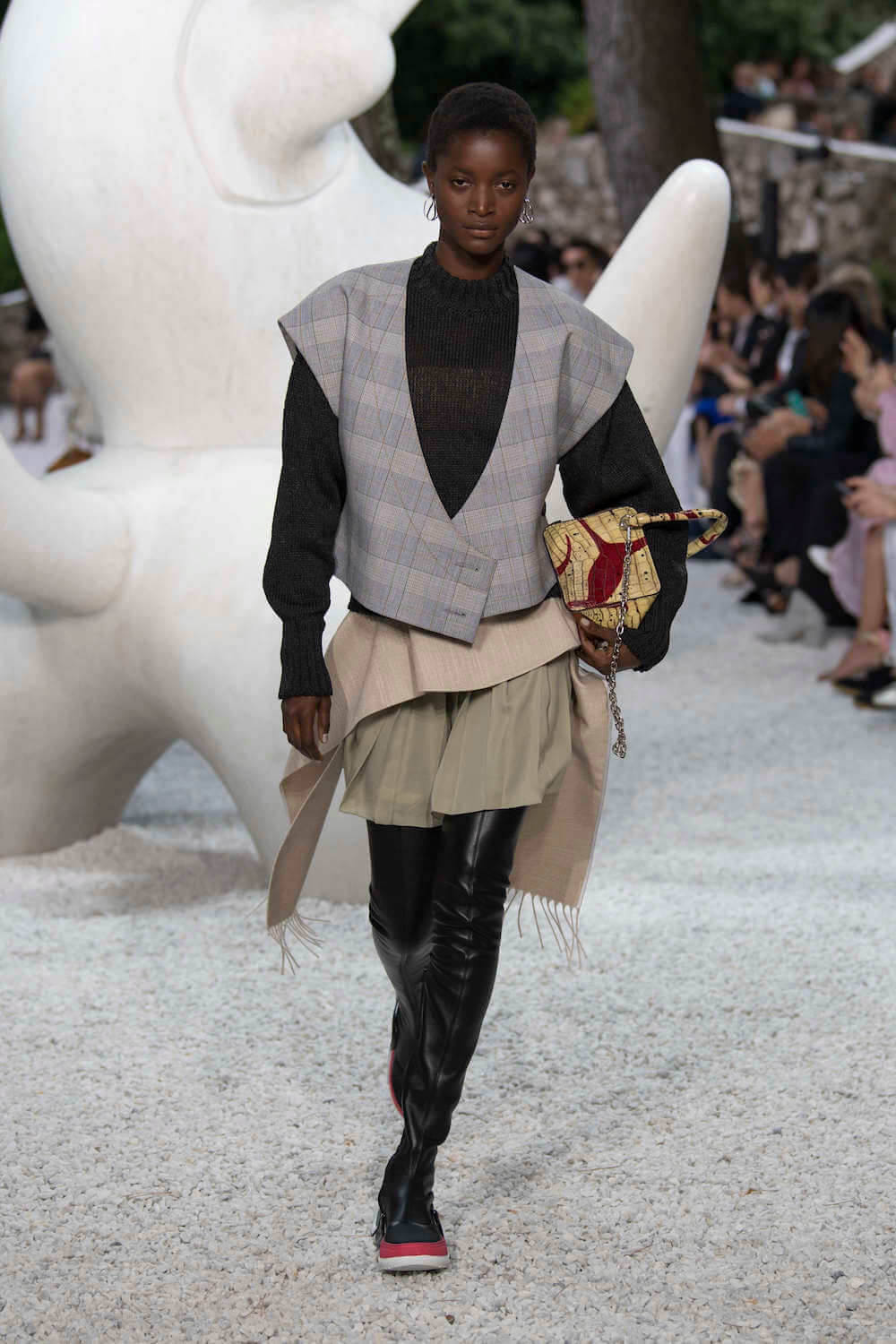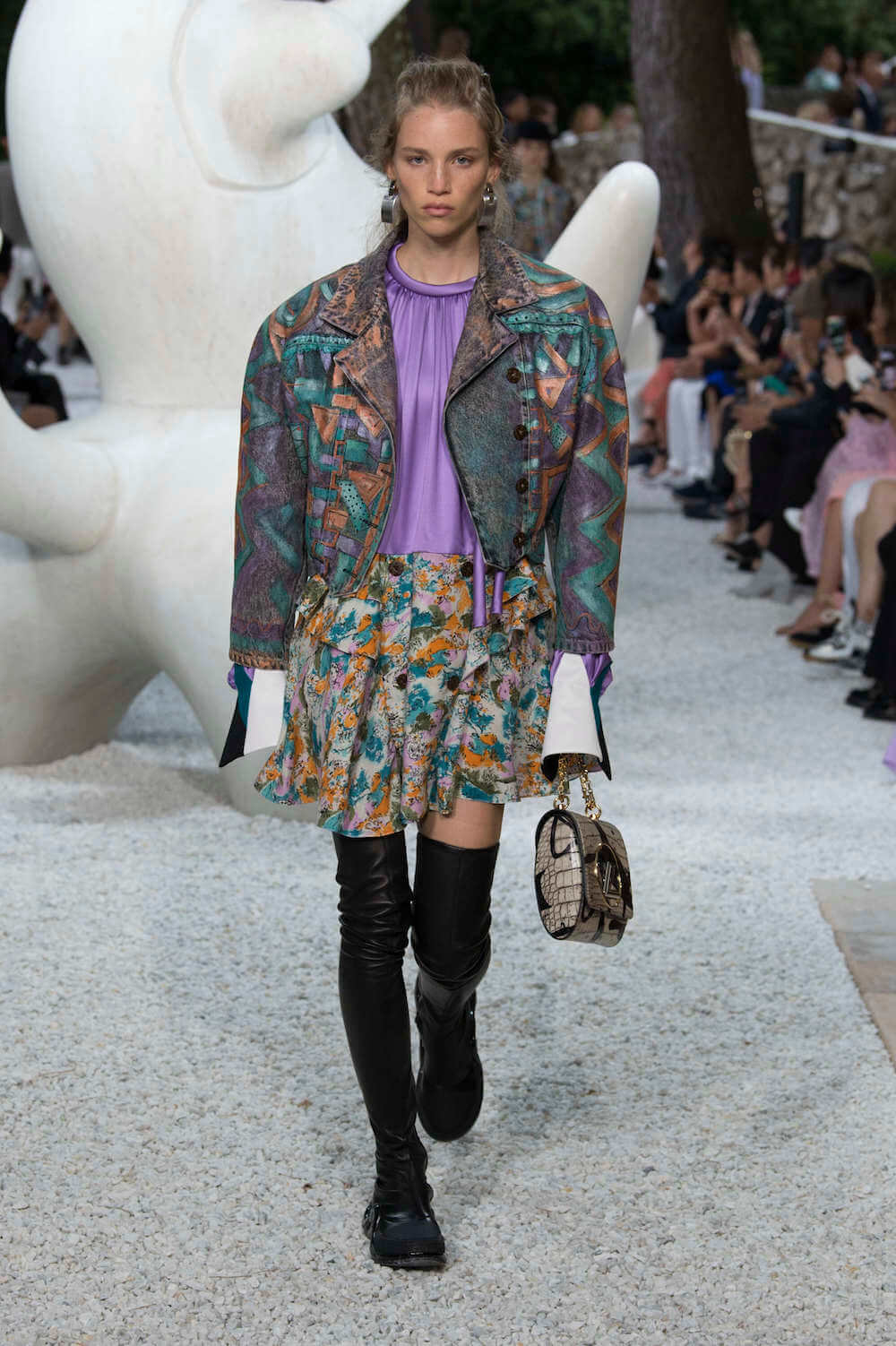 This was the epic tour-de-force fire in Nicolas Ghesquière’s heart, marking a new five year contract at Louis Vuitton. In case you missed the memo last week, Nicolas Ghesquière is #notgoinganywhere. And so we begin this review with a breaking newsworthy collaboration: Louis Vuitton has partnered with Grace Coddington on a capsule collection. Yes, that’s right, her love for cats, that she has always sketched so fabulously, purred on the arms of Ghesquière’s girls as they glided through the grounds of the Foundation Maeght. “I hope it will be a dream come true for Pumpkin, Blanket and Nicolas’ dog – it certainly is for me,” Grace said. “It started with our love for animals, it’s where Nicolas and I really connect beyond fashion.” A connection we are here for. So this was Cruise 2019 and these girls were cruising, their new found territory overlooking the Colline des Gardettes’ hilltop amongst the five elements that Isabelle Maeght said before the show are vegetable, mineral, water, fire and human. Healthy! Yes, it was down to earth, completely grounded in thigh high leather boots that scrunched into solid golden platform sneaker situations leading the way, space walkers. There is always an undercurrent of pretty in Ghesquière’s LV; loose satin shorts were somewhere between boxer and boudoir, giant paillettes flounced like bird feathers on a new-school youthful red carpet, for the next wave of young actors. The purest white pleats sliced sleeves so killer soft with their partners in crime- tough leather panels over shoulders, an armour in full force. Sunglasses were goggle and visor, Princess Anne last week vibes – we knew she was on to something. Each jacket and vest was perfectly sculpted, falling in our direction, the Ghesquière’s effect. It was a fire collection and it all glistened and shined, that Vuitton energy pumping out with the collaboration of the season. Oh how we want a Grace ‘Cat’ Coddington right now. Love partnerships at this clever Vuitton level. Nicolas Ghesquière was right. He’s not going anywhere. Placing order for thigh high sneaker boots now.