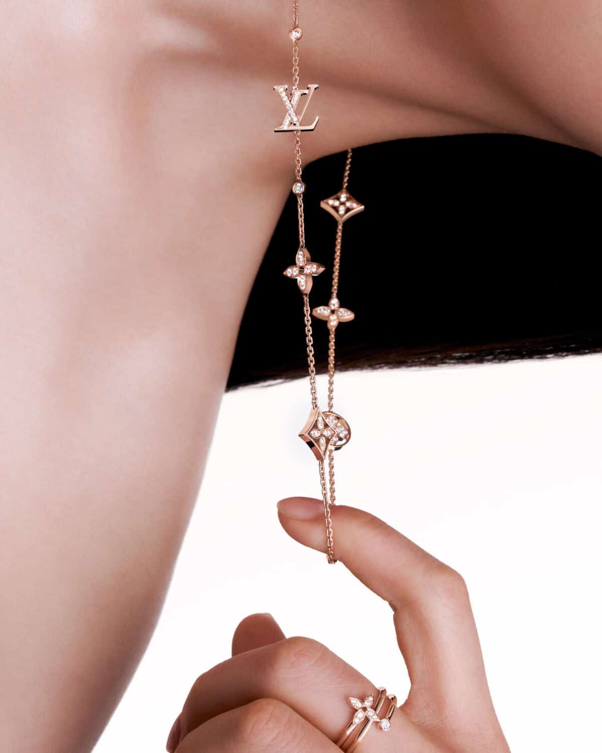 Featuring two elegant necklaces, three bracelets and one ring, the silhouettes are simple and refined, with the monogram appearing in both rounded and angular forms on thin, expertly crafted chains. Understated and delicate, the pieces have been created using the finest pink and white gold, with a light pepper of perfectly placed, bezel-cut diamonds across each one. Embracing the same timeless style that has solidified the original collection as a beloved classic, these new Idylle Blossom additions are exquisite examples of Louis Vuitton’s undeniable savoir faire.