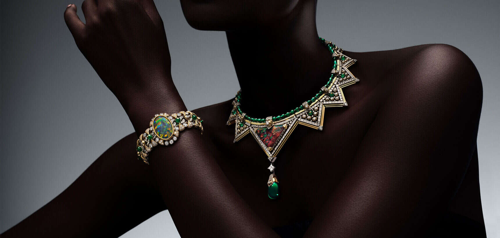 It begins in The World of Mastery, where Louis Vuitton’s impeccable craftsmanship takes centre stage. Here, the Savoir necklace, featuring a hypnotic 30.56k Australian black opal, sets the tone with its sharp geometric shapes and meticulous emerald beadwork that nod to the brand’s trunk-making heritage. From there, the collection deepens with themes of guardianship – Protection offers an ethereal choker featuring a 3.02k pearl drop, while Keeper incorporates the all-seeing eye and a captivating 32.85k Sri Lankan chrysoberyl.