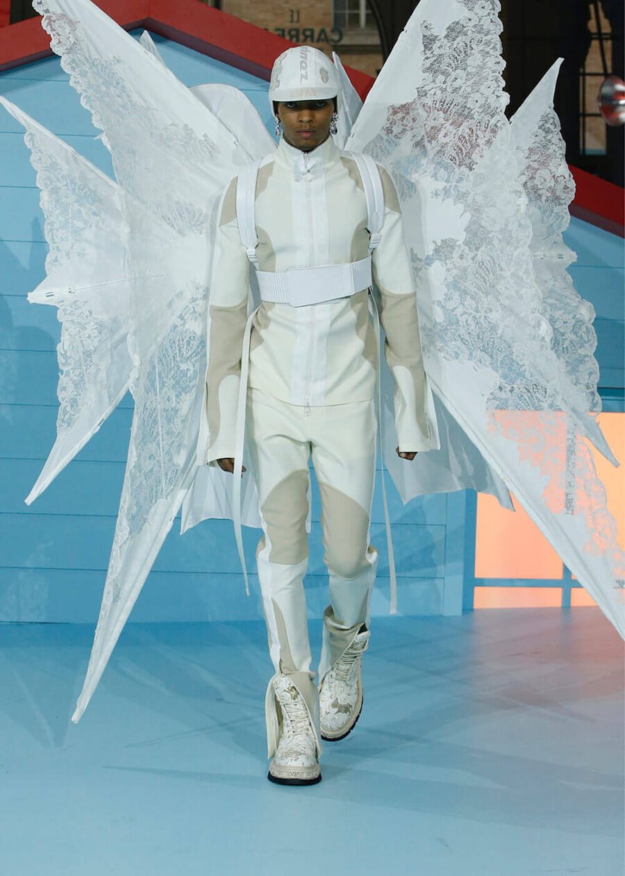 Abloh’s signature theme of boyhood was once again expressed. He saw it as a playful, graceful state, where the imagination is given the freedom to soar and the possibilities are limitless. The idea was encapsulated by the dancers who opened the show, elegantly falling off the rooftops onto hidden trampolines before bouncing back into place.