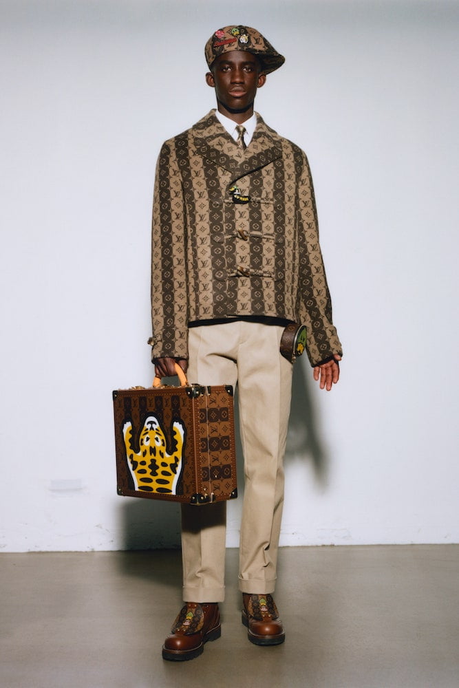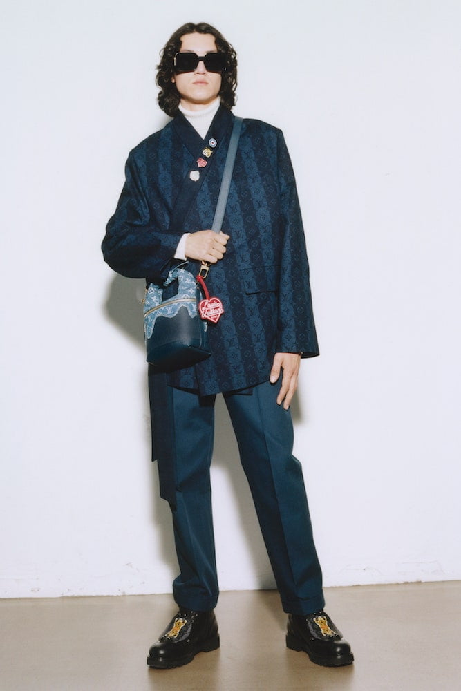 Menswear staples like the suit jacket have been cut to fall like a kimono, worn with chinos cropped just right above the ankle, and relaxed jeans stamped with cutouts of the LV monogram. Odes to Nigo’s childhood, in the form of cartoon animal motifs – first used by Nigo’s label Human Made – appear as duck-shaped buttons, tiger-clad tote bags, and cracking leather jackets that house a flock of lovable creatures. Quack, quack.