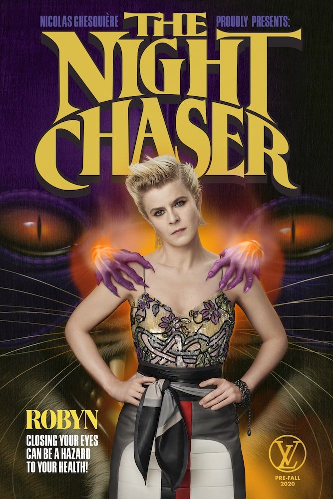 Sophie Turner wears a cream suit and poses with a cane as the head of The Devil’s Mansion, while star of Pose and American Horror Story Angelica Ross dons a schoolgirl-on-her-way-to-the-Alps lewk as the protagonist of The Escape Room. With a playful spirit encouraging of an other-worldly adventure emerges a wearable library in which each of the outfits tells their own tale, especially when combined with the personality wearing them. The literary inspiration materialises in the graphics seen in the collection too – Ghesquière used the original cover of William Peter Blatty’s 1971 cult science-fiction novel The Exorcist on colourful t-shirts. Despite being pure fantasy, we’re seriously crossing all of our fingers for Netflix to take some of these as casting suggestions for their future projects. Robyn as a Night Chaser? We’d binge-watch a full season of that.