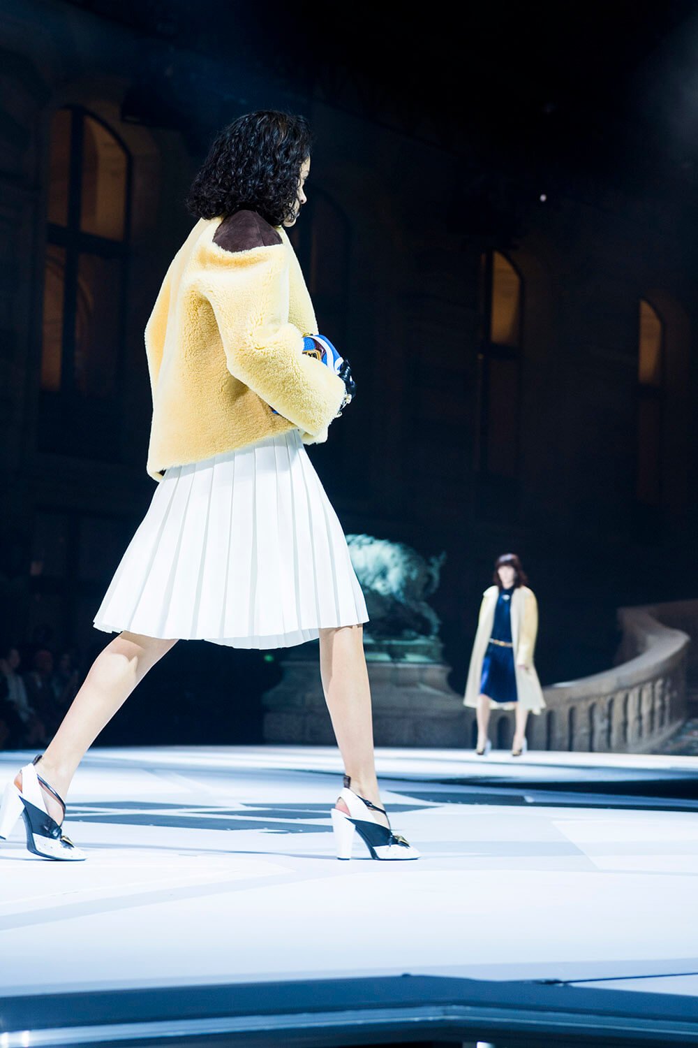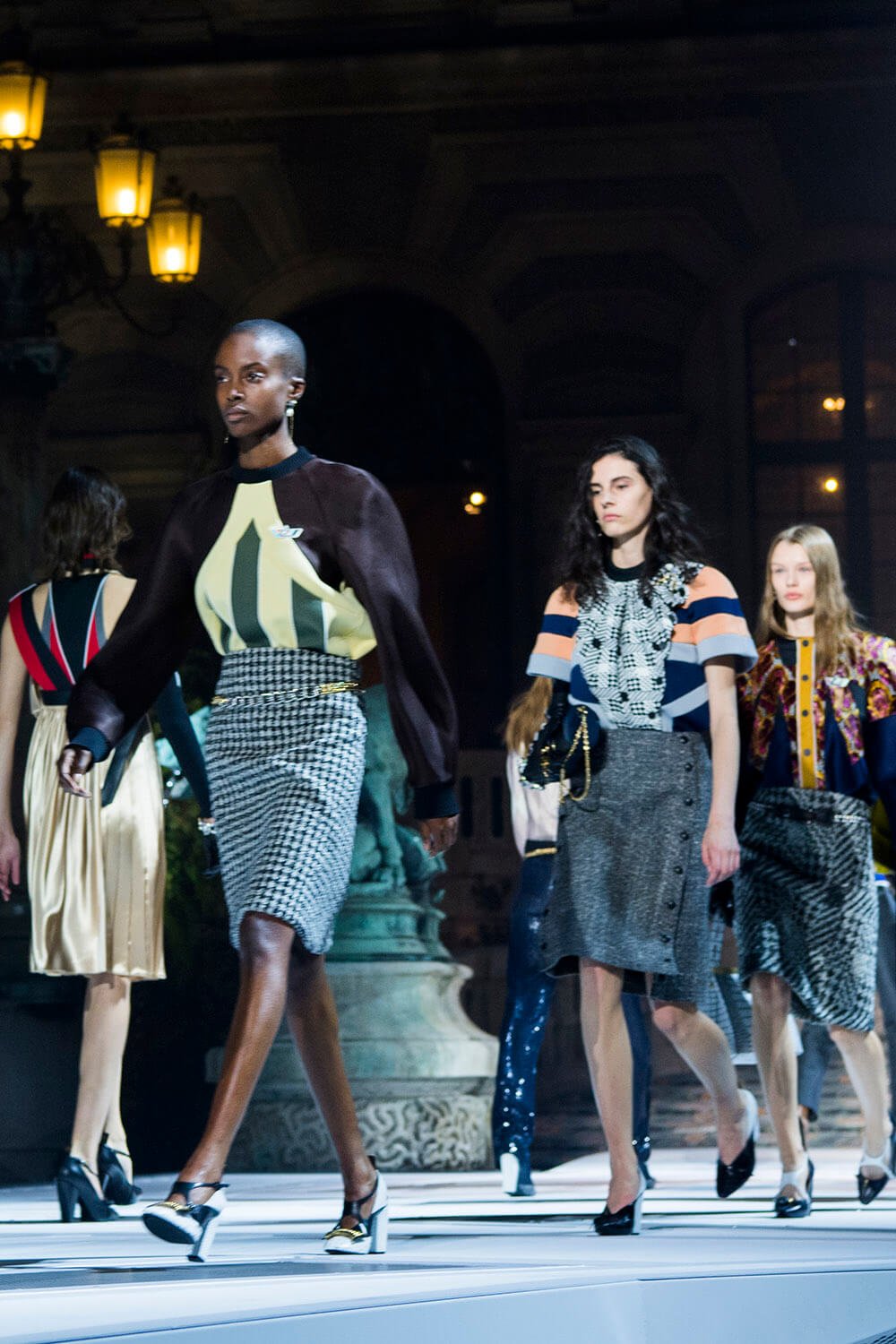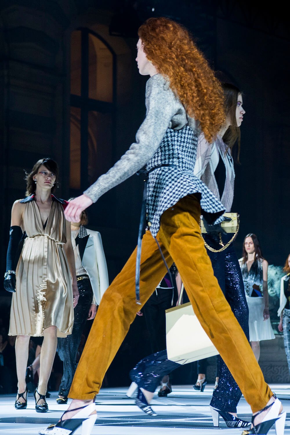 In the dead of the night (well, 6.30pm in Paris) the ladies of Louis Vuitton came out from their lair into the Musee Du Louvre’s courtyard, spotlit. The past was meeting the future, quite literally, as the runway ramp turned from the original Louvre paving into a white and grey landing pad. Star Wars style. Water spurted from the statues and Grace Jones’ eerie, theatrical ‘I’ve Seen That Face Before’ filled the night, “Strange, he shadows me back home, footsteps echo on the stones, rainy nights on Hausmann Boulevard, Parisian music drifting from the bars,” setting the scene. These women were up to something. Skirts fell to the knee, woollen checkered and pleated, straight down and straight to business. Embellished fringing fell off the shoulders and skirts and jumpers were lined with crystals on collars and waists.