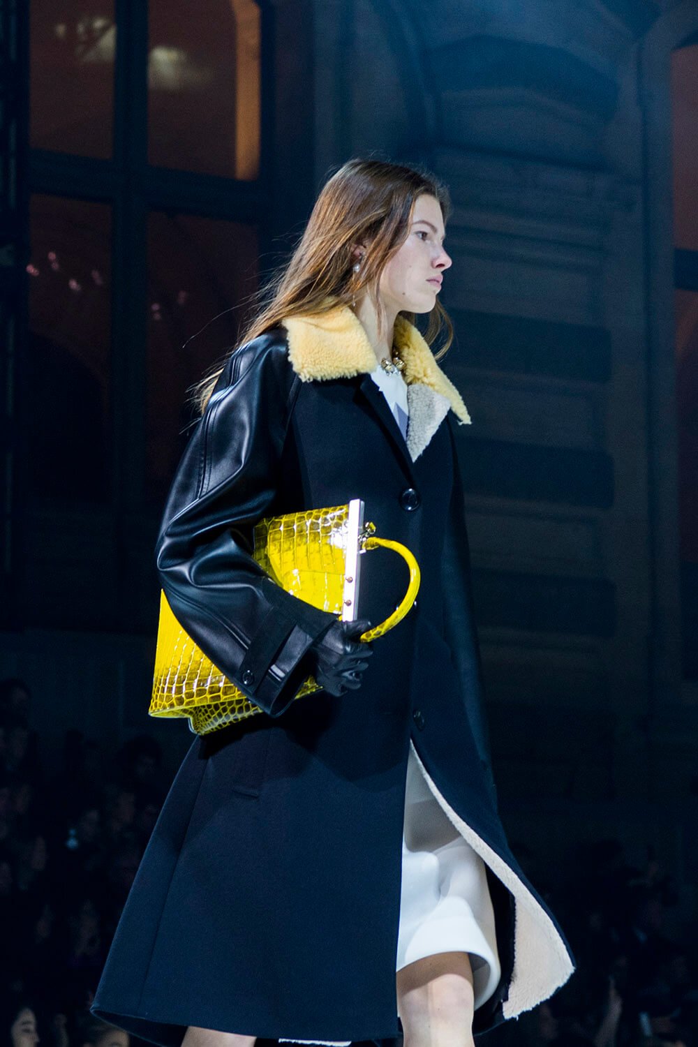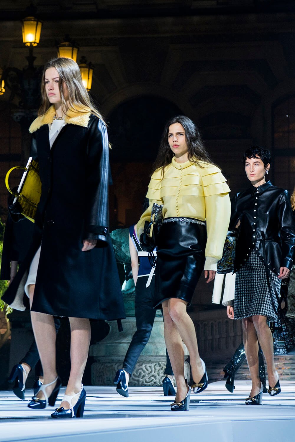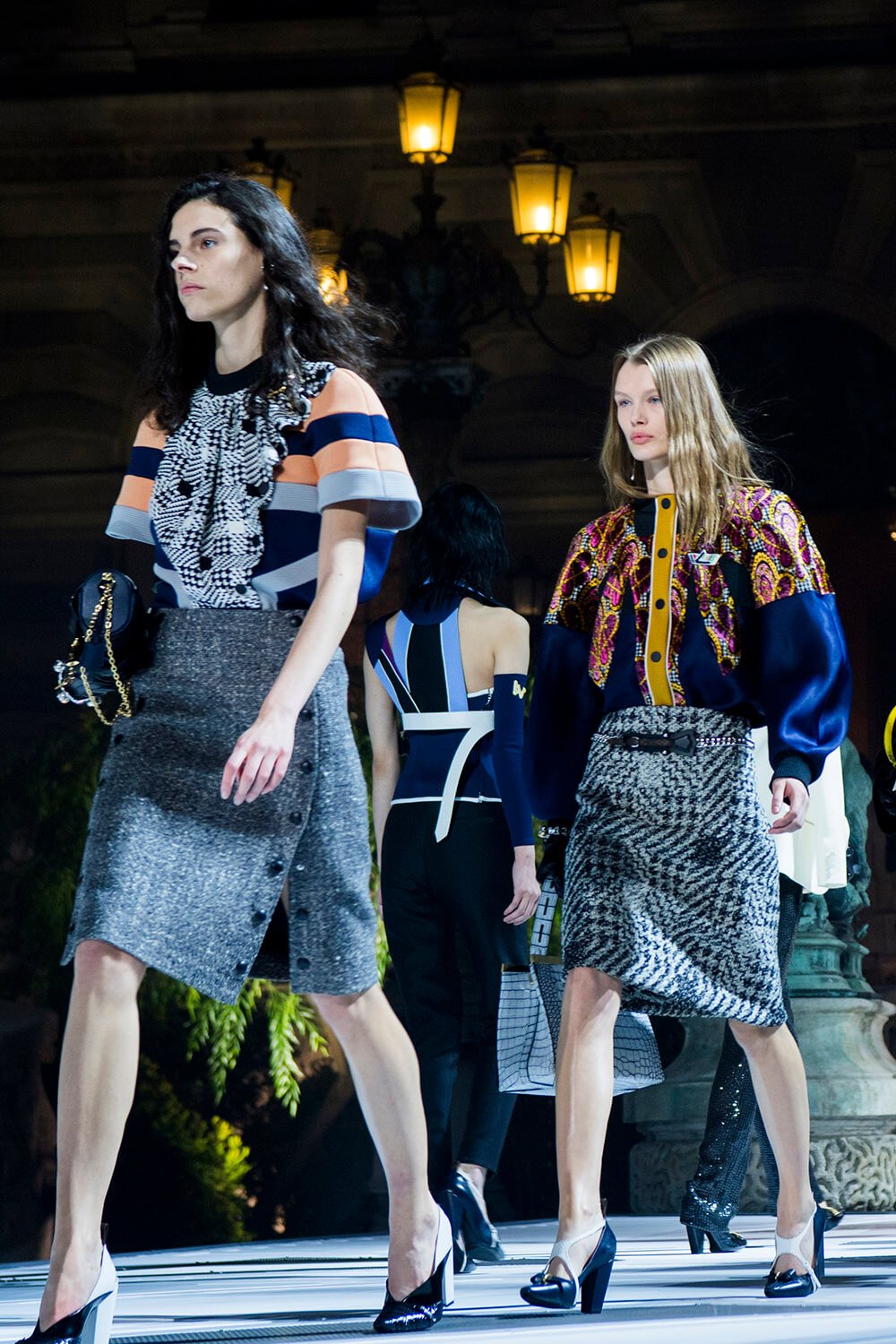 In the dead of the night (well, 6.30pm in Paris) the ladies of Louis Vuitton came out from their lair into the Musee Du Louvre’s courtyard, spotlit. The past was meeting the future, quite literally, as the runway ramp turned from the original Louvre paving into a white and grey landing pad. Star Wars style. Water spurted from the statues and Grace Jones’ eerie, theatrical ‘I’ve Seen That Face Before’ filled the night, “Strange, he shadows me back home, footsteps echo on the stones, rainy nights on Hausmann Boulevard, Parisian music drifting from the bars,” setting the scene. These women were up to something. Skirts fell to the knee, woollen checkered and pleated, straight down and straight to business. Embellished fringing fell off the shoulders and skirts and jumpers were lined with crystals on collars and waists.
