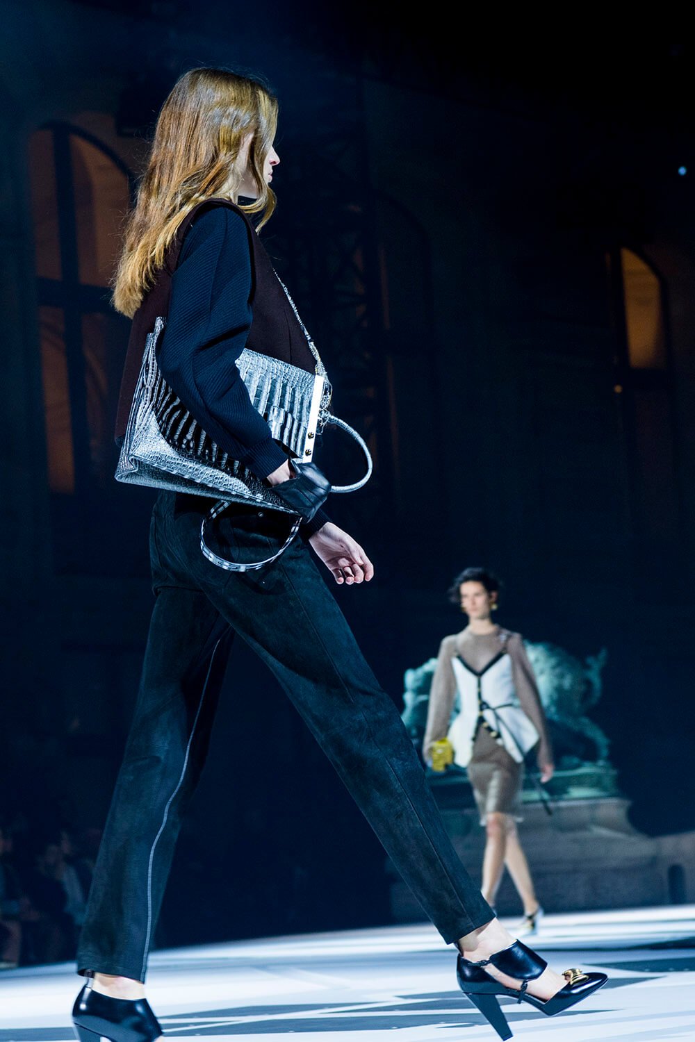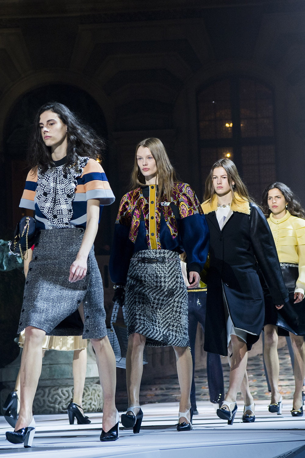 It was all about a drop sleeve, both long and short, horizontal layers and stripes defining the shoulders, capelet-like. Gold chains wrapped around their waists and they held their LV bags close to them, their most prized possessions in one gloved hand. Was this a secret mission, no DNA prints to be left? Sequinned black pants shined, loosely flared and silk satin pleats gently rippled. The Louis Vuitton woman was definitely feeling like a lady, Argyle knits and long sleeved dresses that whirled around knees. Pants were printed or simply black where colourful corsets cinched the waist. All that classic Nicolas Ghesquière leather was seen in shiny jackets, short skirts and camel colours, worked loosely onto shearling jackets. A whole lot of good looking, smart and sharp Louis Vuitton. Just how we like to end things. Paris, over and out.