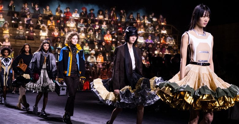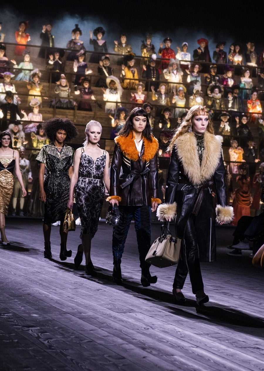 Spectacular! Nicolas Ghesquière orchestrated a major sound and vision experience to close Paris Fashion Week. The backdrop was a moving tableau of 200 choral singers dressed in historical costume from 1500s to the 1950s (done by Stanley Kubrick’s collaborator, and Sofia Coppola’s costume designer for Marie Antoinette, Milena Canonero). The scale was epic. Imagine those Hogwarts haunted paintings that come to life and multiply it by 200. Ghesquière explained he wanted the past looking down on, and interacting with his show. The audience represented the present day fashion corps and the models showed off the future. Louis Vuitton is sponsoring the Met Gala’s next exhibition “About Time: Fashion and Duration,” and in this show past, present and future collided.