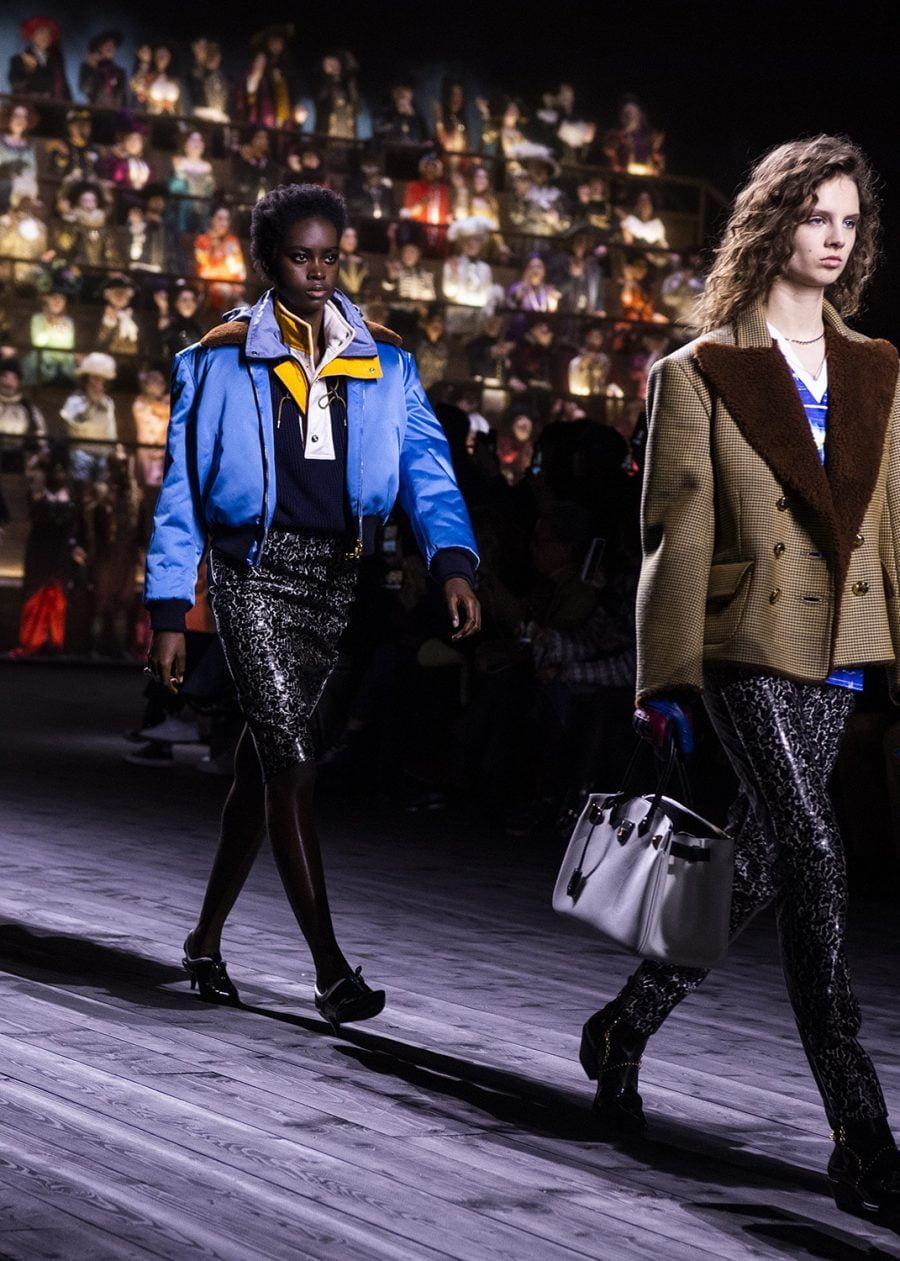 On the catwalk, eras collaged to create new silhouettes. The show opened with a series of high performance outerwear jackets that recalled the bombast and excesses of eighties skiwear but equally worked as modern streetwear. They were worn atop 1960s-style stripe hipsters or fabulous flouncing 1950s net petticoats. Ghesquière pumped up the volume on some of them with outsized frills laced in a subversive layer of latex and paired them with space-age, storm trooper vests. Seventies belted, fur-collared leather coats were styled with draped parachute silk trousers. Teddy boy drape jackets were worn with skinny white jumpsuits. The message: “I Still Breathe the Past,” was stitched onto some looks. The finale saw three exquisite, beaded and embroidered matador jackets worn with speedway pants. As the voices of the choir swelled, the show became a crescendo of time-travelling, era-hopping, genre-defying dressing. What’s new? It’s all in the mix.