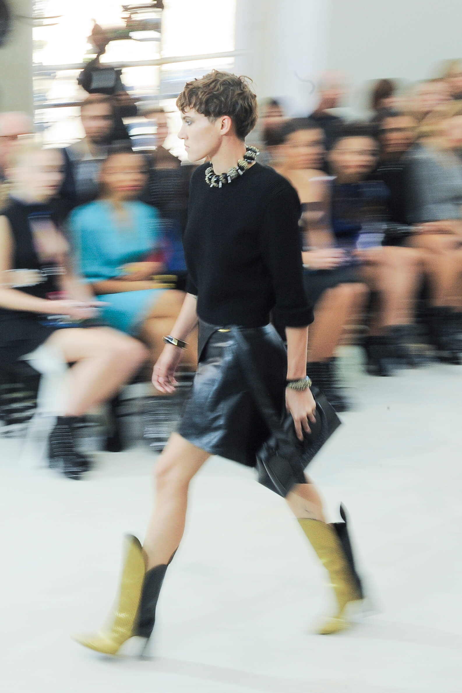 Imagine a dystopian future where everyone is dressed in Louis Vuitton. It’s dark. There are sequins. It’s filtered through an eighties prism. Let’s call it a movie prism where the heroine from some underground lair, into the shadows of some Blade Runner type backdrop. There was tailoring here. Skirt suits with a Catherine Deneuve shoulder, well she was in the audience so we can call it that – you know, that sort of pointy forties affair. It was deconstructed, looking as in a sense almost unfinished, as if the seams were yet to be sewn together, and worn over ruched leather bodices in the colour of dried blood, or wet look leather body suits that appeared almost wetsuit in their panels. The wetsuit idea reappeared in the thick seams of scuba bonded trousers, with zips that run up the front of legs, and were partially unzipped to allow for the trousers to be turned up. Tailored lace in royal blue and dark green added to the eighties ‘trash’ feel. Not ‘trash’ as in trash obviously, but that sort of touching on OTT hair band excess. As did black leather was wrapped around waists in the form of skirts, the seams cut to create wide flaps, dresses of draped jersey or sheets of tiger line sequins were held together at the hips with belted straps, sharp, precise slashes at the shoulder or waist revealing a slither of bare skin. Long, almost covered up dresses appeared in sheer mesh, with large harlequin panels of satin preserving any last ounce of modesty and creating an illusion of seams and structure. To sort of quote Motley Crue, knock em dead Louis. These are looks that kill.