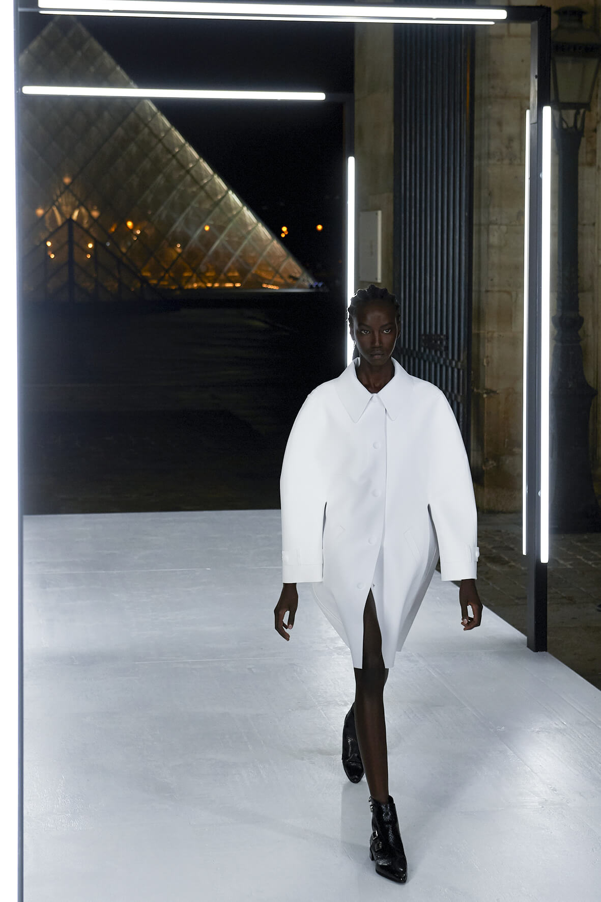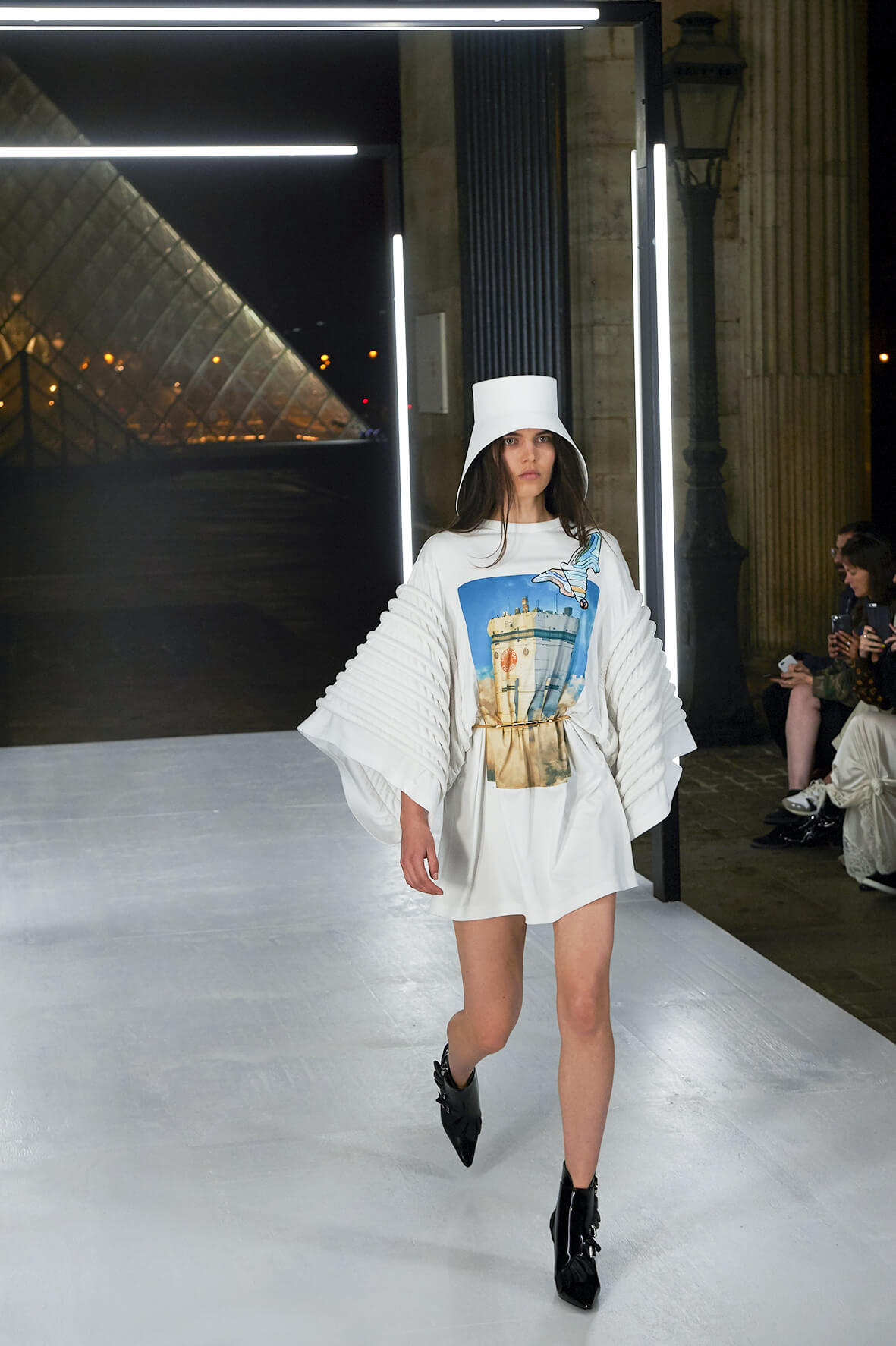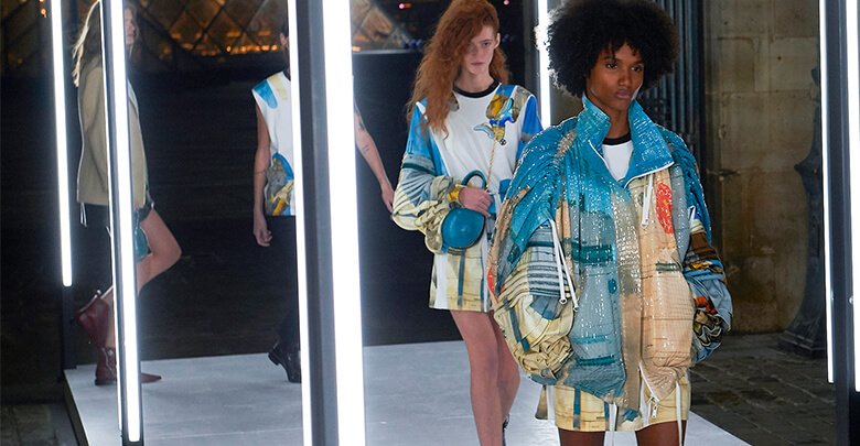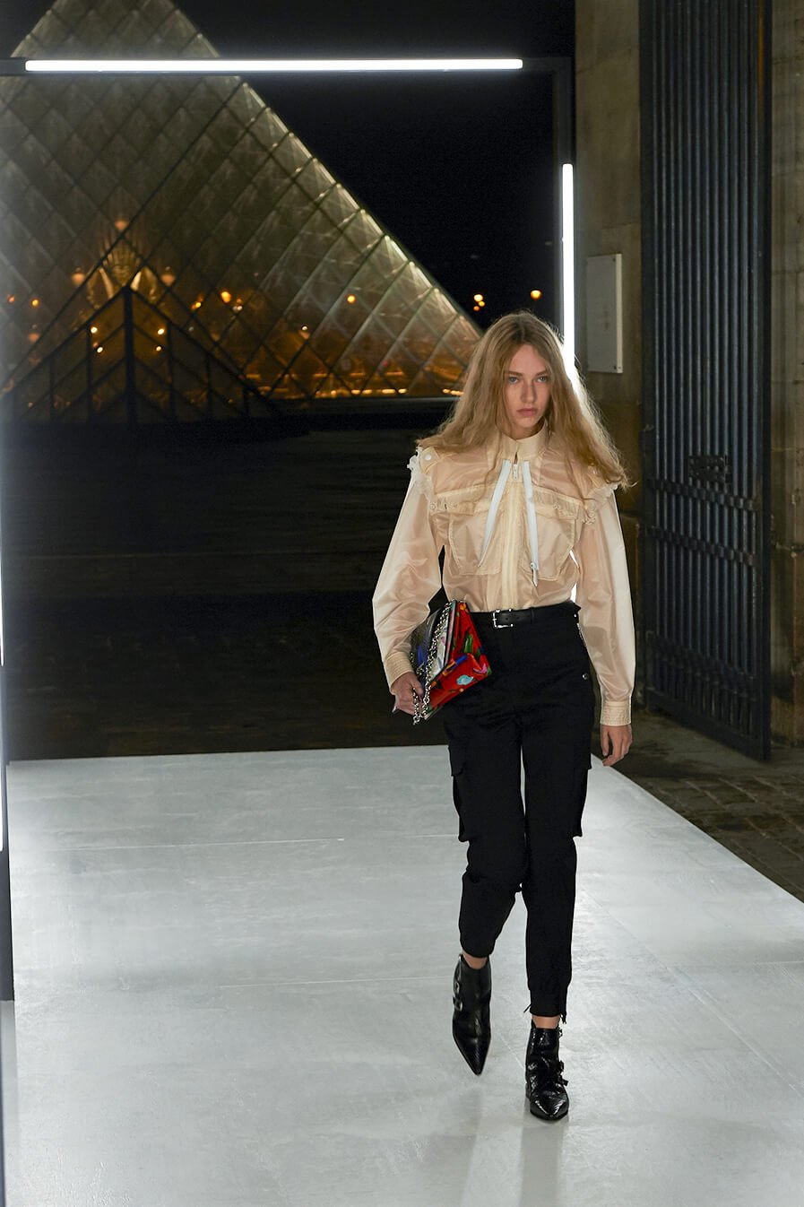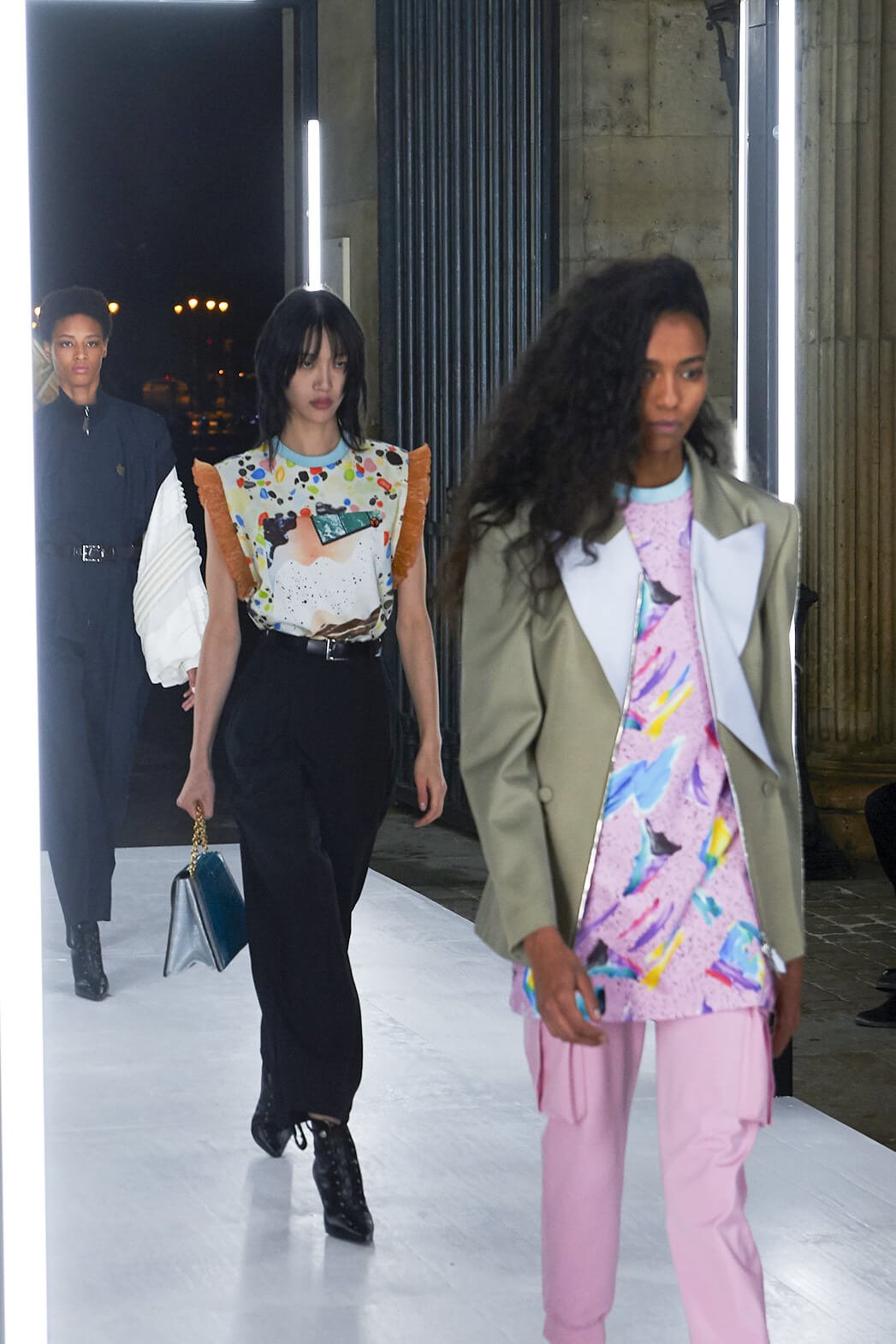 Around a historic courtyard within the Louvre, snaked a series of stark glass tunnels. It was as if some secret agency had constructed a secret facility in the most hallowed crucible of French culture. That’s what Louis Vuitton’s Nicolas Ghesquière did. The designer was in upbeat futurist mode. The first look – a voluminous blouson with space suit sleeves and matching mini skirt – set the tone for this sporty, vivid, sci-fi-inflected show. Out came the Ghesquière gang in their colourful confident clothes. This was not an exercise in clinical chic. Although the clothes were precise, they were also gaudy (in a good way) and the collection throbbed with a vibrant energy. The prints looked as if they were borrowed from collaged Instagram feeds or Memphis inspired graphics.