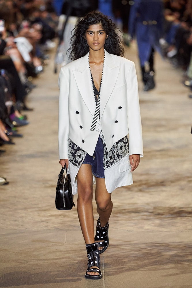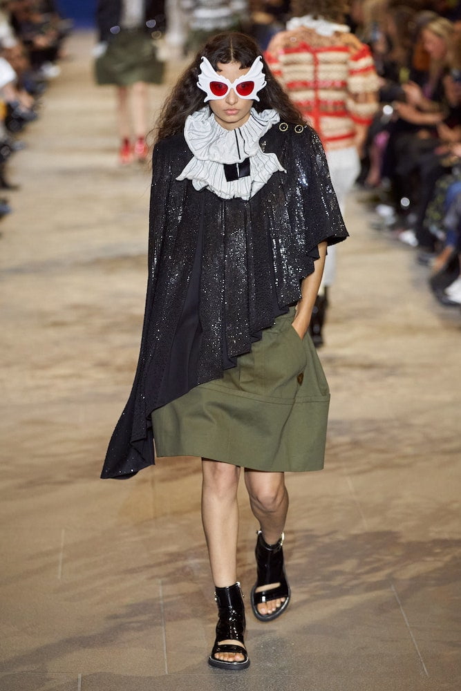 This year is the 200th anniversary of his birth, so the setting was pertinent – although it never looked so splendid in his day. Nicolas Ghesquière had lined the passage with hundreds of vintage chandeliers to evoke a vampire ball inspired by his costume designs for Alicia Vikander’s new HBO series Irma Vep. “I like the figure of a vampire who travels through the ages, adapting to dress codes of the era he lives in while maintaining a certain air of the past,” said Ghesquiere, who mixed and mangled eras with masterly skill. 1920’s beaded. Poiret-style gowns were distorted by hooped panniers (a reference to Empress Eugenie). A pleated silver skirt worn as a cape over high-waisted jeans had a glam rock feel. Elsewhere the mood was of rapturous fashion free-styling. Tailcoats were encrusted with jet beads or came in crisp denim, glimmering slip dresses were worn over jeans whilst grand heirloom capes and eccentric, Peggy Gugenheim-style sunglasses added drama.