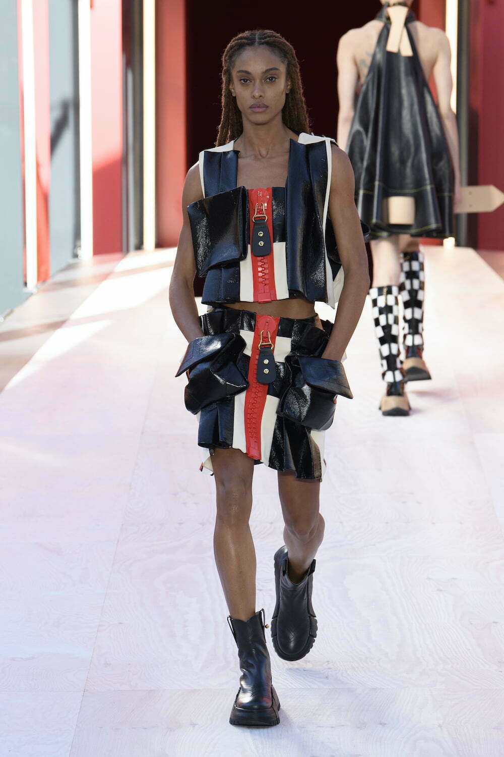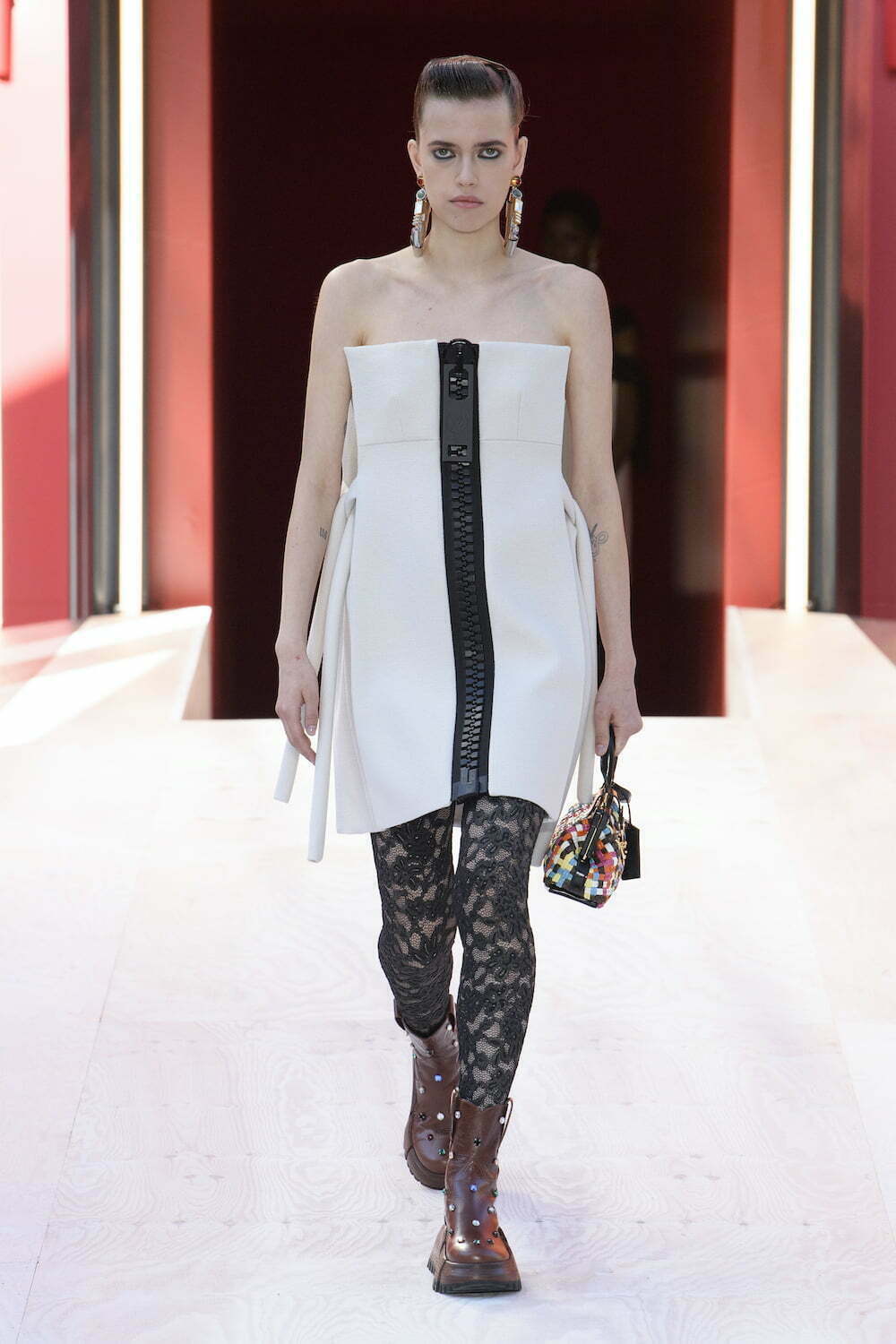The infinitely large and infinitely small came together at Louis Vuitton in a madcap game of proportion that would have made Klaus Oldenburg proud. Nicolas Ghesquière zoomed in on the small details of clothes and bags, supersizing them and placing them on clothes, to startling effect. Giant zippers, supersized grommets, press studs, the corner of a trunk, labels (all the signifiers of the brand) adorned everything from little A-line dresses to leather jerkins and coats. One dress had macro versions of the lock and chains of a Vuitton bag in lieu of shoulder straps. Details of leather straps and buckles – blown up onto prints on perforated leather suits and little leather trimmed halter tops – looked like upside down duffel bags complete with draws strings and straps. Meanwhile, bags were treated to a reverse perspective. Luggage tags were blown up to shopper-size, and pocket chain wallets were magnified into portfolio-sized clutch bags.