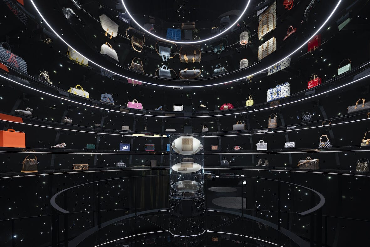 The 12-room scenography that awaits inside, designed by Japanese architect Shohei Shigematsu, exploring each chapter in this ever-enduring story, drives that message home. Upon entering, visitors are greeted with two Trunkscapes (installations comprising of stacked, illuminated trunks) designed by Shigematsu that highlight the significance of the piece to the house’s history. After that, visitors can move through sections like Asnières and Origins, which highlight pieces from the LV archive which show how its recognisable codes, such as the monogram, came into development, before starting to serve up the role Japan played in the mix. Featuring examples of the house’s early Japonisme inspirations, the exhibition culminates in a room dubbed Collaborations, with the most recognisable link-ups, courtesy of Yayoi Kusama, Takashi Murakami and Nigo getting their moment to shine. Each takes form as an immersive experience where visitors can enter 360-degree domes with kaleidoscopic walls to see key pieces from each partnership displayed all around them. Also on display are bespoke trunks created by artist and house ambassador Sho Hirano as well as Verdy, a designer local to Osaka.