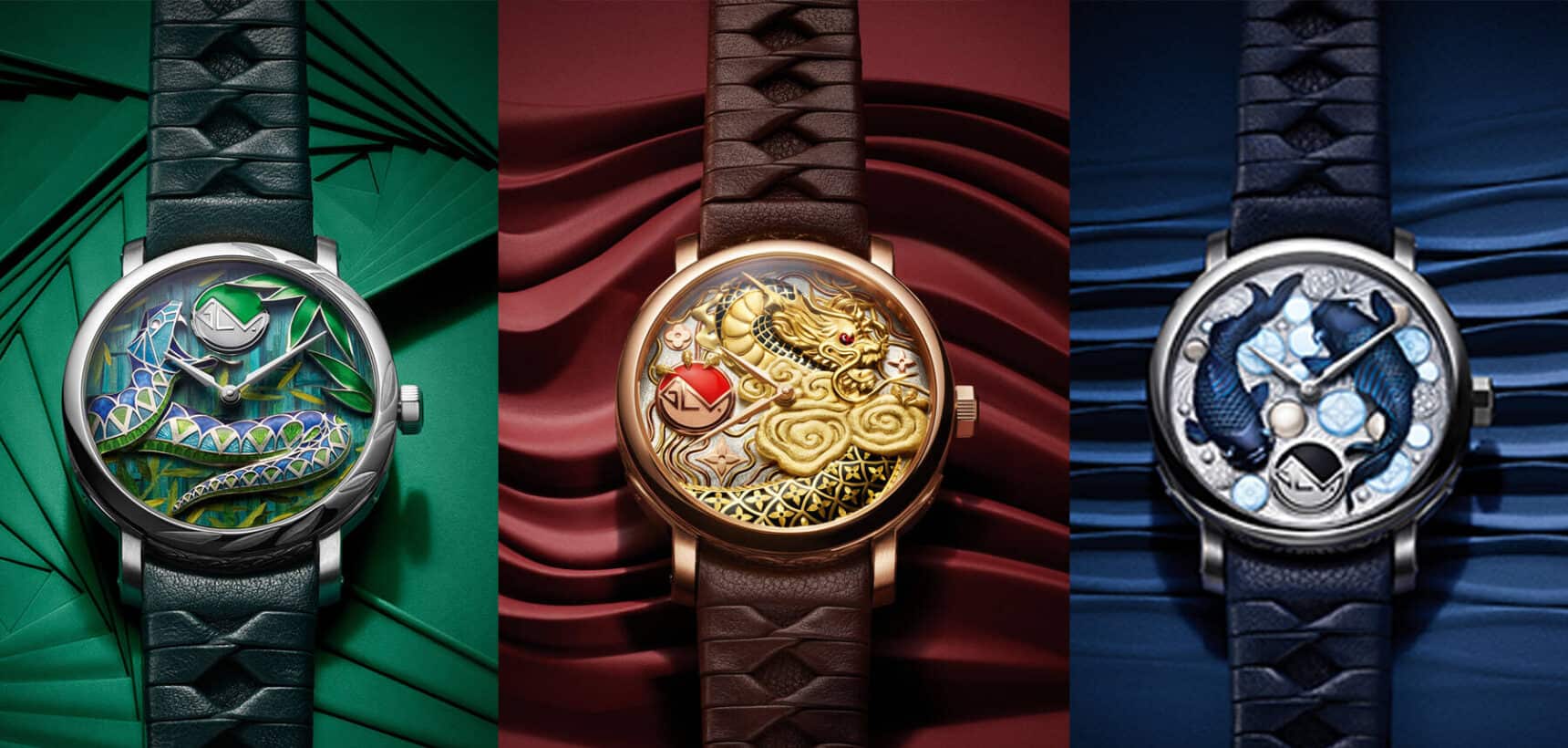 Finally, Dragon’s Cloud shows a majestic rose gold dragon clutching a carnelian-set GLV monogram in its fierce talons while the glare of its cabochon-cut ruby eyes entrances the wearer. Its scales are enamelled and adorned with gold monogram flower paillons, with the lower half of its body distinguished by the use of paillonné (an extremely rare form of enamel containing tiny pieces of gold leaf (known as paillons) suspended between layers of translucent veneers). An equally rare technique known as damascening is applied to the traditional habitat of the Asian dragon – both sky and sea – and uses contrasting metals to create sense of layering that echoes the organic textures found in nature. Once considered lost arts, both practices signal the immense power and age-old wisdom of the dragon.