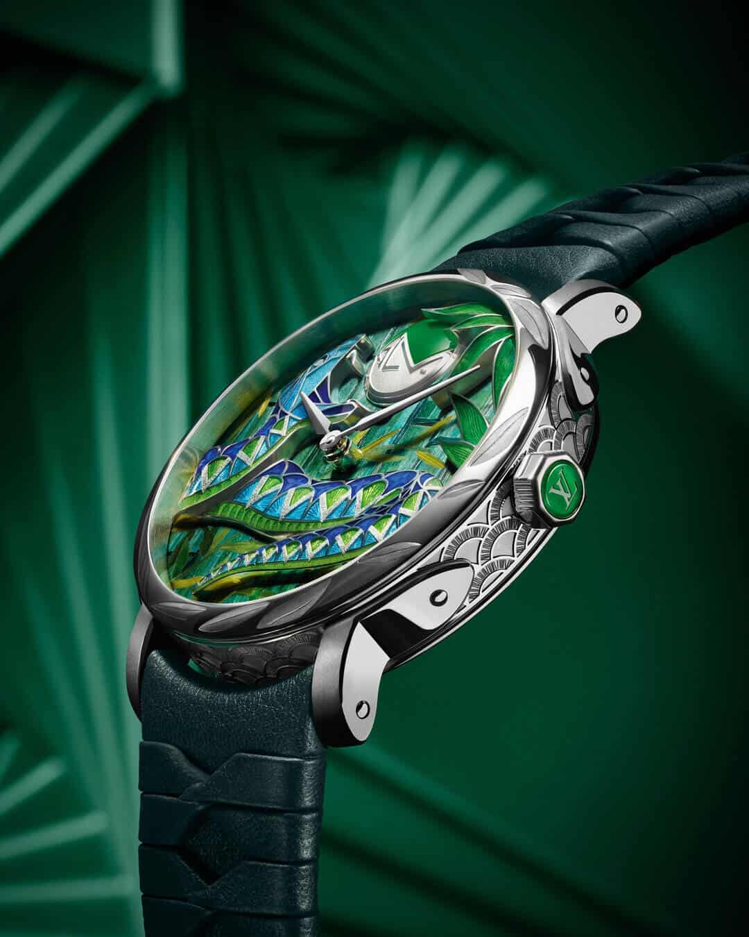 The second wonder is a more savage, more viscous timepiece that’s been aptly entitled the Snake’s Jungle. Venturing to the wild heart of a verdant bamboo forest that’s actually crafted from a composition of wood, parchment and straw hand-assembled using marquetry techniques, Louis Vuitton lands on the serpent. Using a mix of micro-sculpture, reticulated engraving and champlevé enamelling techniques for the viper, the slithering white gold animal, cast in jewel-bright hues of blue and green rears its head with its forked tongue and fangs extended. Its mesmerising gaze is fixed on a hovering GLV monogram orb of gold and nephrite jade. As a “potent allegory of untamed Nature”, the bamboo leaves burst out of their glass confines and spill out onto the white-gold case.