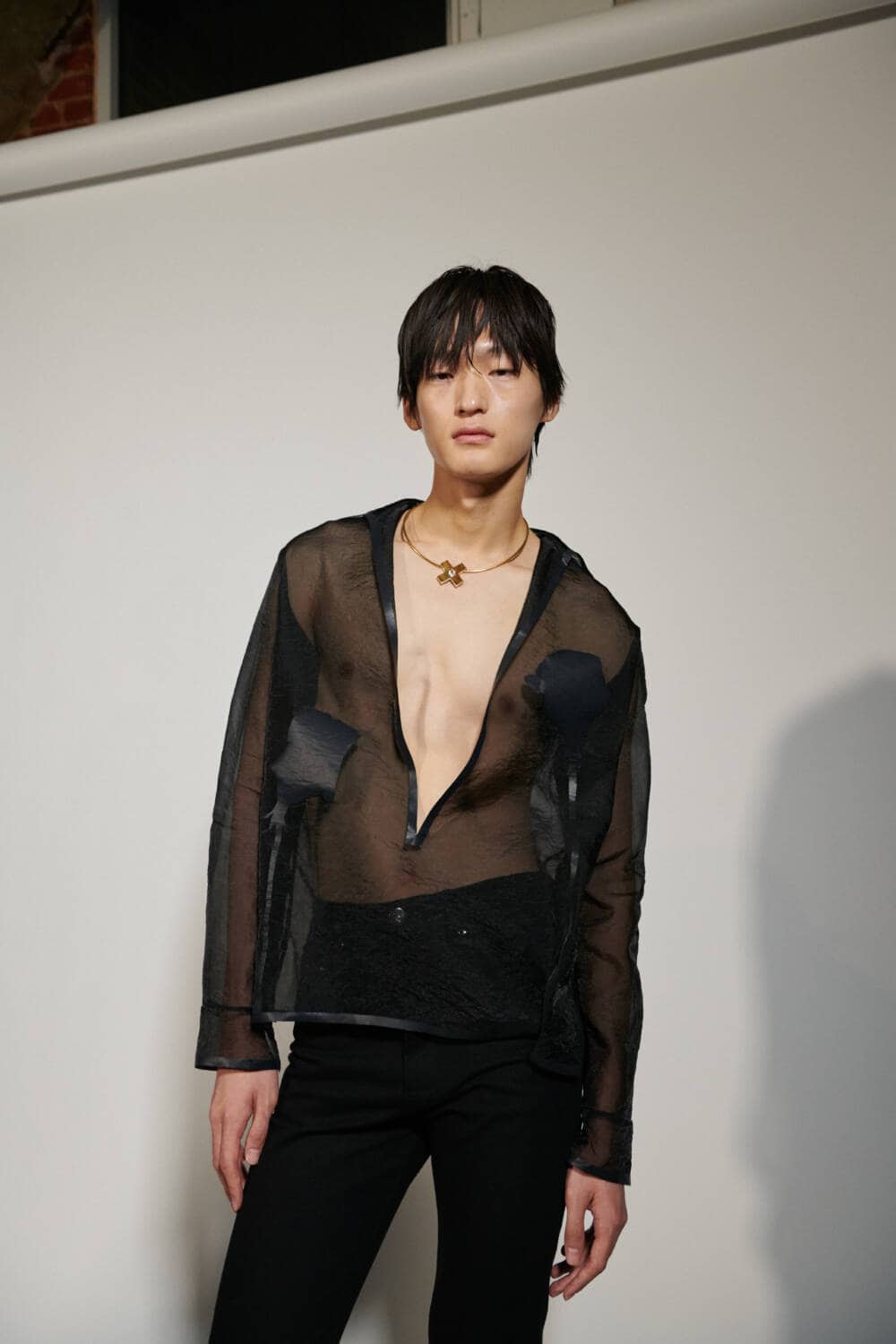 Working with the blessing of the Robert Mapplethorpe Foundation, de Saint Sernin cited the late photographer’s imagery as a jumping point for the collection. “I imagined he was still alive today, and that we were creating silhouettes that he would want to photograph; clothes that he would love, and that feel as much him as they do me,” he said via the show notes. The looks clearly reflected the influence, as it opened with a series of sheer floral tops, referencing both Mapplethorpe’s iconic flower photographs as well as de Saint Sernin’s signature love of transparent fabrics.
