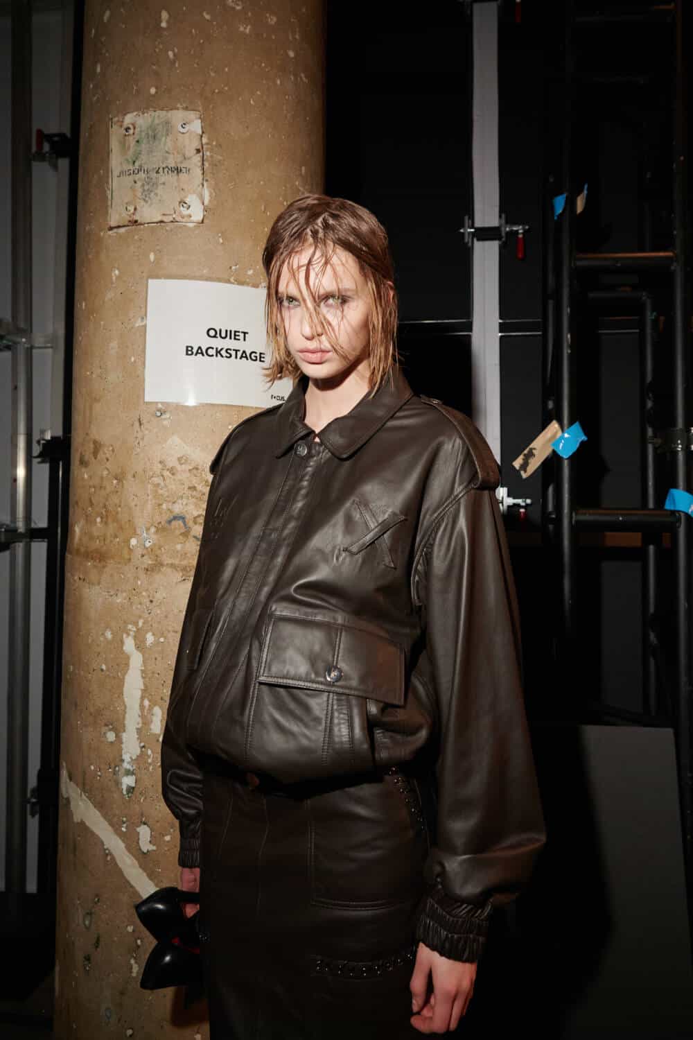’80s power dressing also made an appearance, nodding to the decade when the photographer was at his peak with cinched trench coats, including one worn by Alex Consani, who sold it convincingly with her signature strut. To drive home that reference there were also strong shouldered jackets and pinstripe embroidered leather shifts coupled with 18k gold-plated jewellery that brought to mind Wall Street-era, greed is good ritzy excess. Speaking of jewellery, there was also a sprinkling of fine jewelry pieces as well, made in collaboration with Tous.