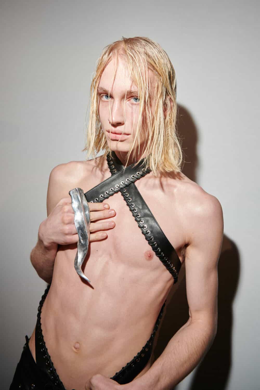 Of course, given the Mapplethorpe theme as well as de Saint Sernin’s Instagram teaser image, bondage-inspired leather also made a prominent appearance. There were bralettes, riffs on the bumster trouser which revealed plenty of cheek, as well as aviator jackets on the less risqué side. But for those seeking more, leather daddies and darkroom cruisers were referenced courtesy of eyelet-trimmed harnesses and pants with removed rear panels as well as gimp-inspired masks made in collaboration with Ukrainian milliner Ruslan Baginskiy. To cap it off, why not add brass horns? These were made with Vagujhelyi, a brand founded by New York-based artist Diego Villarreal Vagujhelyi and meant to evoke the satyric charge of Frank Diaz. Devilishly delightful.