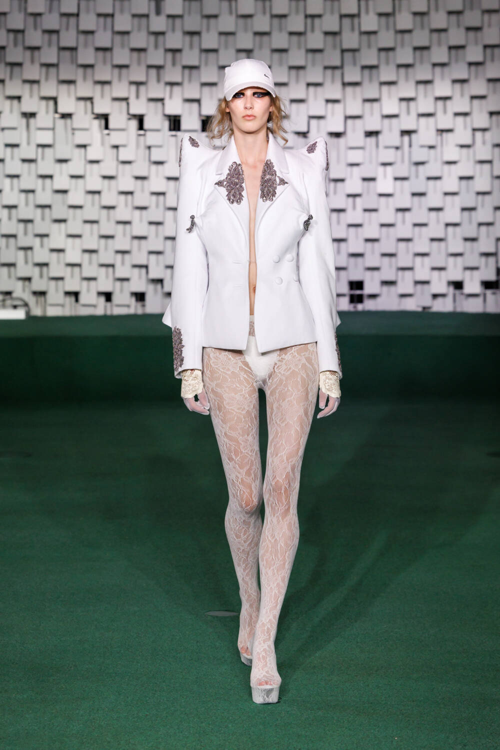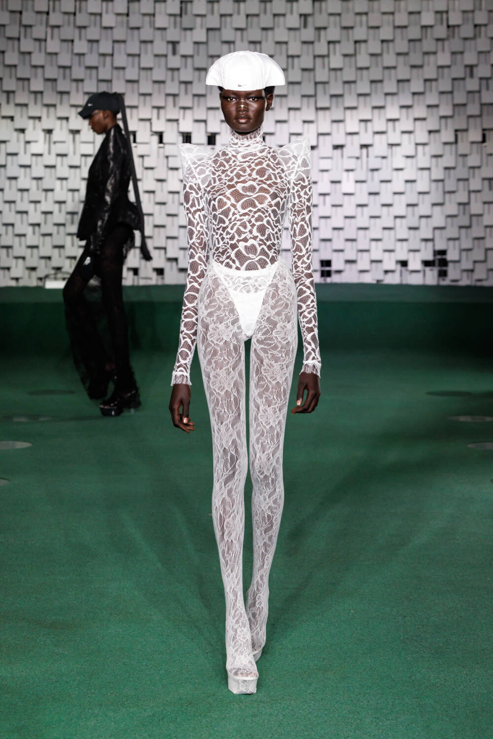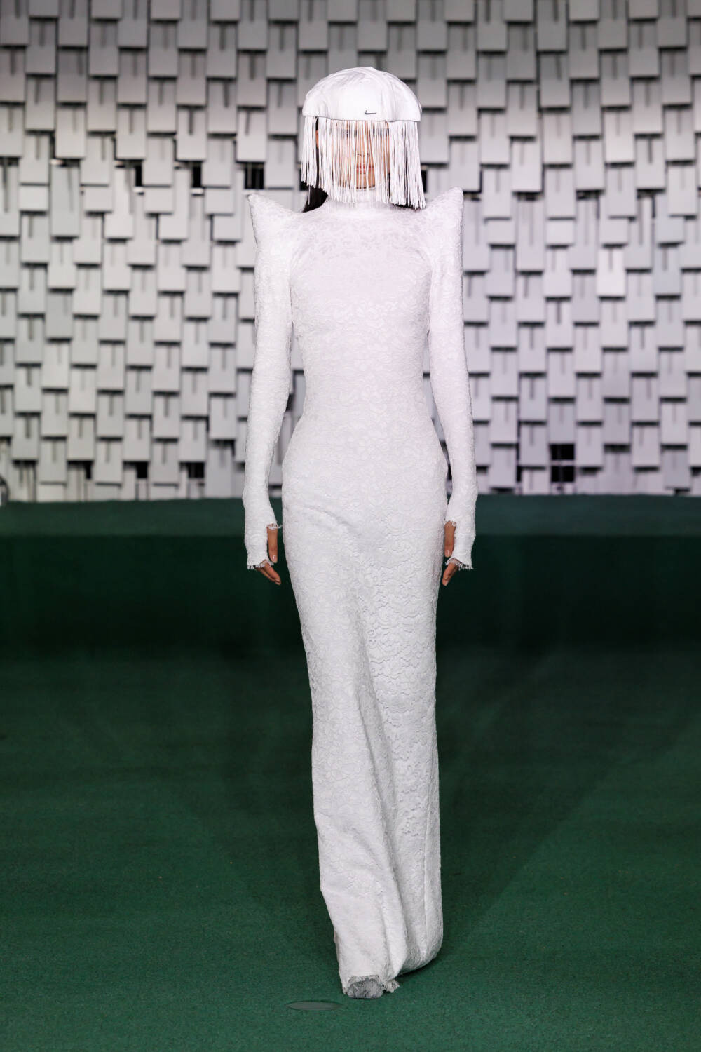 Carrying that sensual look into the eveningwear, he layered a nude slip dress with an off-the-shoulder corset adorned with gold embroidery. Maxi dresses featured excess, structured material that twisted around the arms and were paired with long gloves. Some looks were accessorised with grand headpieces detailed with draped fringing and modern Nike baseball caps, adding a contemporary twist to the lace ensembles.