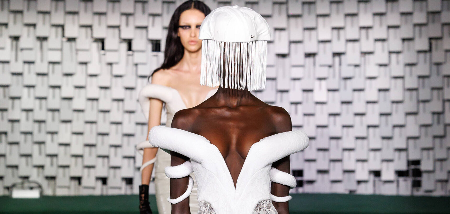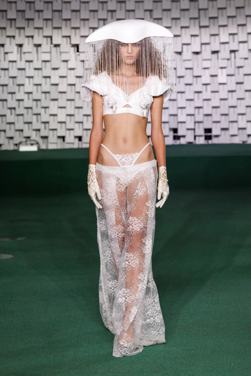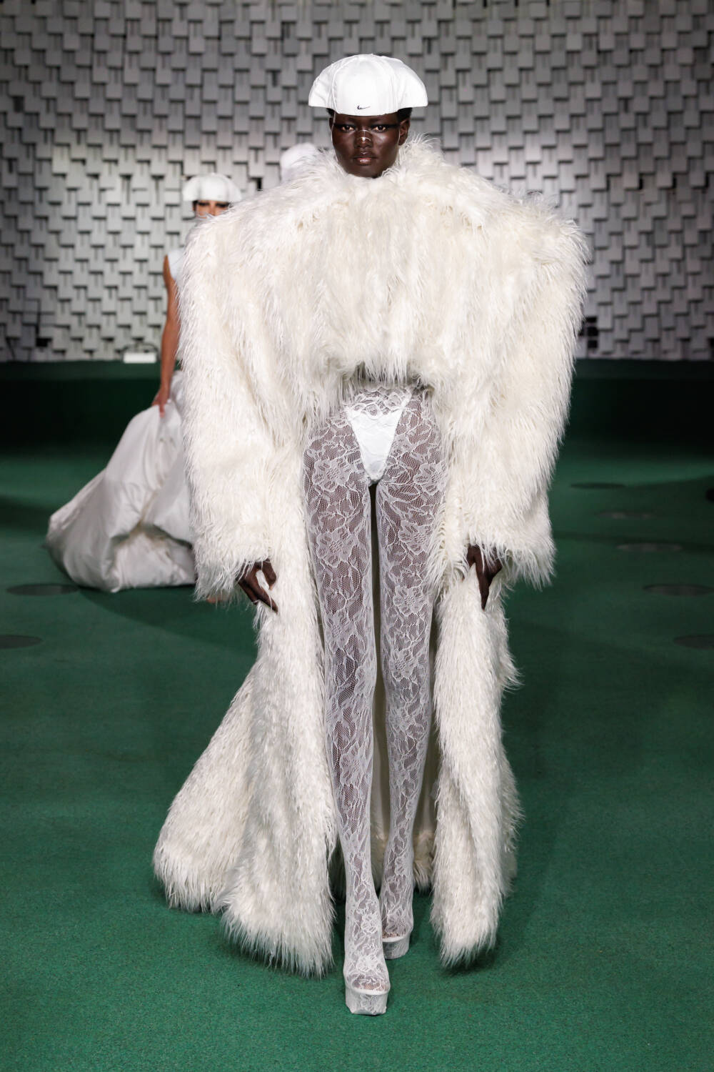 Carrying that sensual look into the eveningwear, he layered a nude slip dress with an off-the-shoulder corset adorned with gold embroidery. Maxi dresses featured excess, structured material that twisted around the arms and were paired with long gloves. Some looks were accessorised with grand headpieces detailed with draped fringing and modern Nike baseball caps, adding a contemporary twist to the lace ensembles.