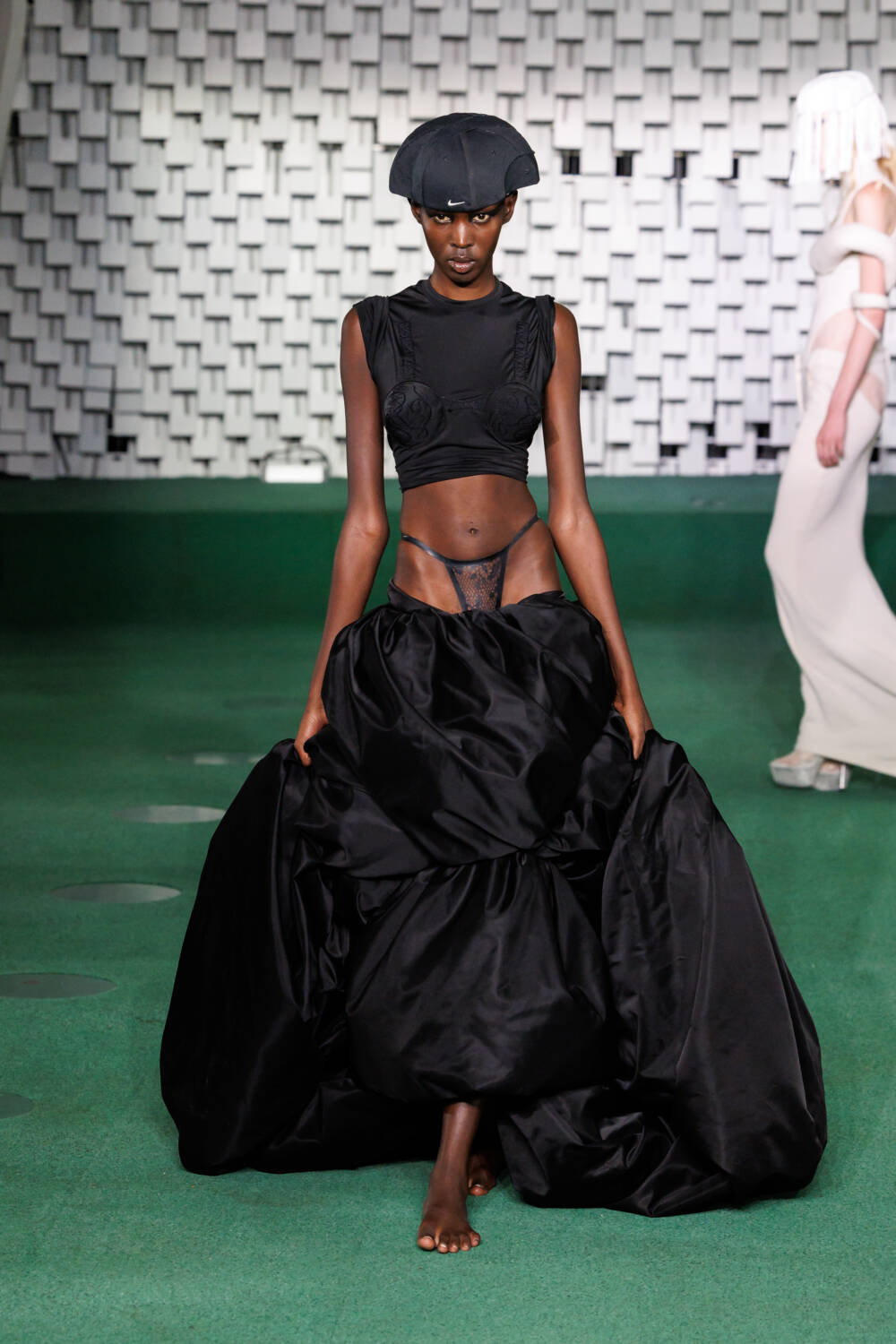 The final looks included an oversized, ultra-low-rise, puffy skirt, a black cape-like dress wrapped around the body, and a cropped Nike white sweater layered under cream-coloured draped fabric. Chic.