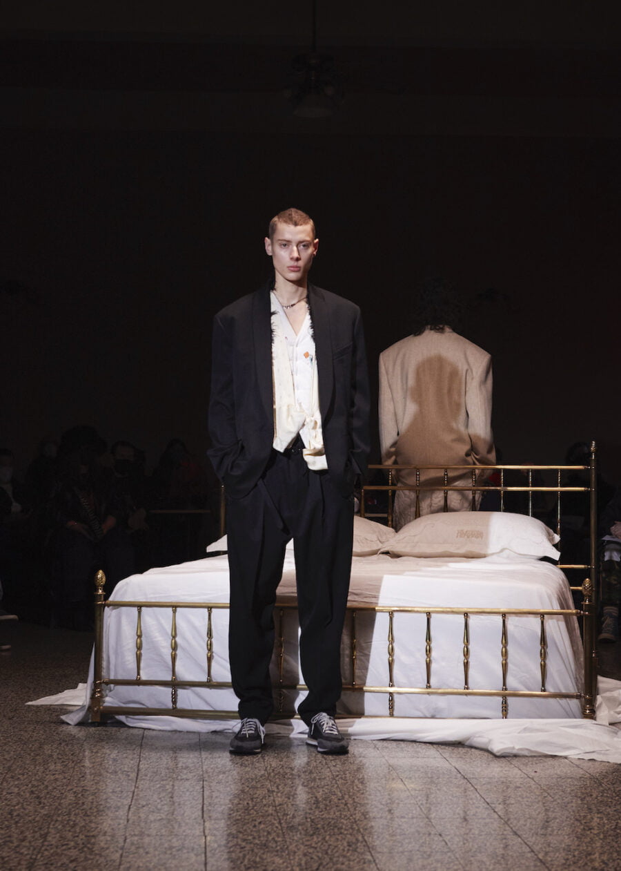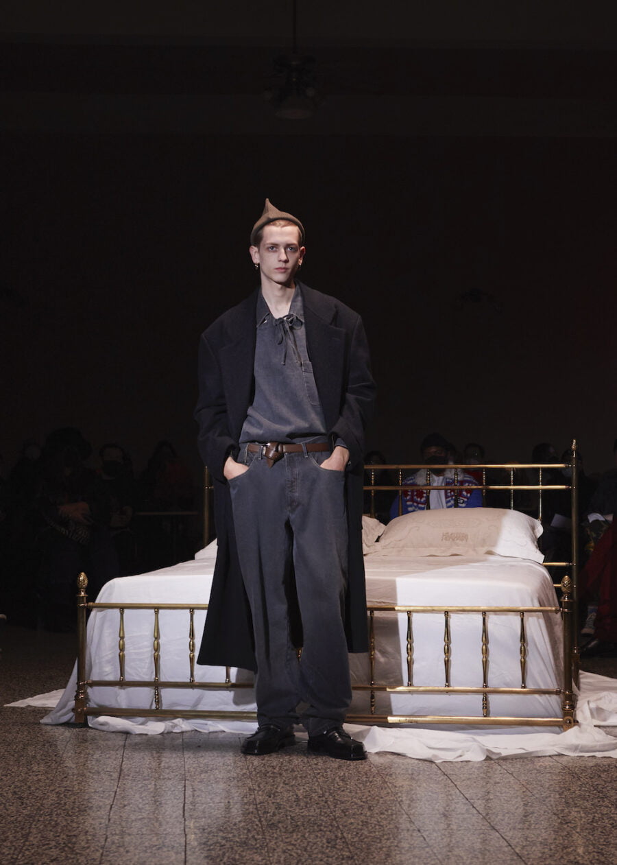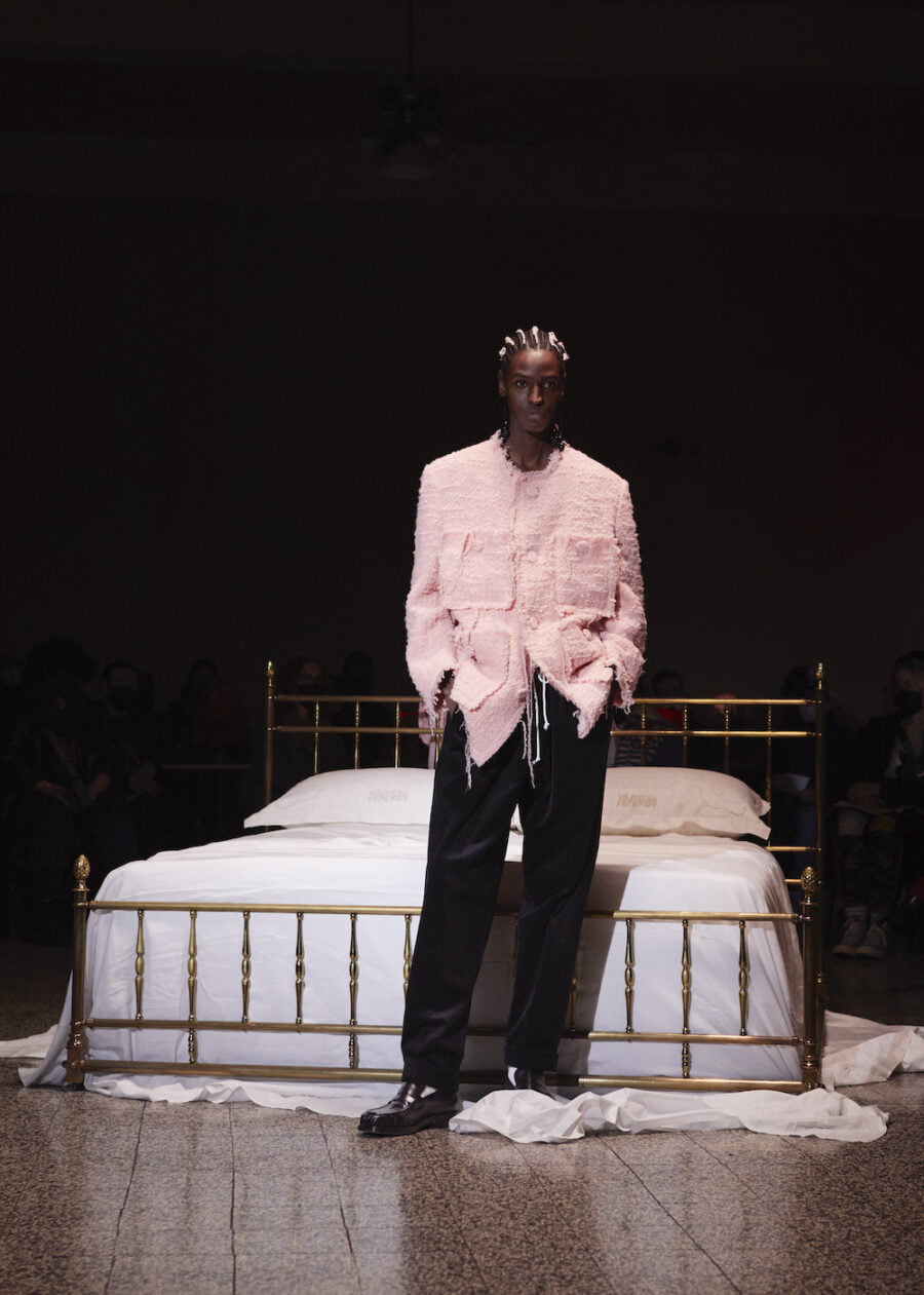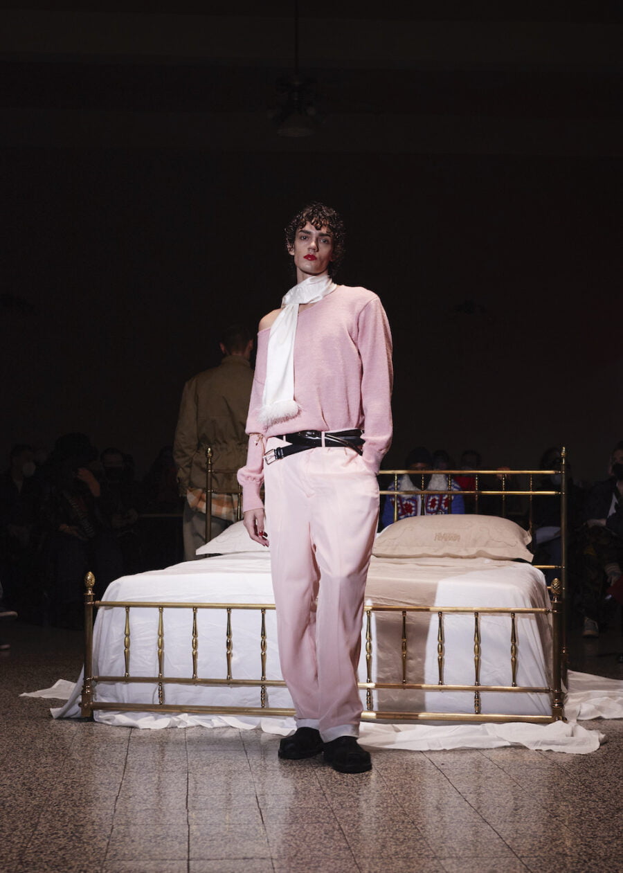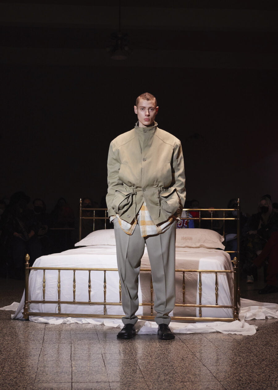 The show fashioned a nocturnal, melancholy atmosphere, as models slowly circled a bed frame, gawking at guests who watched from dining tables. They came in slouched suiting in olive green and chocolate brown wools, as well as mohair cardigans and old fashioned night caps translated as beanies. One blush pink jacket looked like a Chanel tweed blazer that had been chewed up and spat out. It made a fitting wardrobe for the new guard, not to be slept on.