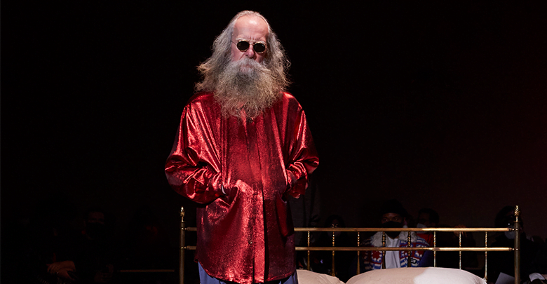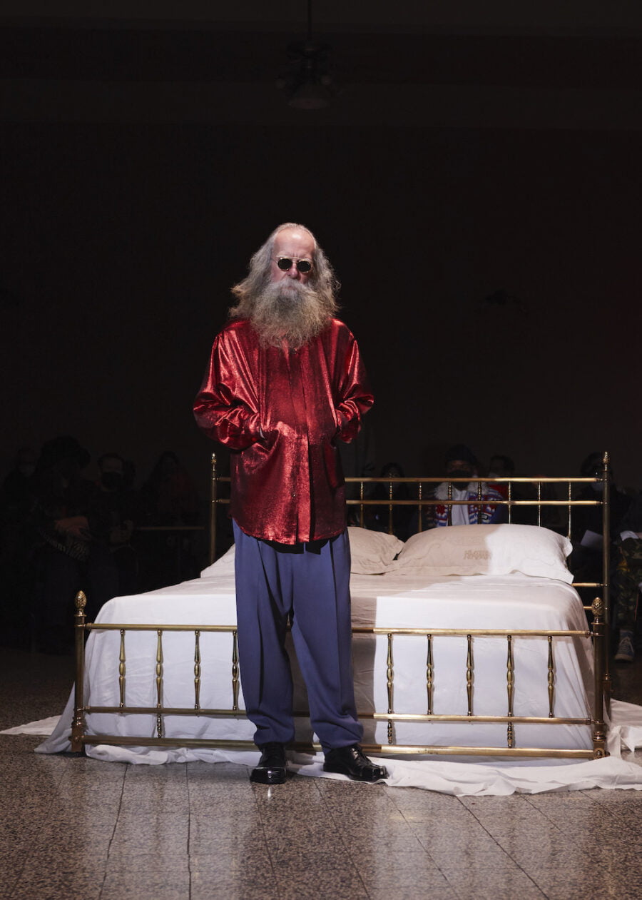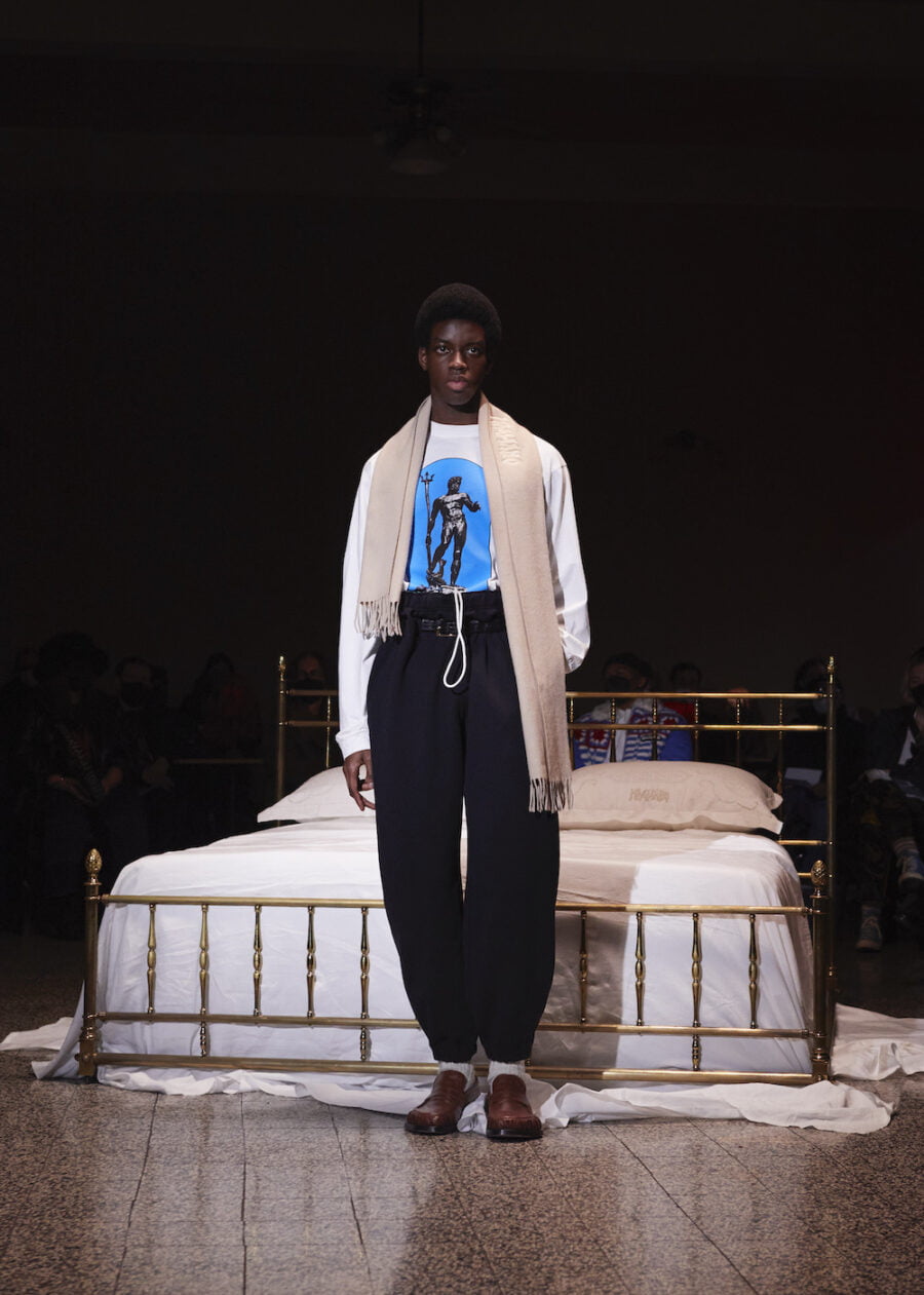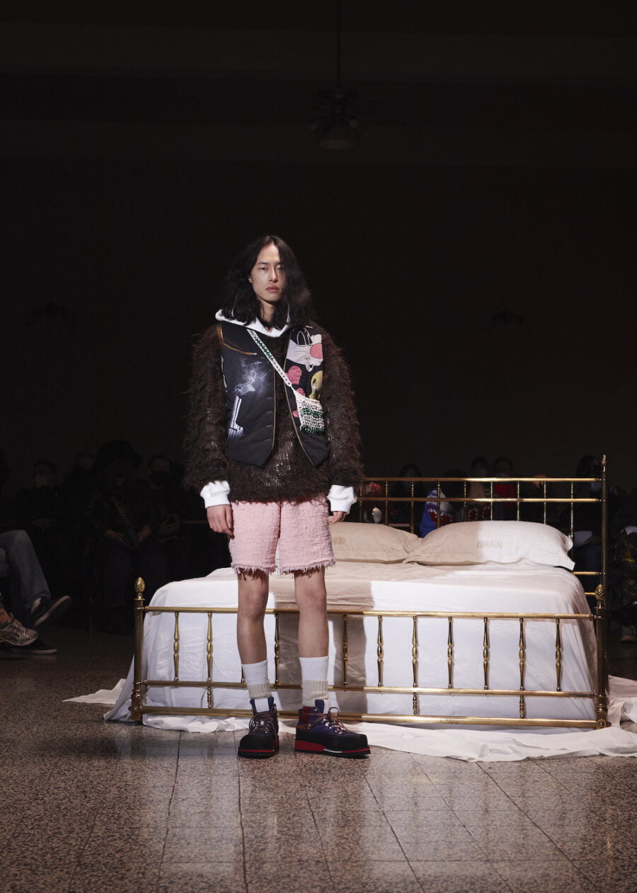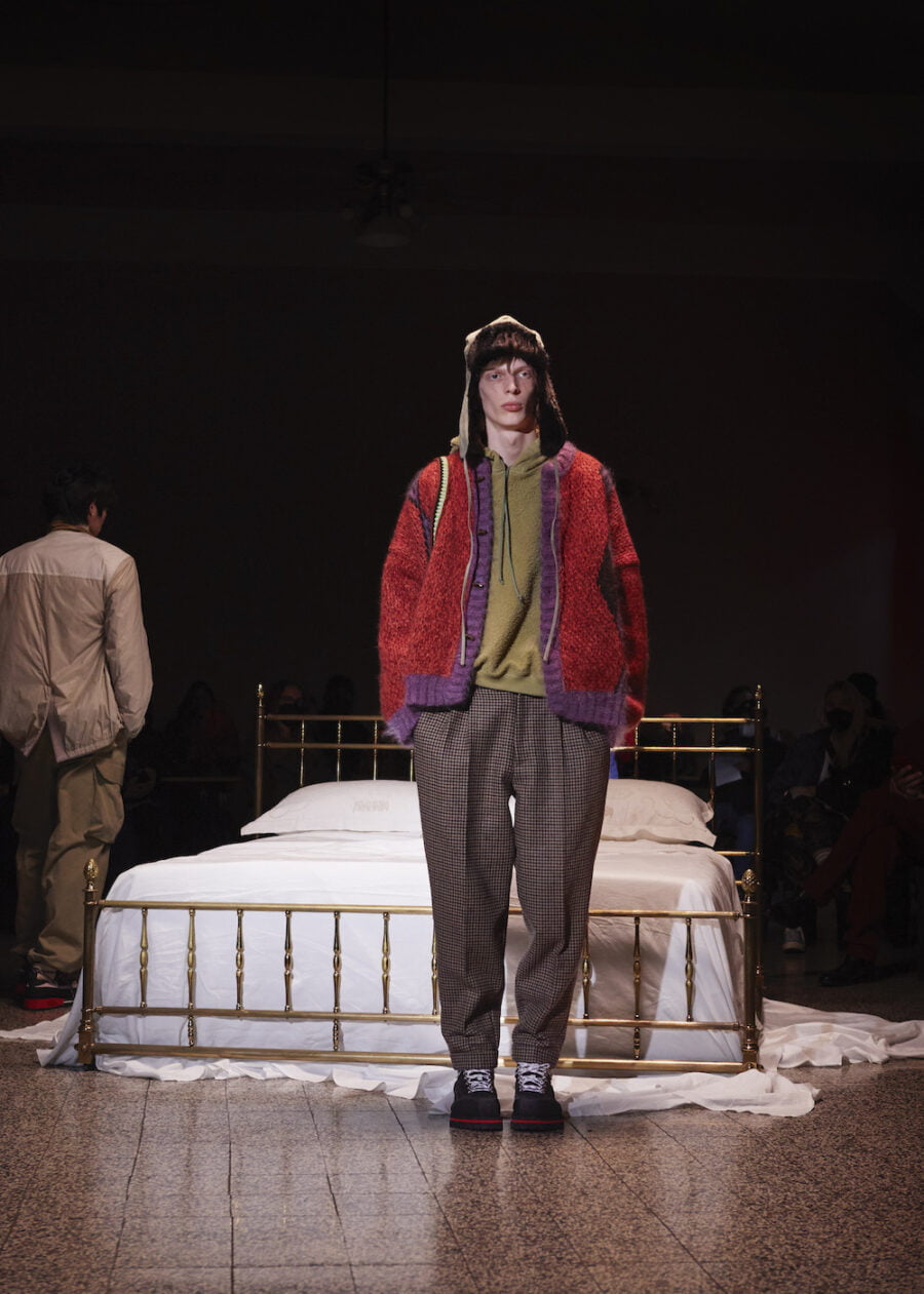 The show fashioned a nocturnal, melancholy atmosphere, as models slowly circled a bed frame, gawking at guests who watched from dining tables. They came in slouched suiting in olive green and chocolate brown wools, as well as mohair cardigans and old fashioned night caps translated as beanies. One blush pink jacket looked like a Chanel tweed blazer that had been chewed up and spat out. It made a fitting wardrobe for the new guard, not to be slept on.