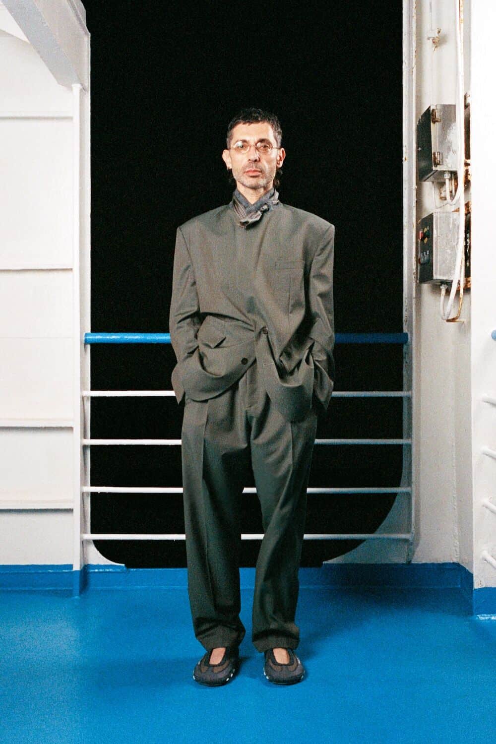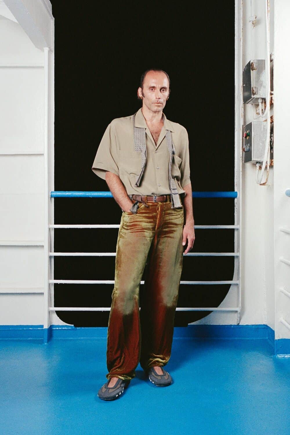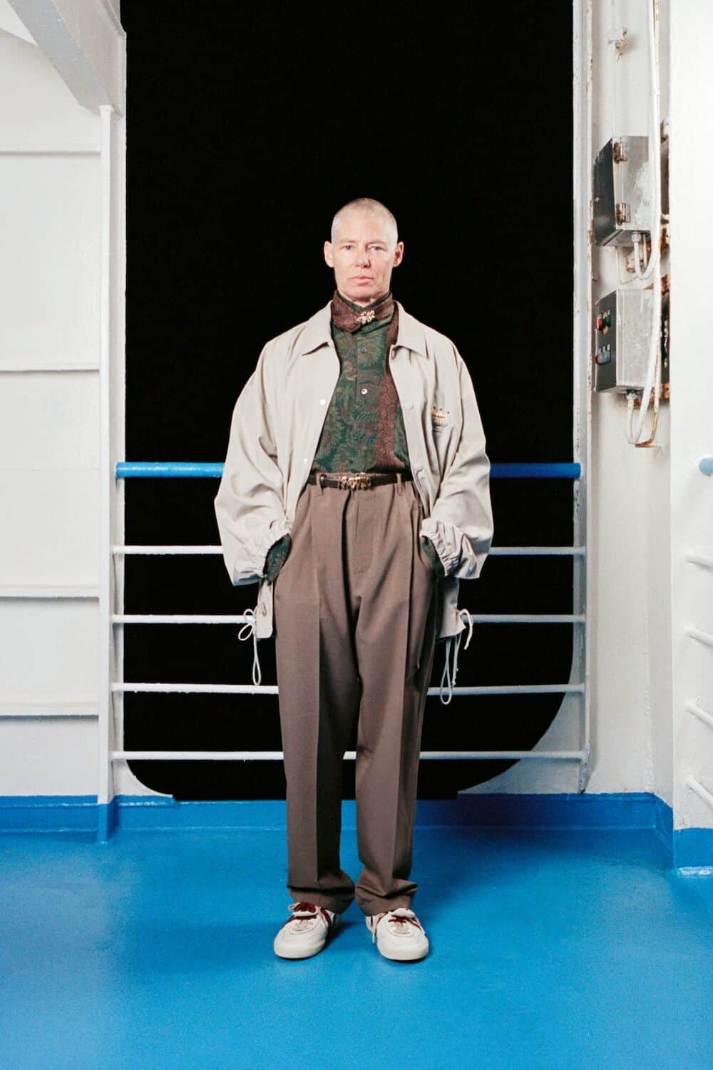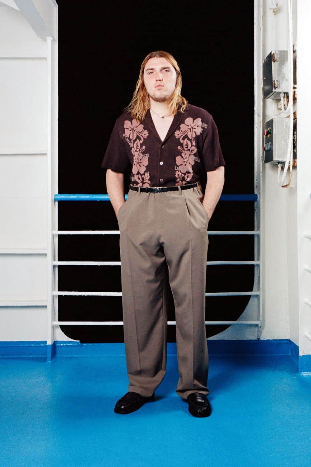 Taking place on a ferry, the scene opens with a man clambering out of a scuffed up double bass case, dashingly dressed in a black suit – collar popped, not a wrinkle in sight. The camera follows him into the parlour of the ship where two eclectic characters discuss their drinks of choice. One wears velvet trousers printed with a denim effect and a boxy button-down shirt; the other sports a brown pinstripe shirt-turned-dress, accessorised with fishnet tights. As Jazz music plays in the background, other guests play cards, tune their instruments or kip on the plush sofas.