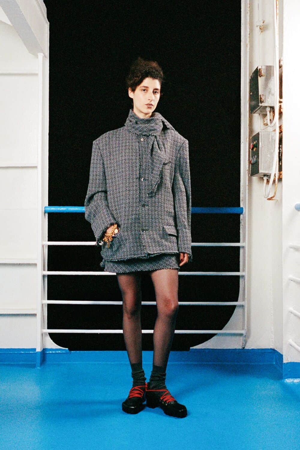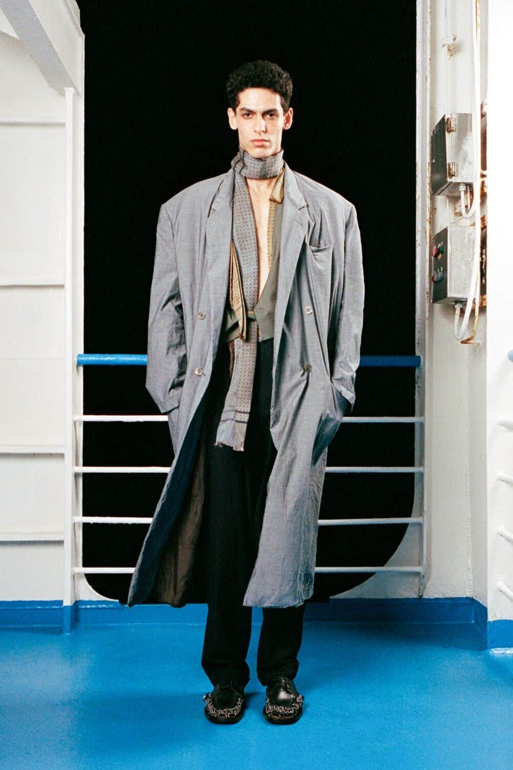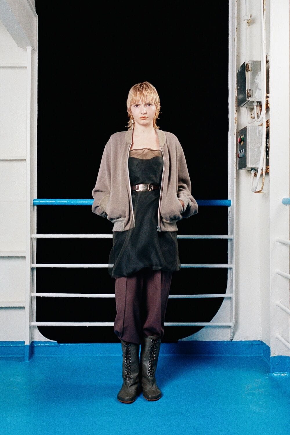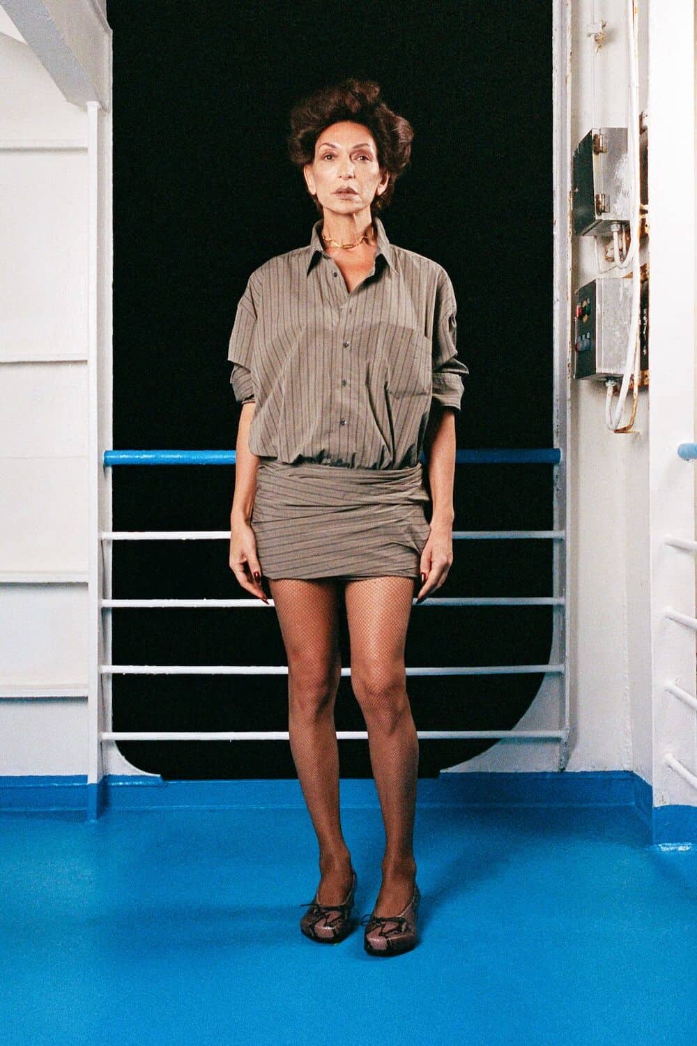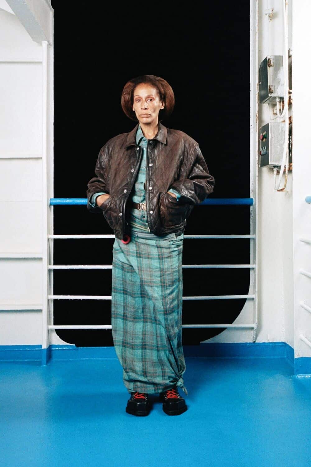 Taking place on a ferry, the scene opens with a man clambering out of a scuffed up double bass case, dashingly dressed in a black suit – collar popped, not a wrinkle in sight. The camera follows him into the parlour of the ship where two eclectic characters discuss their drinks of choice. One wears velvet trousers printed with a denim effect and a boxy button-down shirt; the other sports a brown pinstripe shirt-turned-dress, accessorised with fishnet tights. As Jazz music plays in the background, other guests play cards, tune their instruments or kip on the plush sofas.