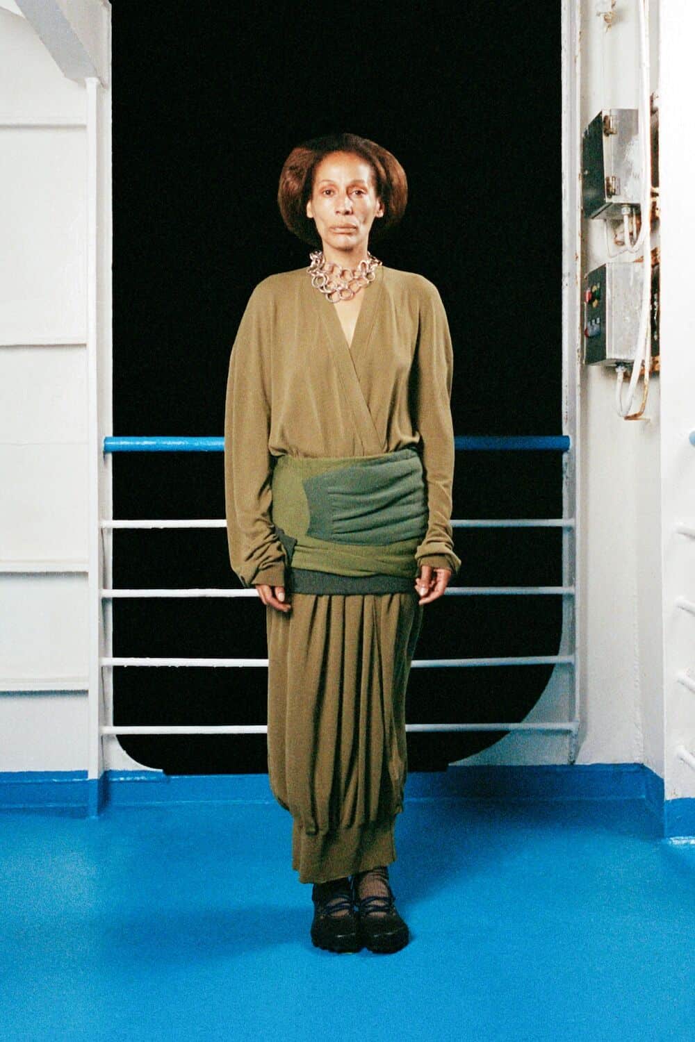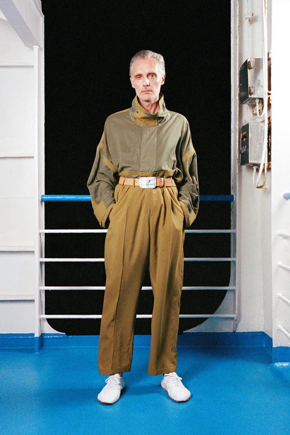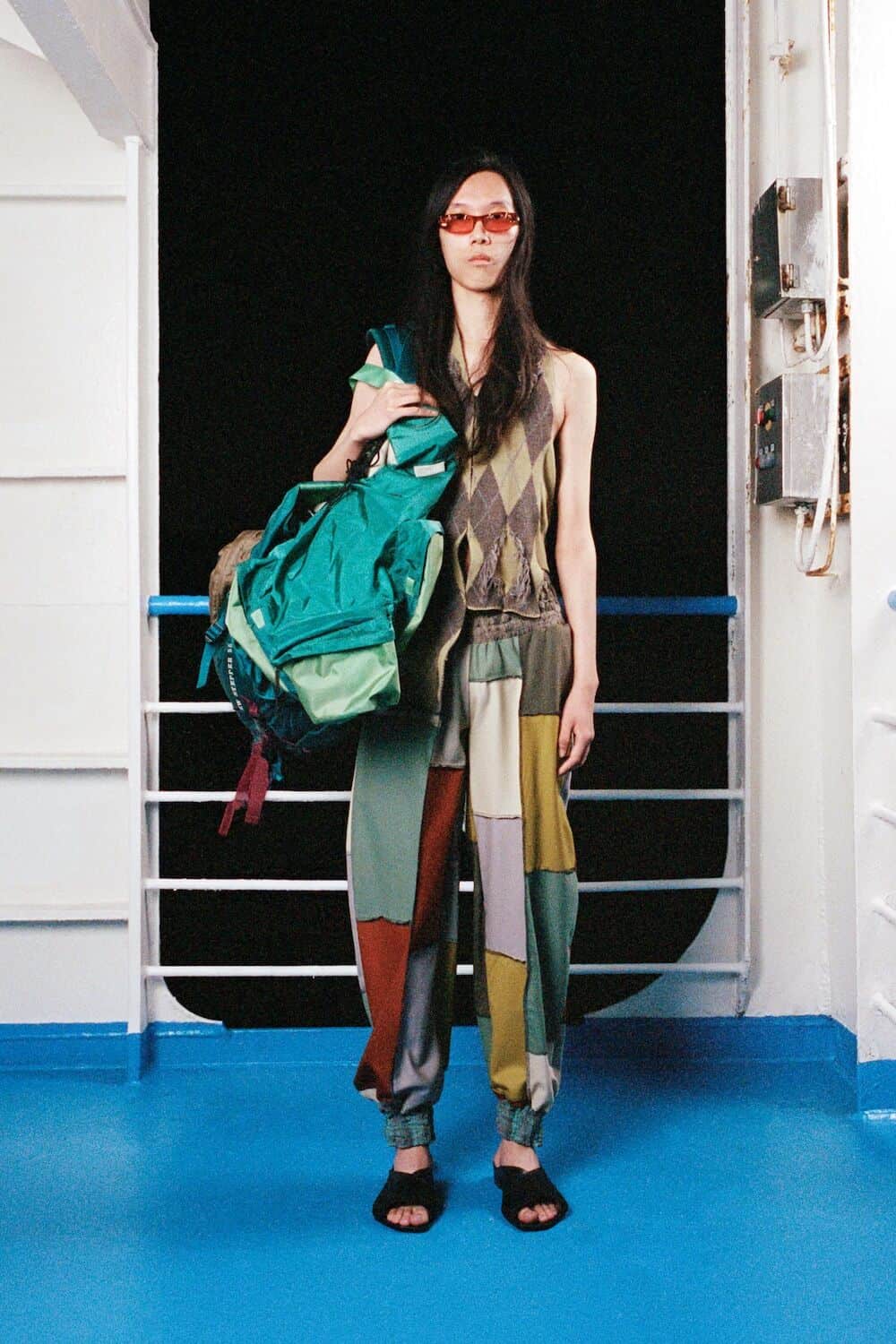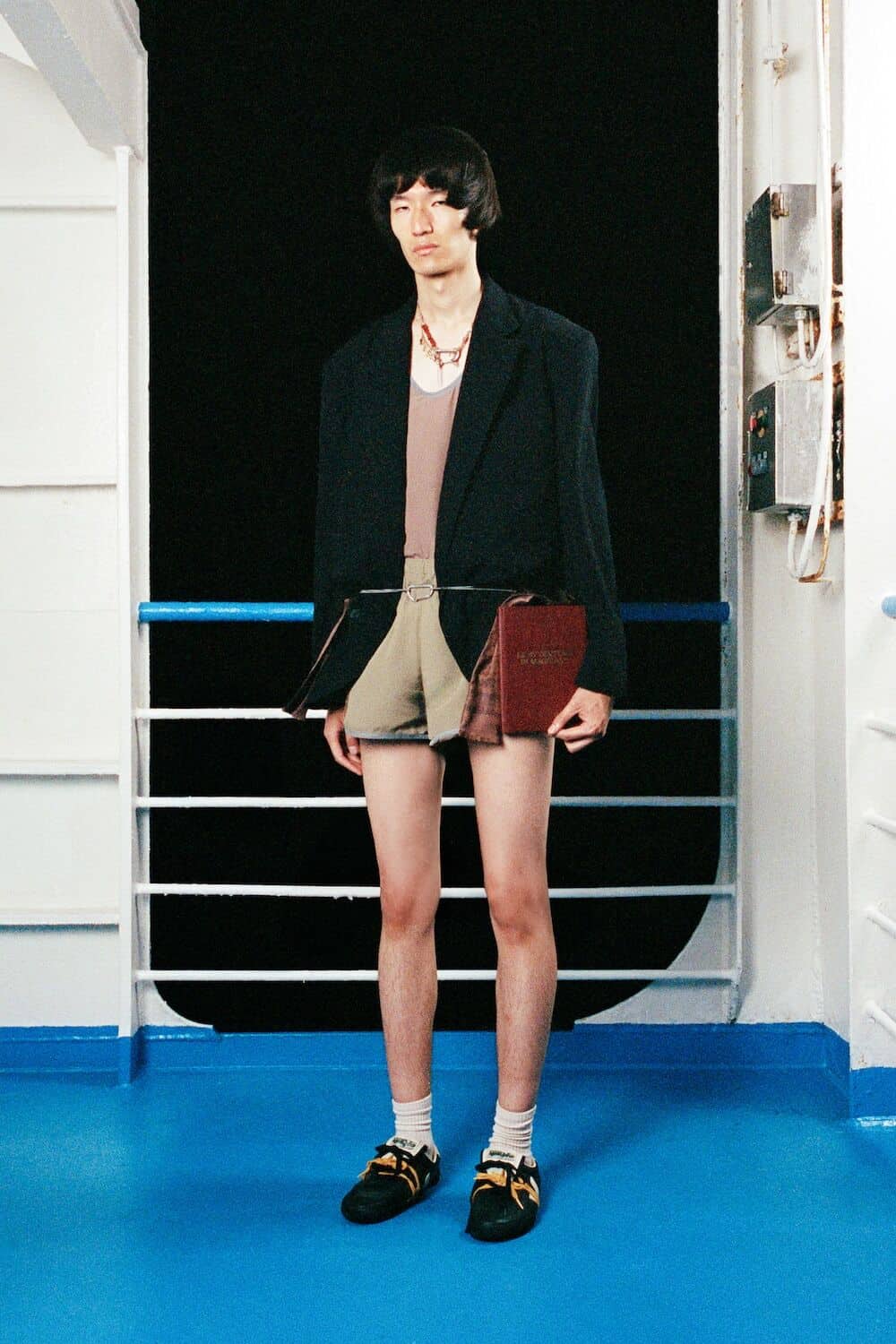 Taking place on a ferry, the scene opens with a man clambering out of a scuffed up double bass case, dashingly dressed in a black suit – collar popped, not a wrinkle in sight. The camera follows him into the parlour of the ship where two eclectic characters discuss their drinks of choice. One wears velvet trousers printed with a denim effect and a boxy button-down shirt; the other sports a brown pinstripe shirt-turned-dress, accessorised with fishnet tights. As Jazz music plays in the background, other guests play cards, tune their instruments or kip on the plush sofas.