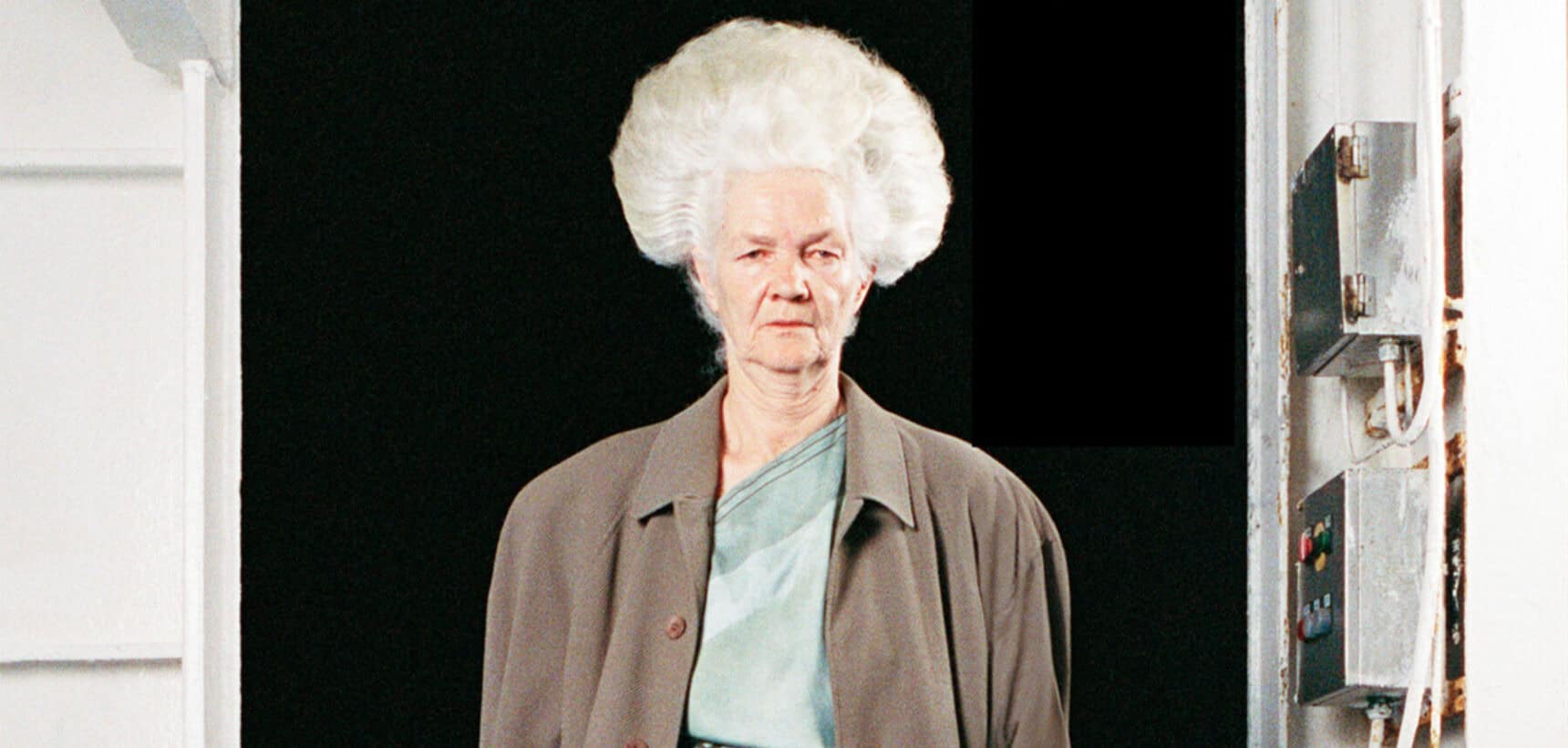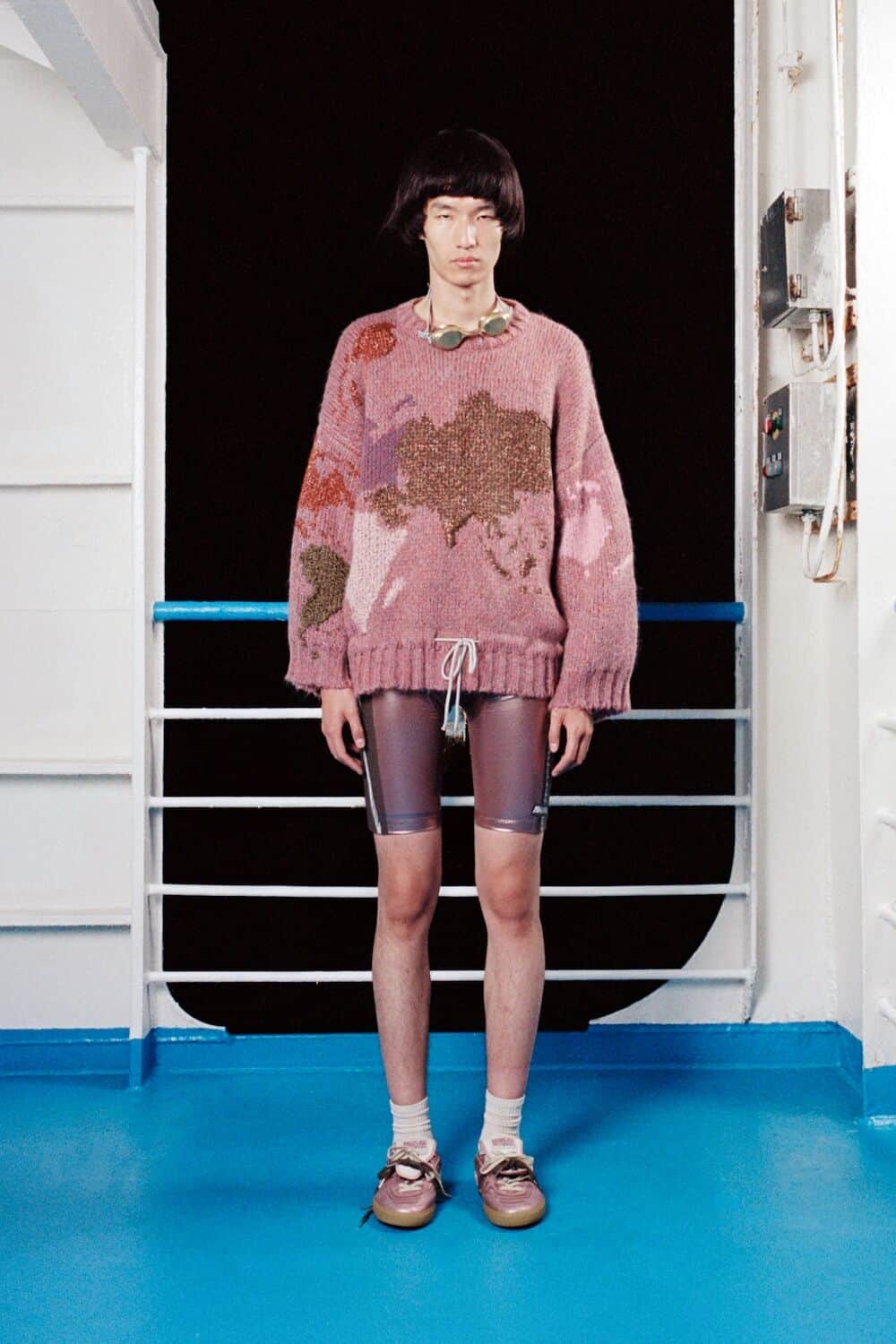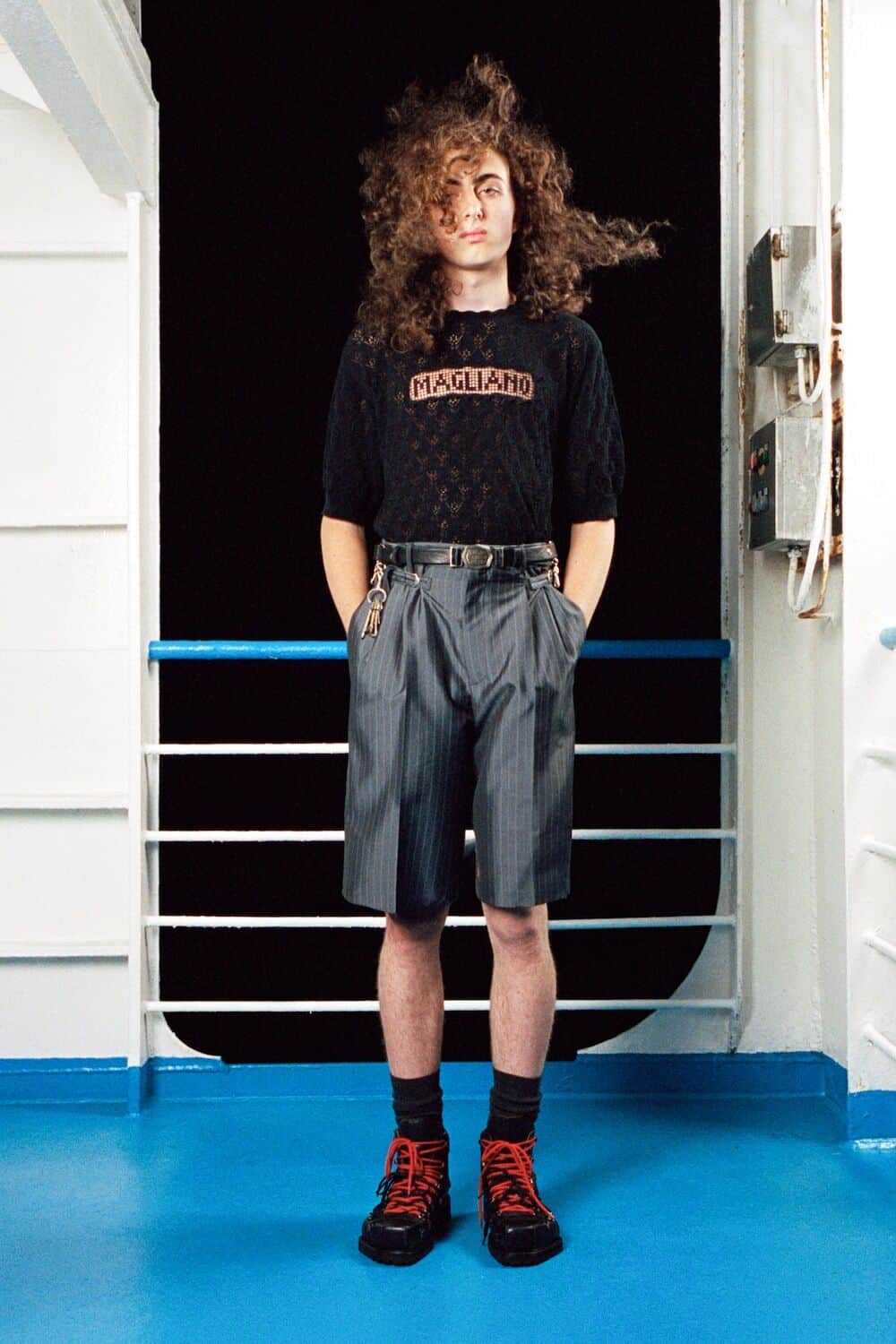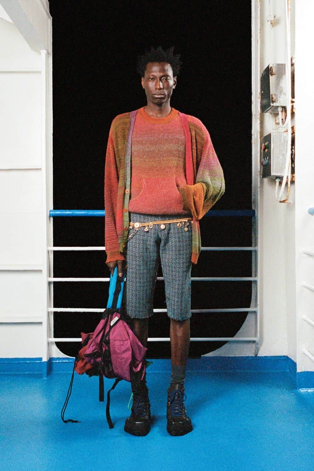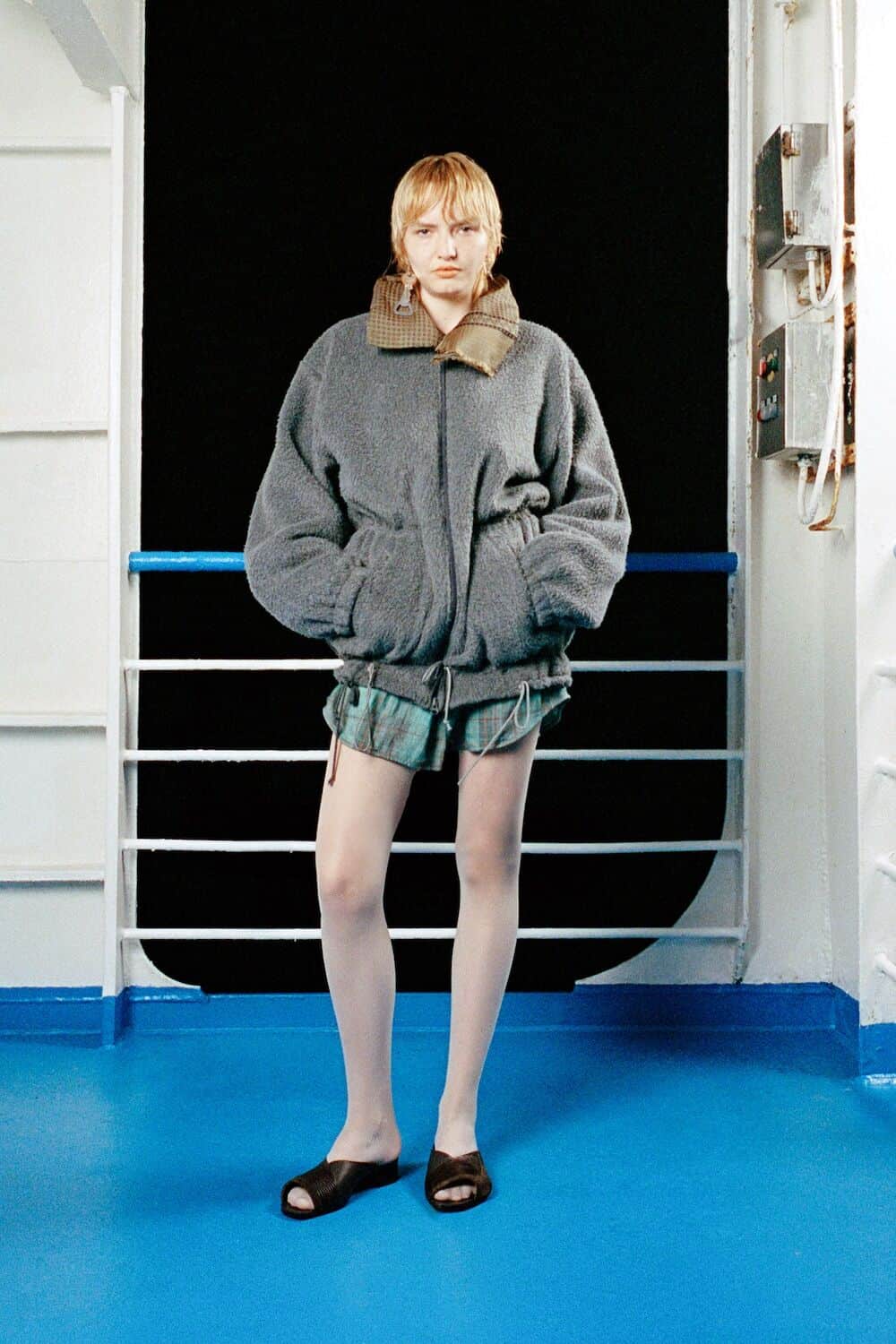 Taking place on a ferry, the scene opens with a man clambering out of a scuffed up double bass case, dashingly dressed in a black suit – collar popped, not a wrinkle in sight. The camera follows him into the parlour of the ship where two eclectic characters discuss their drinks of choice. One wears velvet trousers printed with a denim effect and a boxy button-down shirt; the other sports a brown pinstripe shirt-turned-dress, accessorised with fishnet tights. As Jazz music plays in the background, other guests play cards, tune their instruments or kip on the plush sofas.