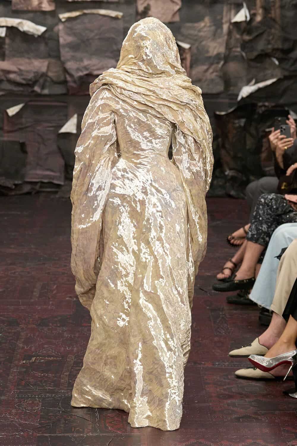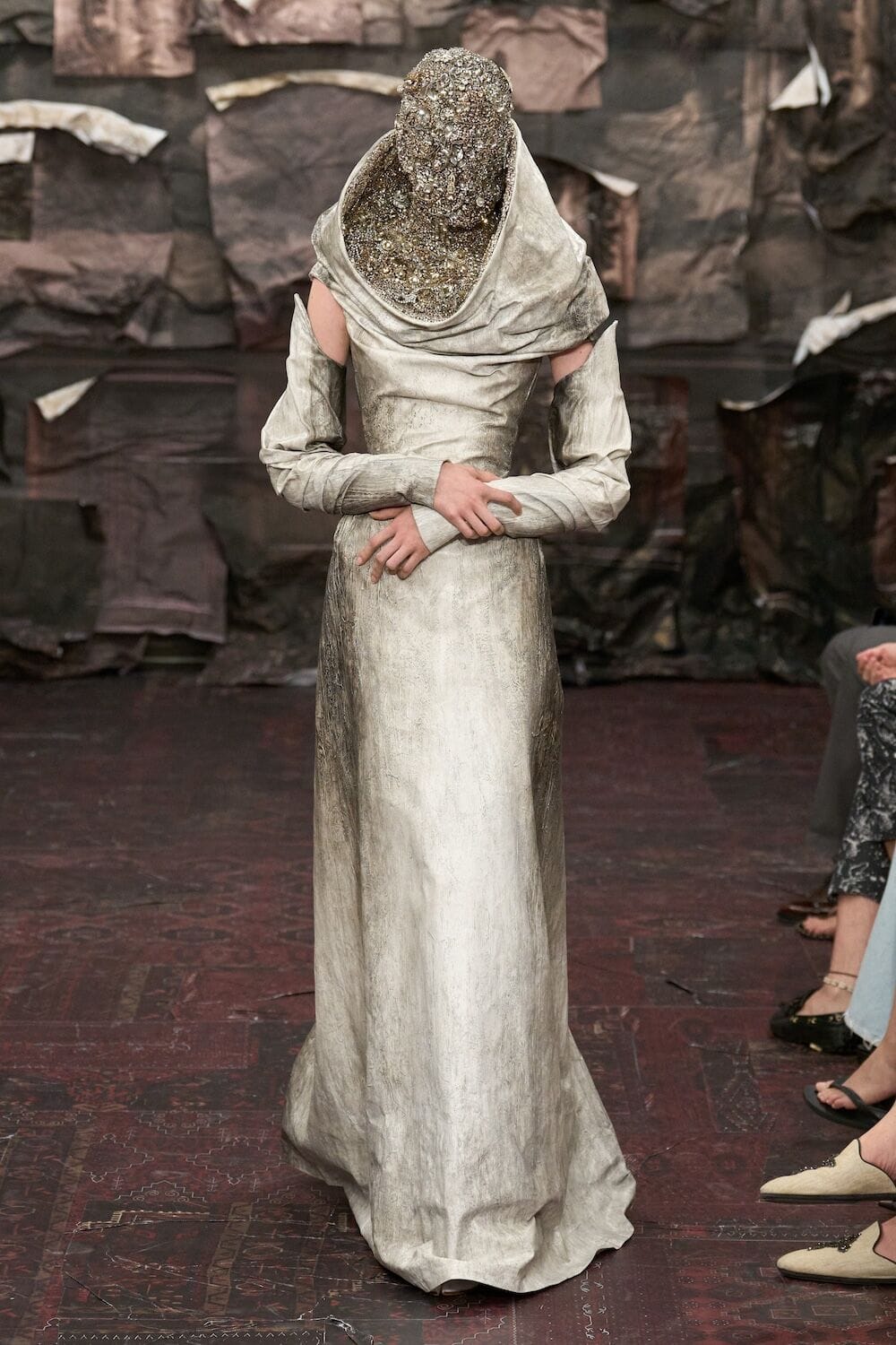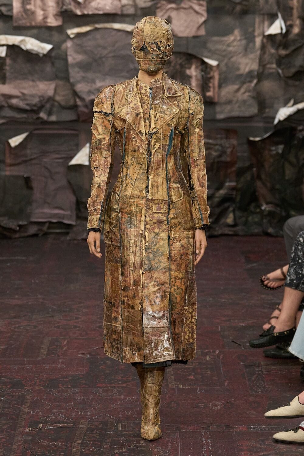 Zombie couture? That idea was reinforced by the cordyceps-style bead-encrusted face covering worn by every model (if you’ve watched The Last of Us, you’ll know). Masked models was a tradition started by the founder who wanted people to look at his clothes, not the girls showing them off. Martens used it to unsettling effect here, with some masks made from battered plate metal as if fragments of a car crash.