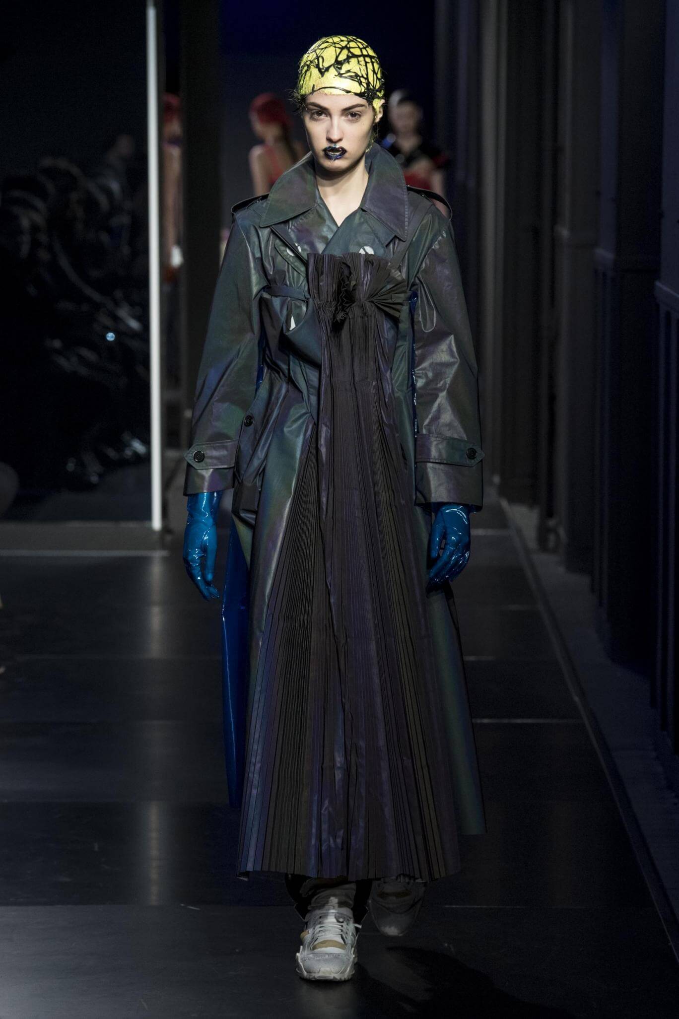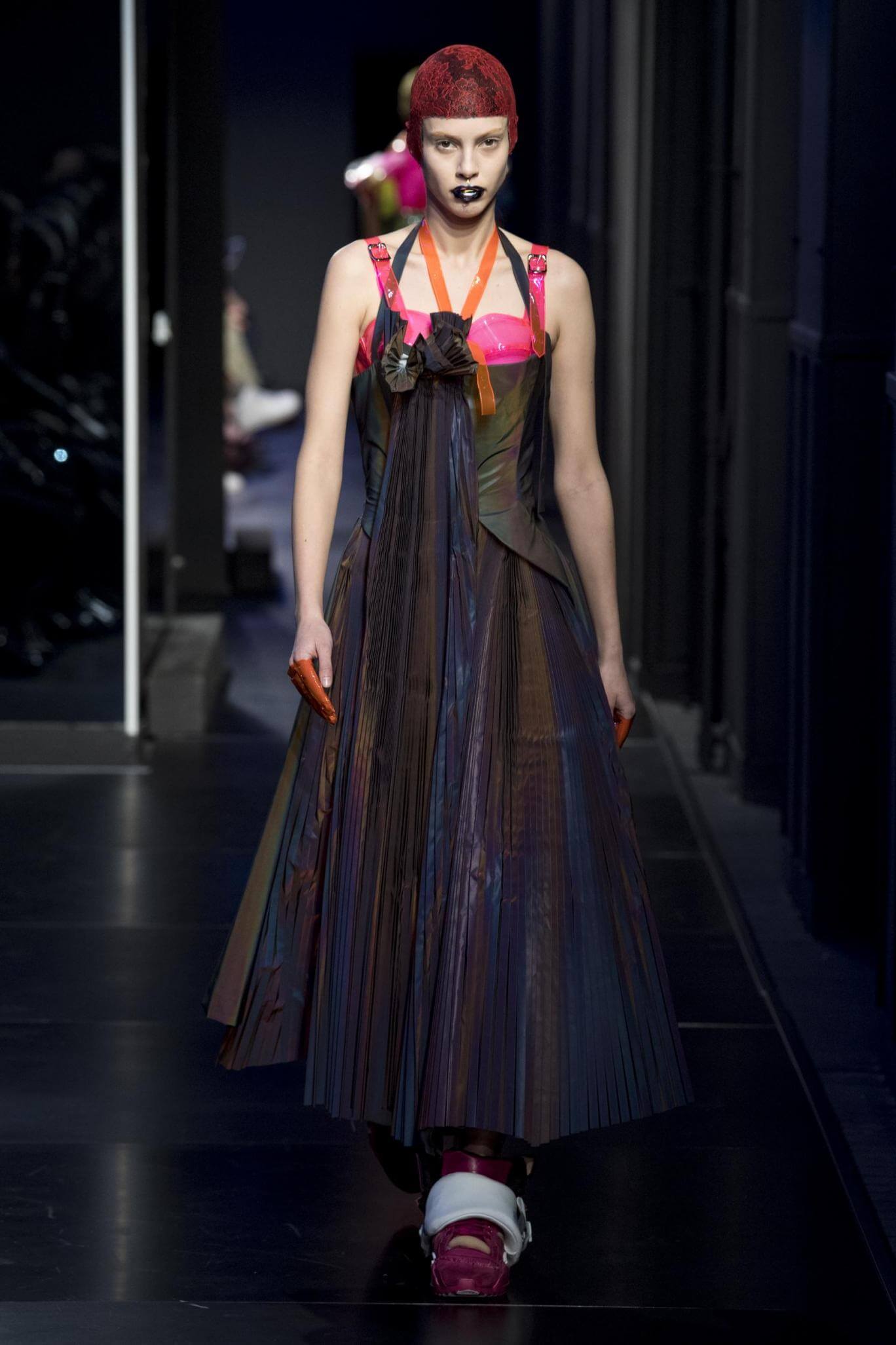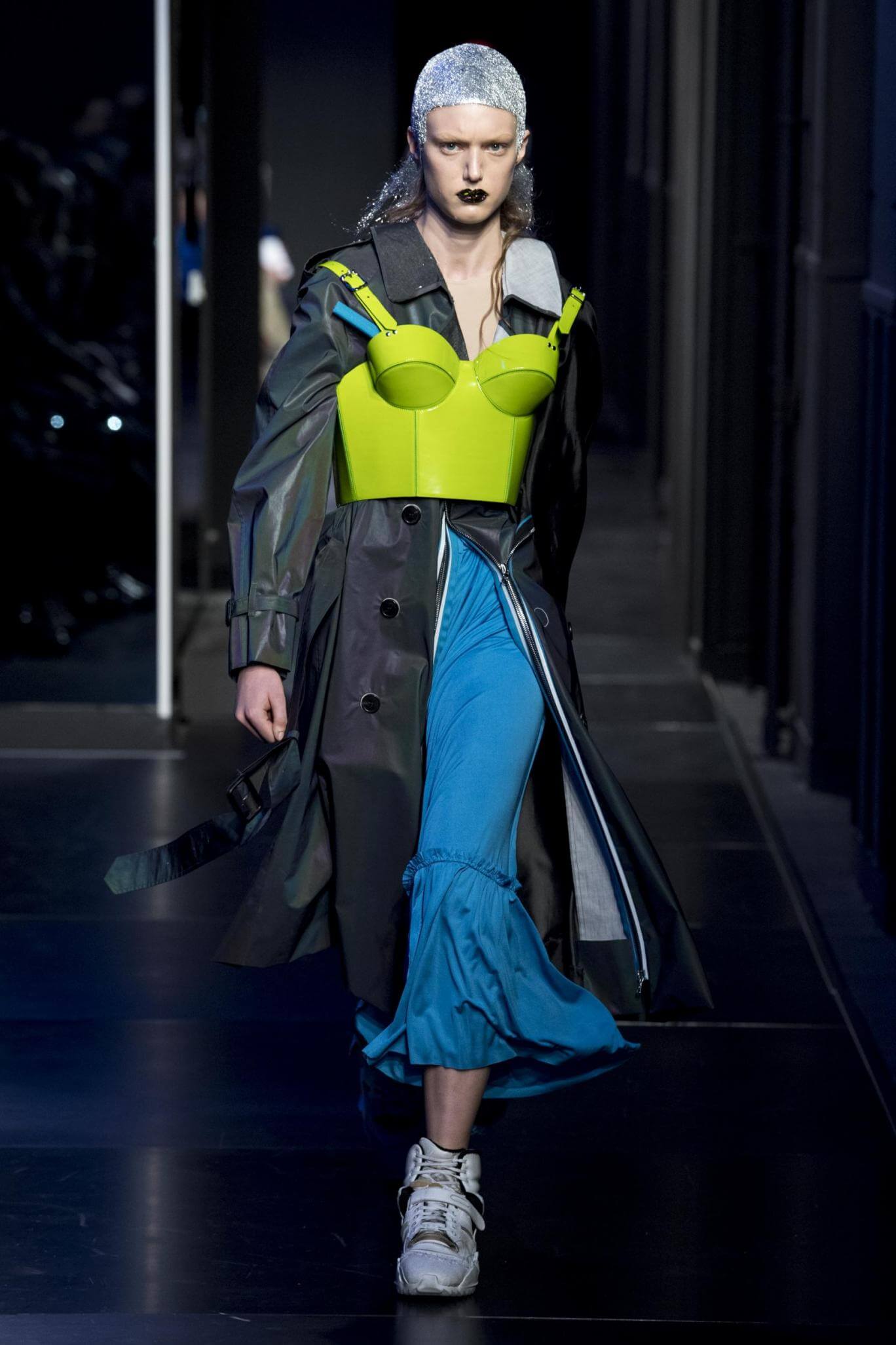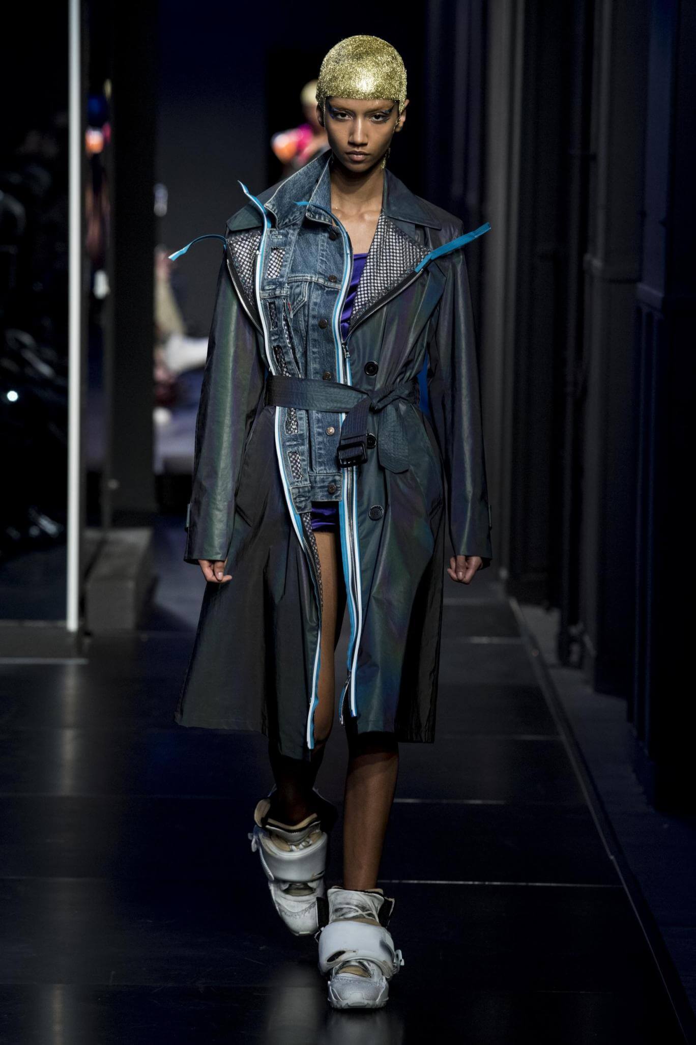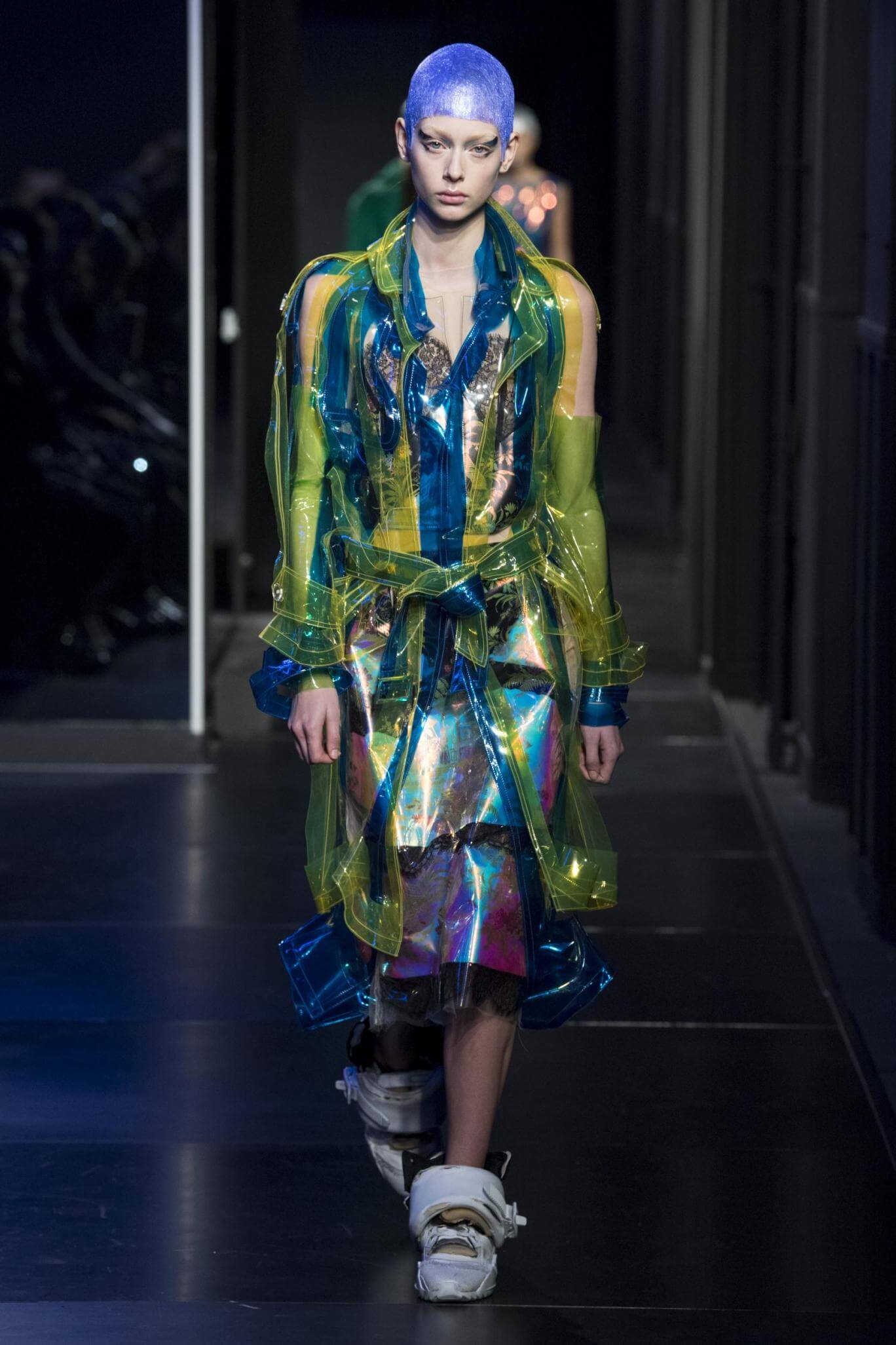 But there is a harmony in all this. We want all that metallic rainbow sheen strobing-under-the-lights-stuff in our lives. We did say we were in the club. Razor sharp knife pleats came to life and plastic trench coats added protection. And then there were sporty modern geisha’s in sneakers, holding iridescent parasols. An etching of femininity in the bras worn war-like on the outside. Inside out, upside down as Margiela has always done it. But wait. Here we must note the black pant suit, the tiny hint of a fashion moment; Martin Margiela’s spirit fused with Galliano’s tailoring. Deep breaths. A remix of Lana Del Rey’s Blue Velvet, got inside our heads, hypnotic. We told you nothing is what it seems. Fantasy challenged reality with textures, prints, layers, puffer jackets morphed into dresses. As Lewis Carroll wrote in Alice’s Adventures in Wonderland: “If I had a world of my own, everything would be nonsense. Nothing would be what it is, because everything would be what it isn’t…You see?” We see. We saw. We like a challenge.