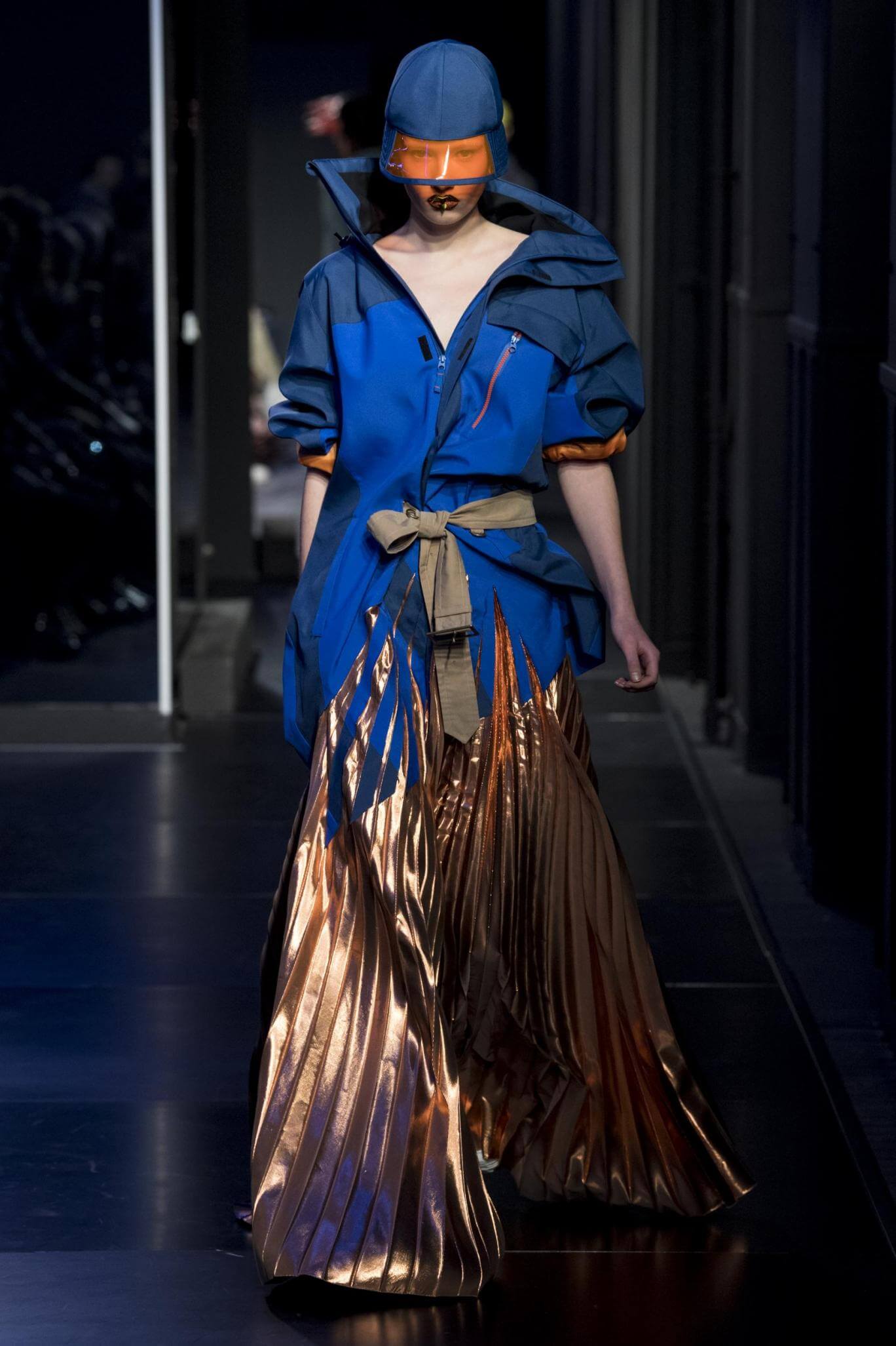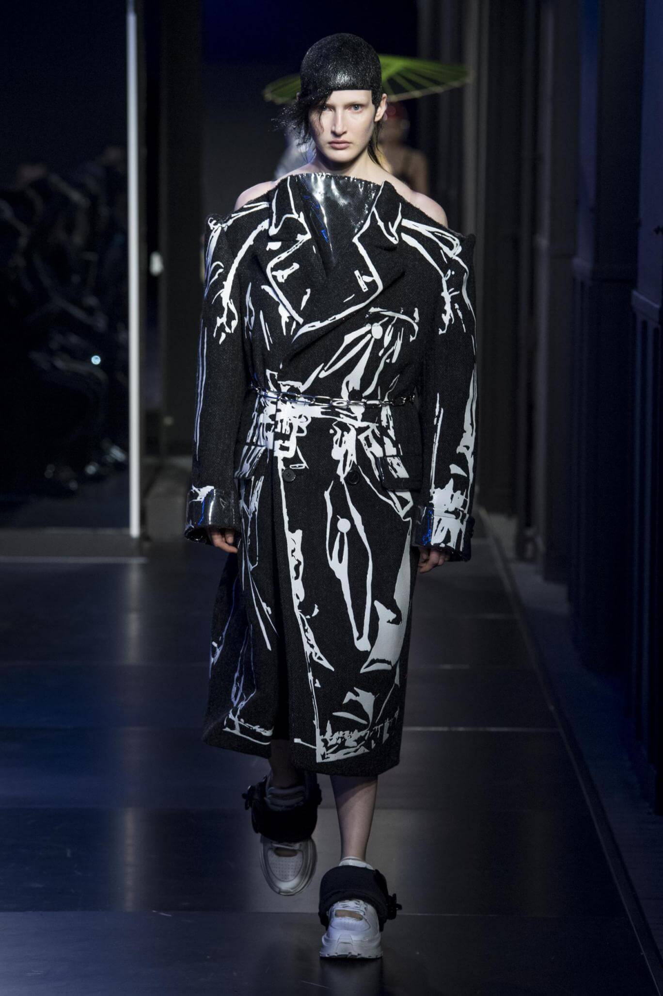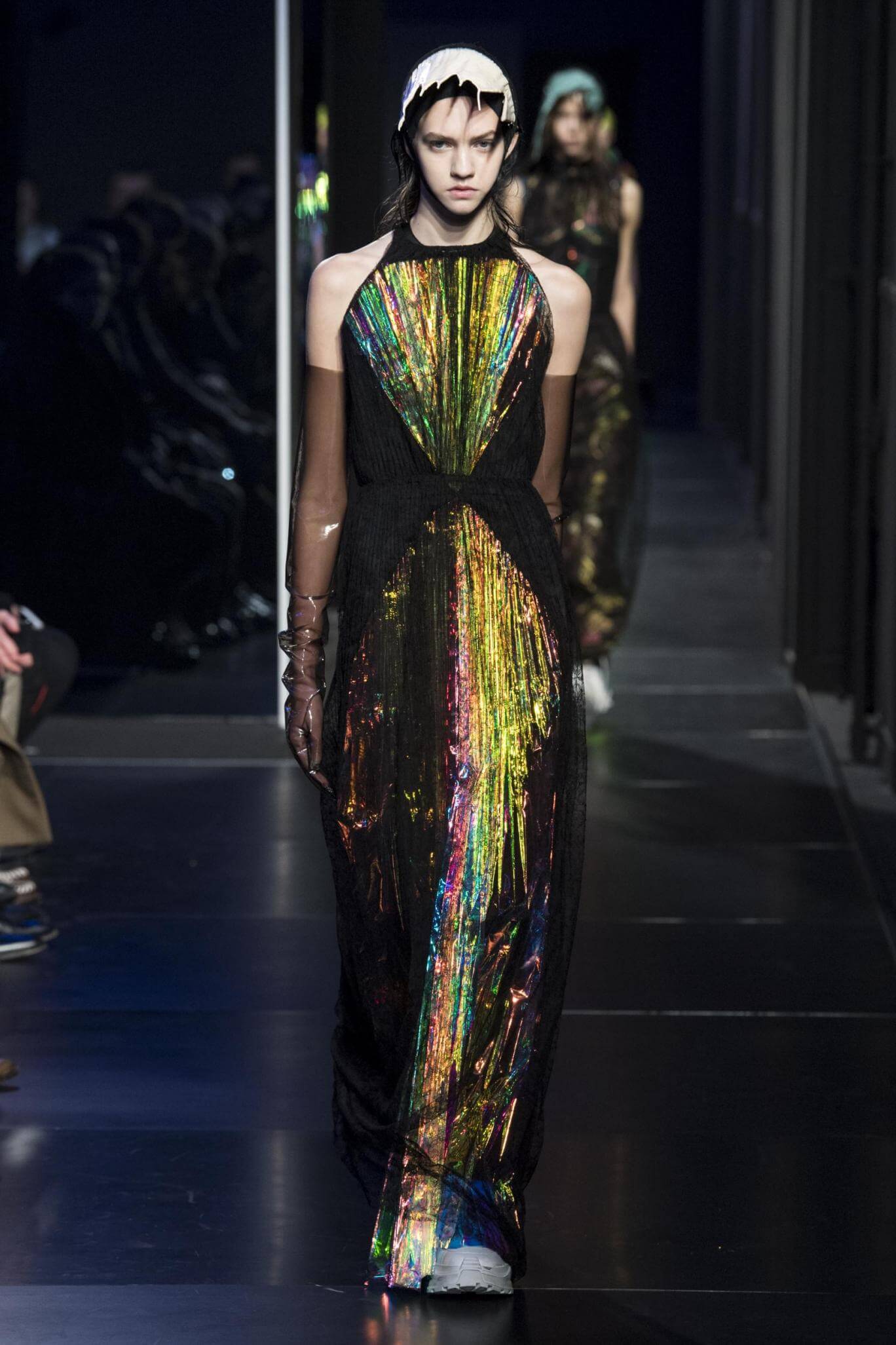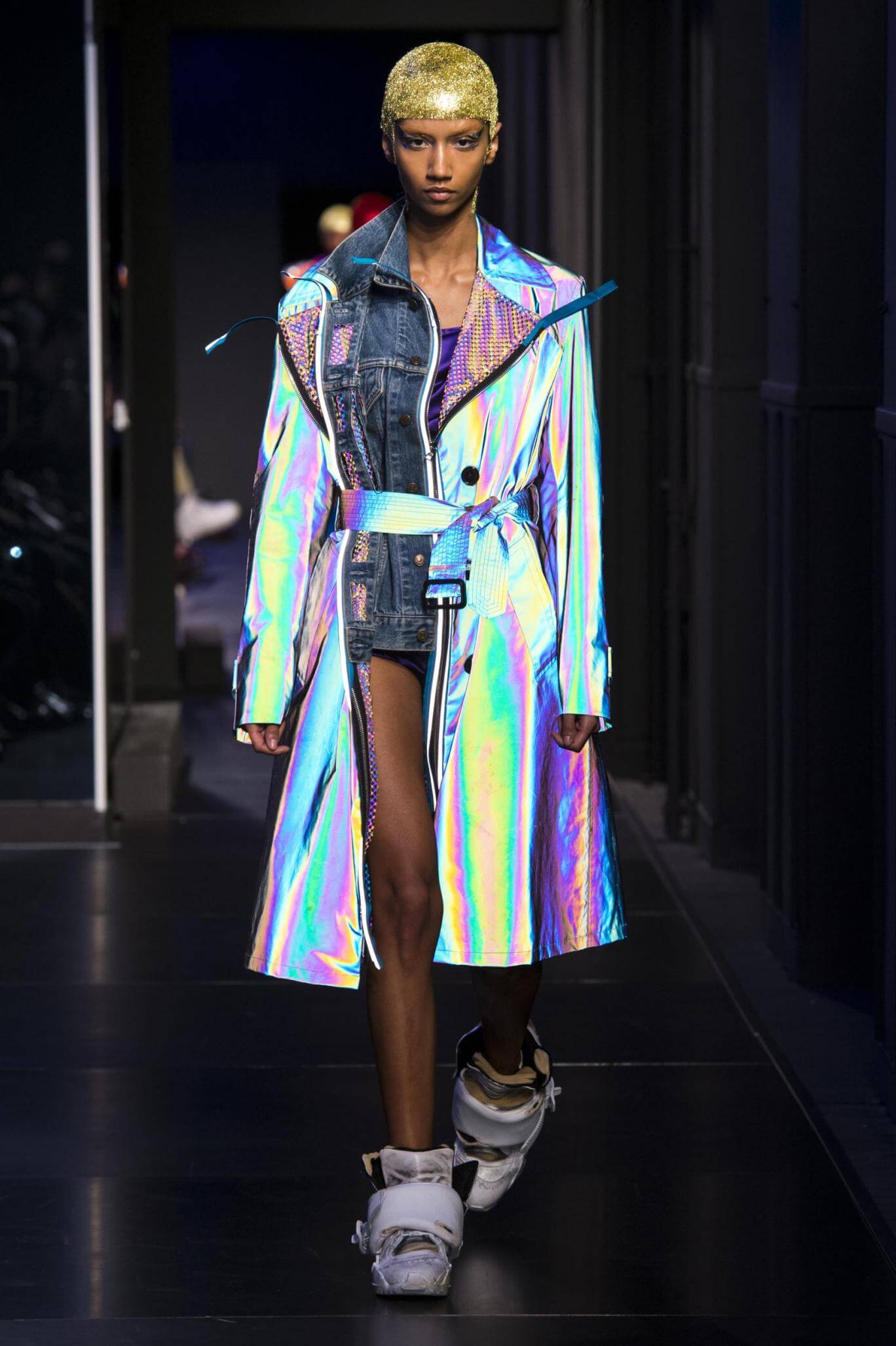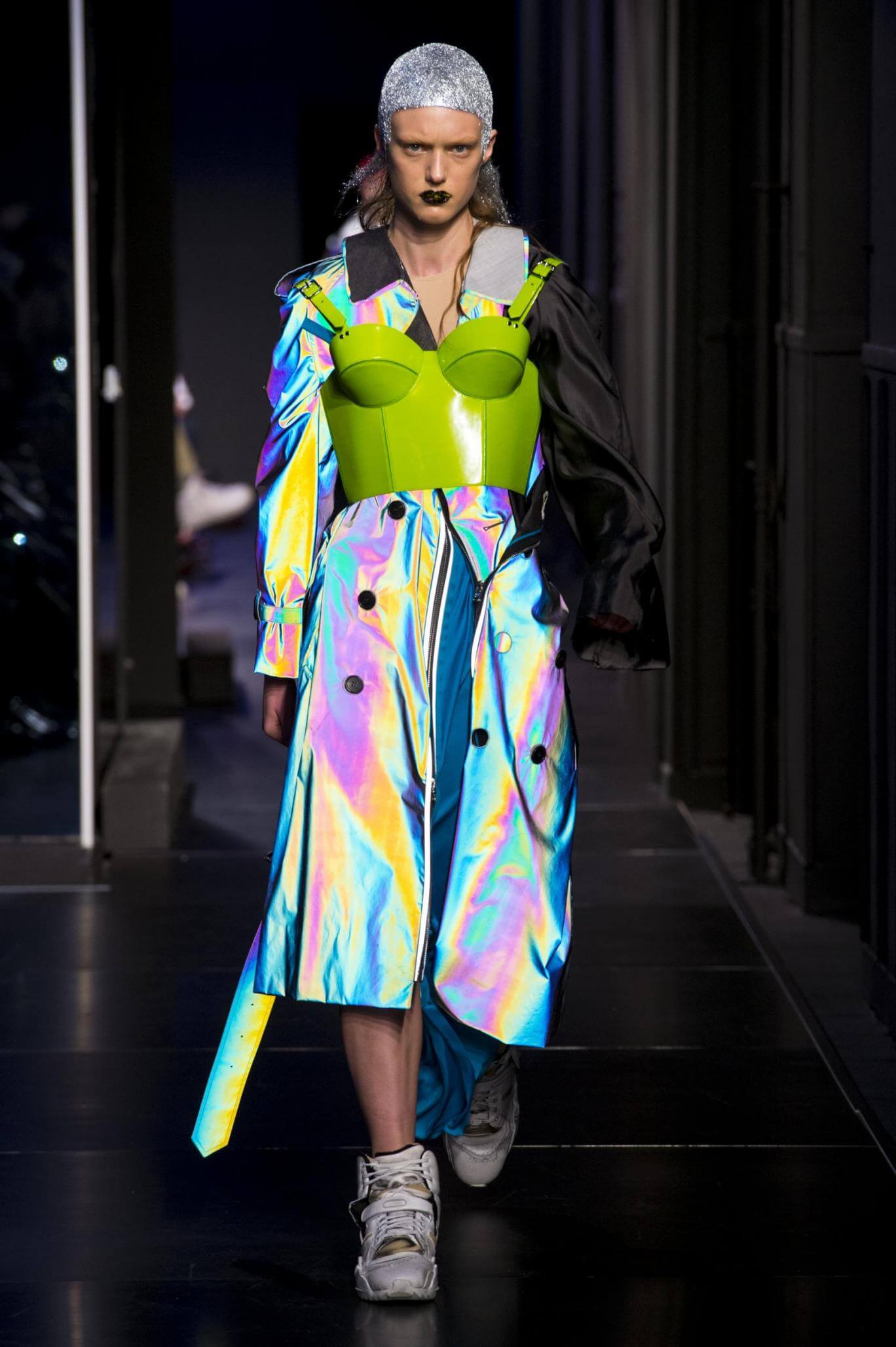 But there is a harmony in all this. We want all that metallic rainbow sheen strobing-under-the-lights-stuff in our lives. We did say we were in the club. Razor sharp knife pleats came to life and plastic trench coats added protection. And then there were sporty modern geisha’s in sneakers, holding iridescent parasols. An etching of femininity in the bras worn war-like on the outside. Inside out, upside down as Margiela has always done it. But wait. Here we must note the black pant suit, the tiny hint of a fashion moment; Martin Margiela’s spirit fused with Galliano’s tailoring. Deep breaths. A remix of Lana Del Rey’s Blue Velvet, got inside our heads, hypnotic. We told you nothing is what it seems. Fantasy challenged reality with textures, prints, layers, puffer jackets morphed into dresses. As Lewis Carroll wrote in Alice’s Adventures in Wonderland: “If I had a world of my own, everything would be nonsense. Nothing would be what it is, because everything would be what it isn’t…You see?” We see. We saw. We like a challenge.