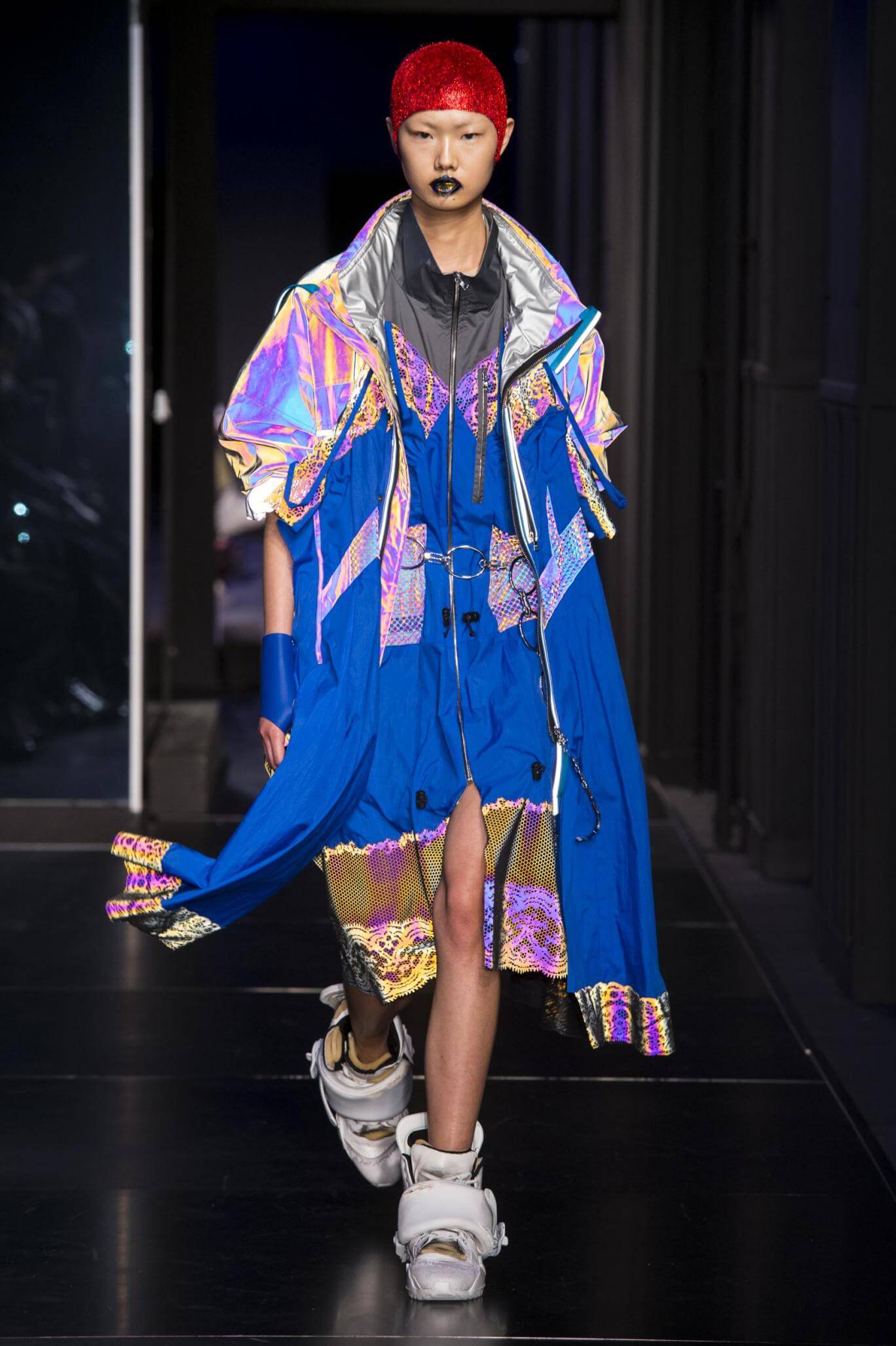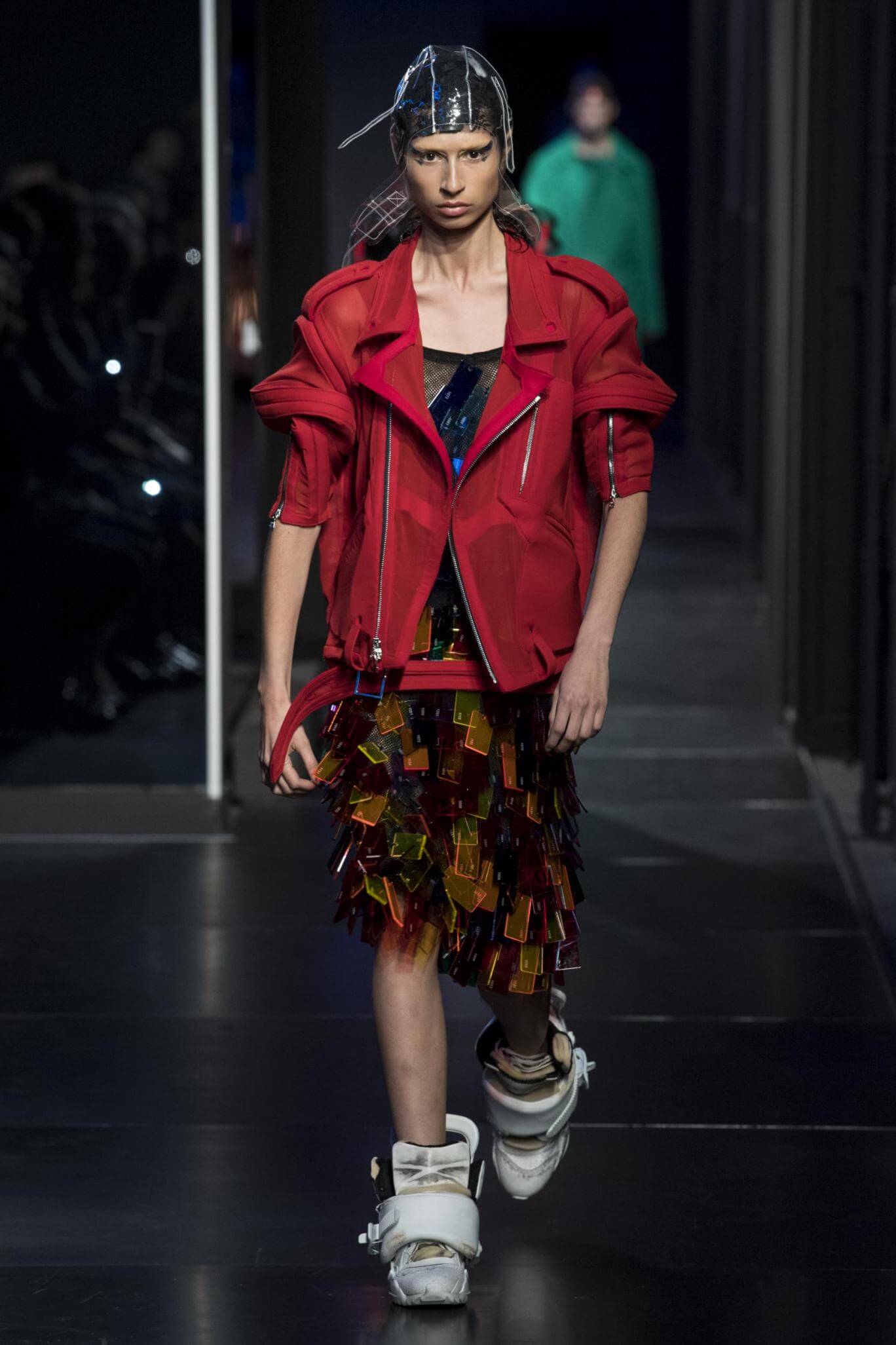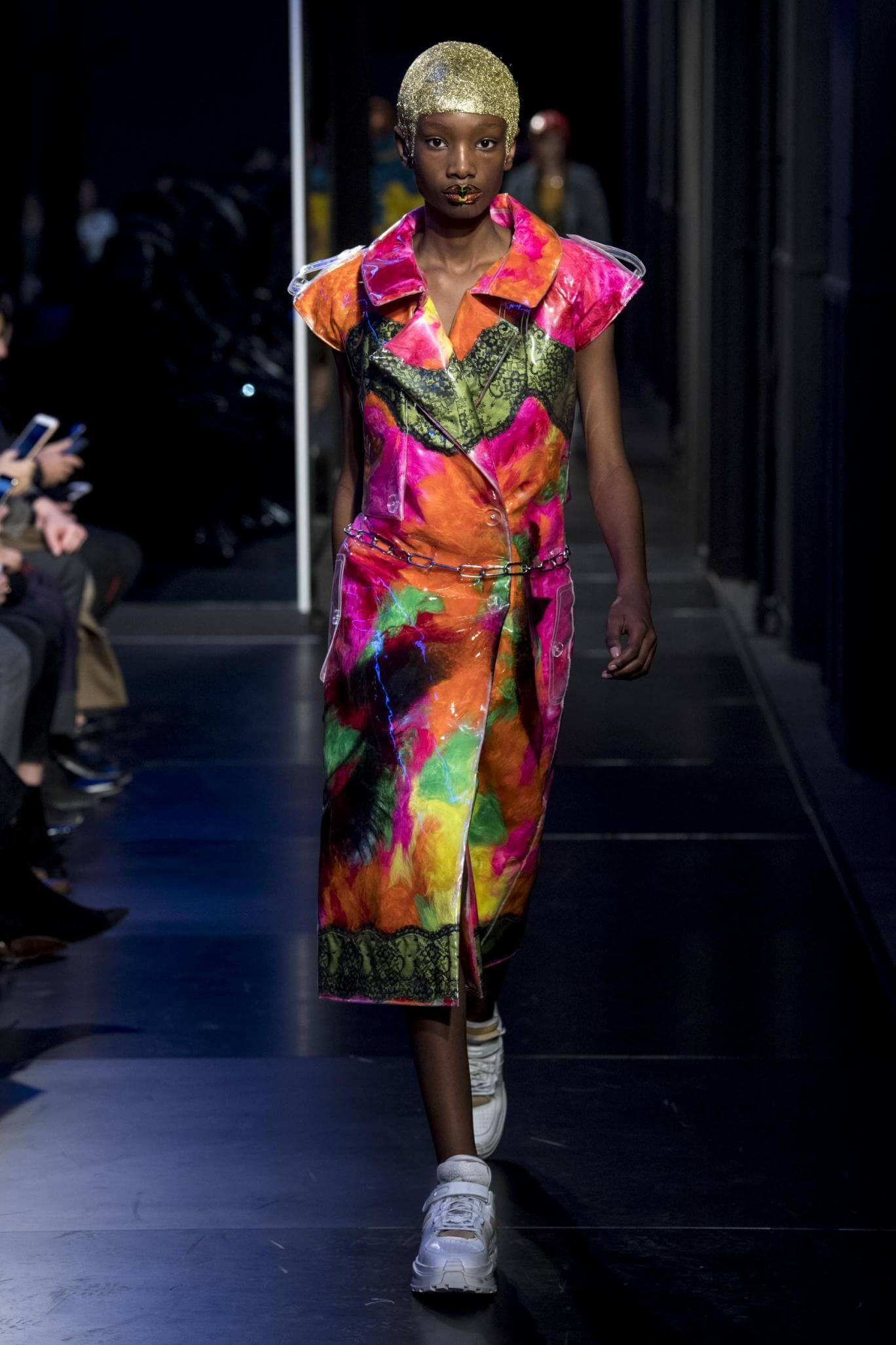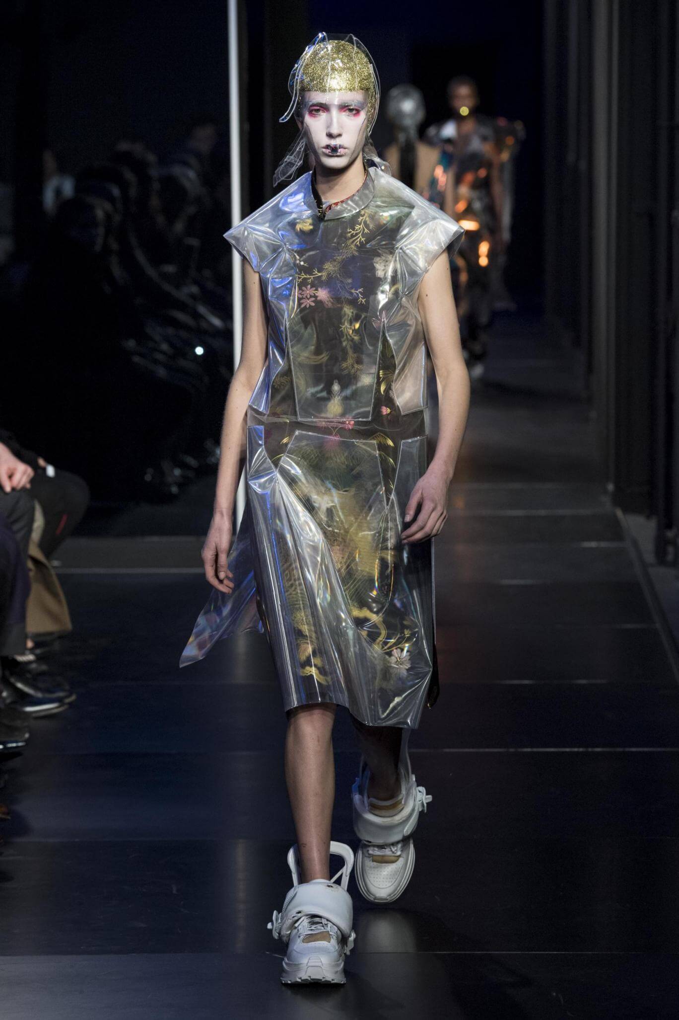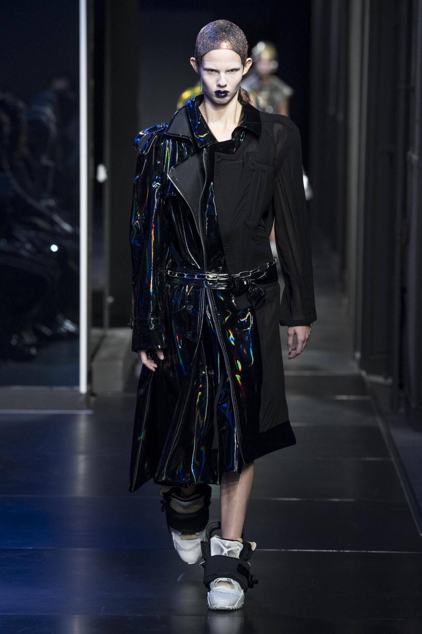 But there is a harmony in all this. We want all that metallic rainbow sheen strobing-under-the-lights-stuff in our lives. We did say we were in the club. Razor sharp knife pleats came to life and plastic trench coats added protection. And then there were sporty modern geisha’s in sneakers, holding iridescent parasols. An etching of femininity in the bras worn war-like on the outside. Inside out, upside down as Margiela has always done it. But wait. Here we must note the black pant suit, the tiny hint of a fashion moment; Martin Margiela’s spirit fused with Galliano’s tailoring. Deep breaths. A remix of Lana Del Rey’s Blue Velvet, got inside our heads, hypnotic. We told you nothing is what it seems. Fantasy challenged reality with textures, prints, layers, puffer jackets morphed into dresses. As Lewis Carroll wrote in Alice’s Adventures in Wonderland: “If I had a world of my own, everything would be nonsense. Nothing would be what it is, because everything would be what it isn’t…You see?” We see. We saw. We like a challenge.
