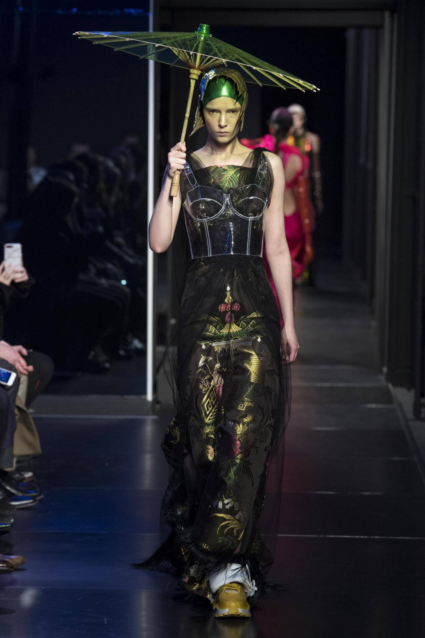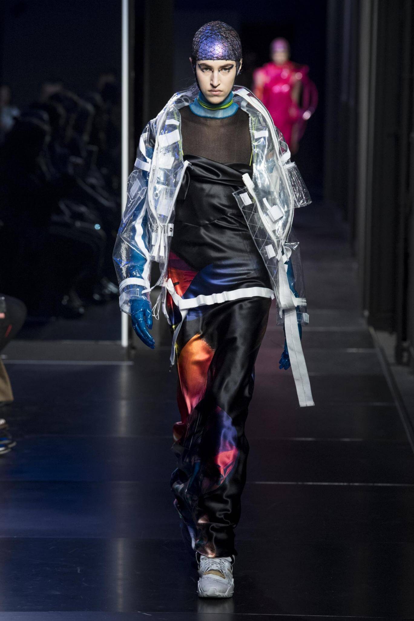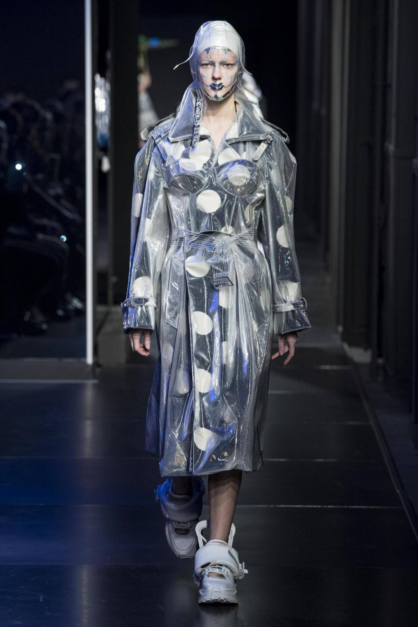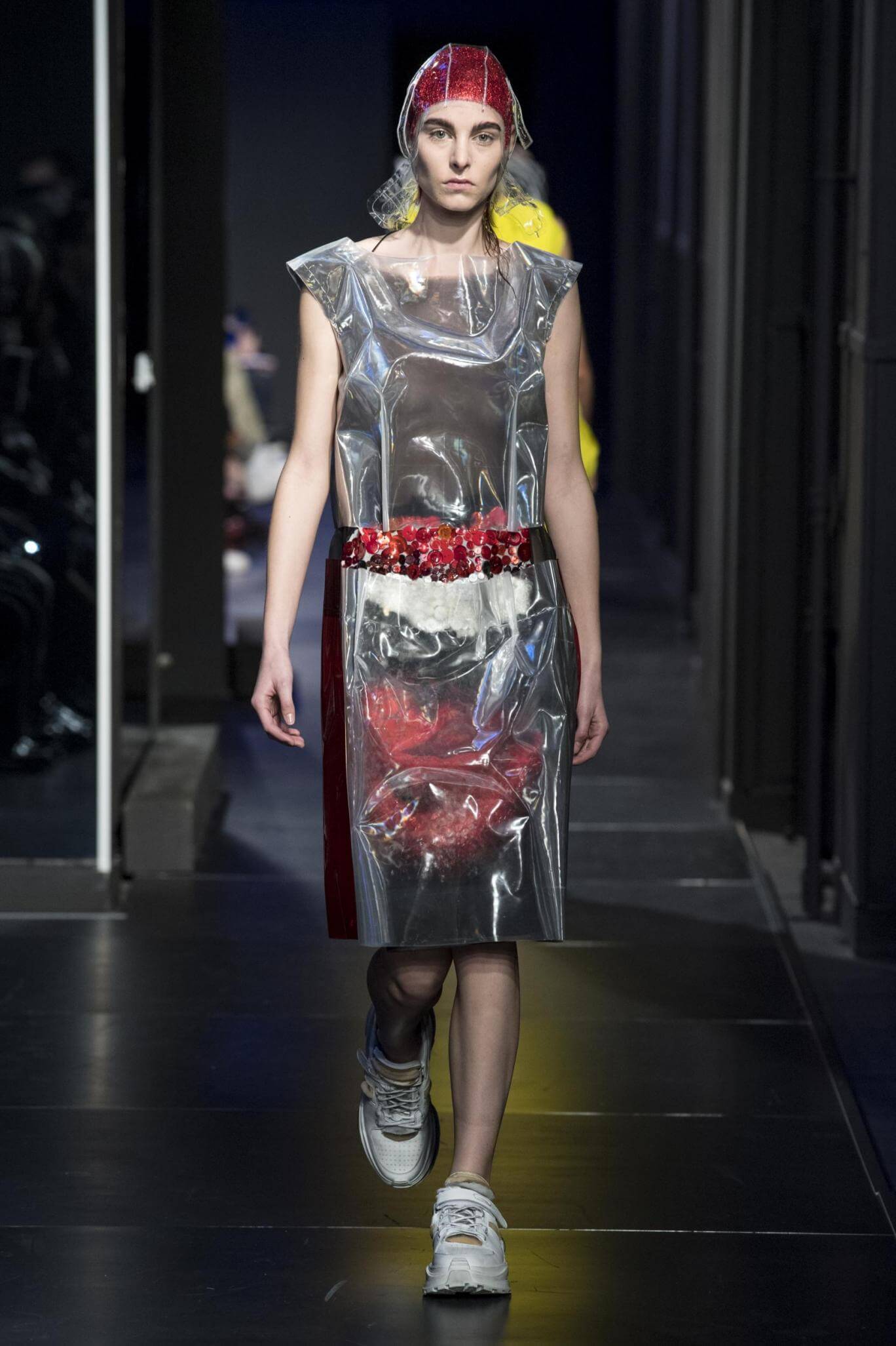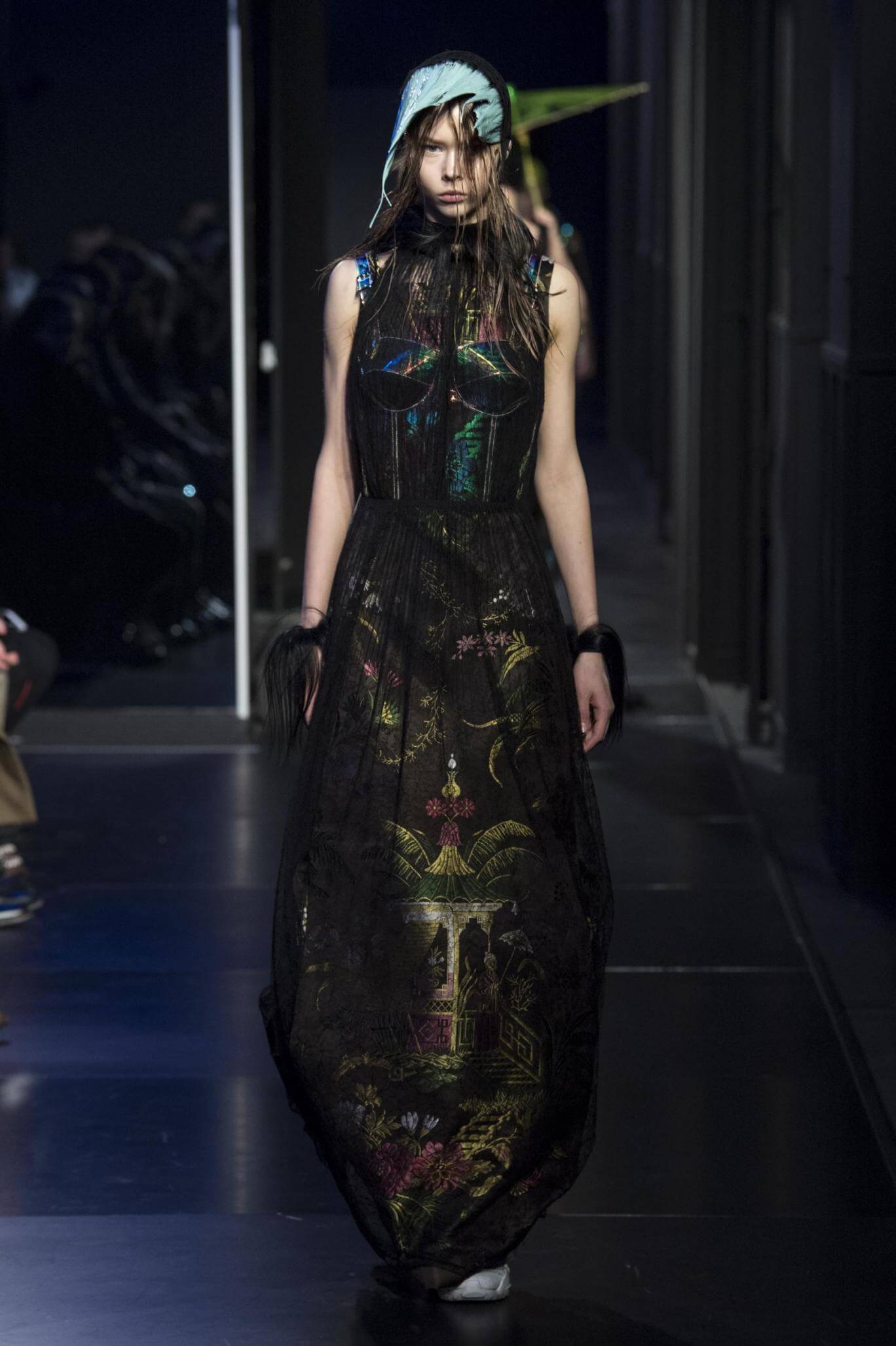 But there is a harmony in all this. We want all that metallic rainbow sheen strobing-under-the-lights-stuff in our lives. We did say we were in the club. Razor sharp knife pleats came to life and plastic trench coats added protection. And then there were sporty modern geisha’s in sneakers, holding iridescent parasols. An etching of femininity in the bras worn war-like on the outside. Inside out, upside down as Margiela has always done it. But wait. Here we must note the black pant suit, the tiny hint of a fashion moment; Martin Margiela’s spirit fused with Galliano’s tailoring. Deep breaths. A remix of Lana Del Rey’s Blue Velvet, got inside our heads, hypnotic. We told you nothing is what it seems. Fantasy challenged reality with textures, prints, layers, puffer jackets morphed into dresses. As Lewis Carroll wrote in Alice’s Adventures in Wonderland: “If I had a world of my own, everything would be nonsense. Nothing would be what it is, because everything would be what it isn’t…You see?” We see. We saw. We like a challenge.