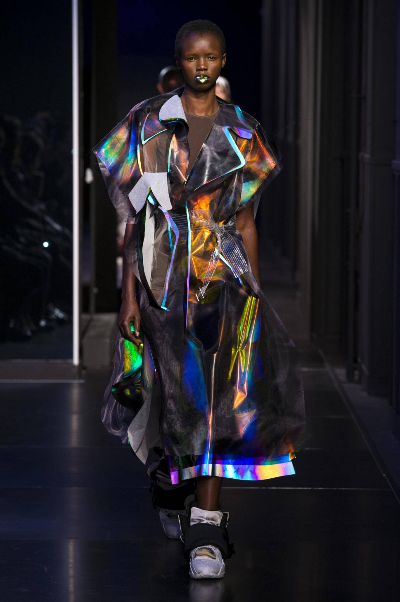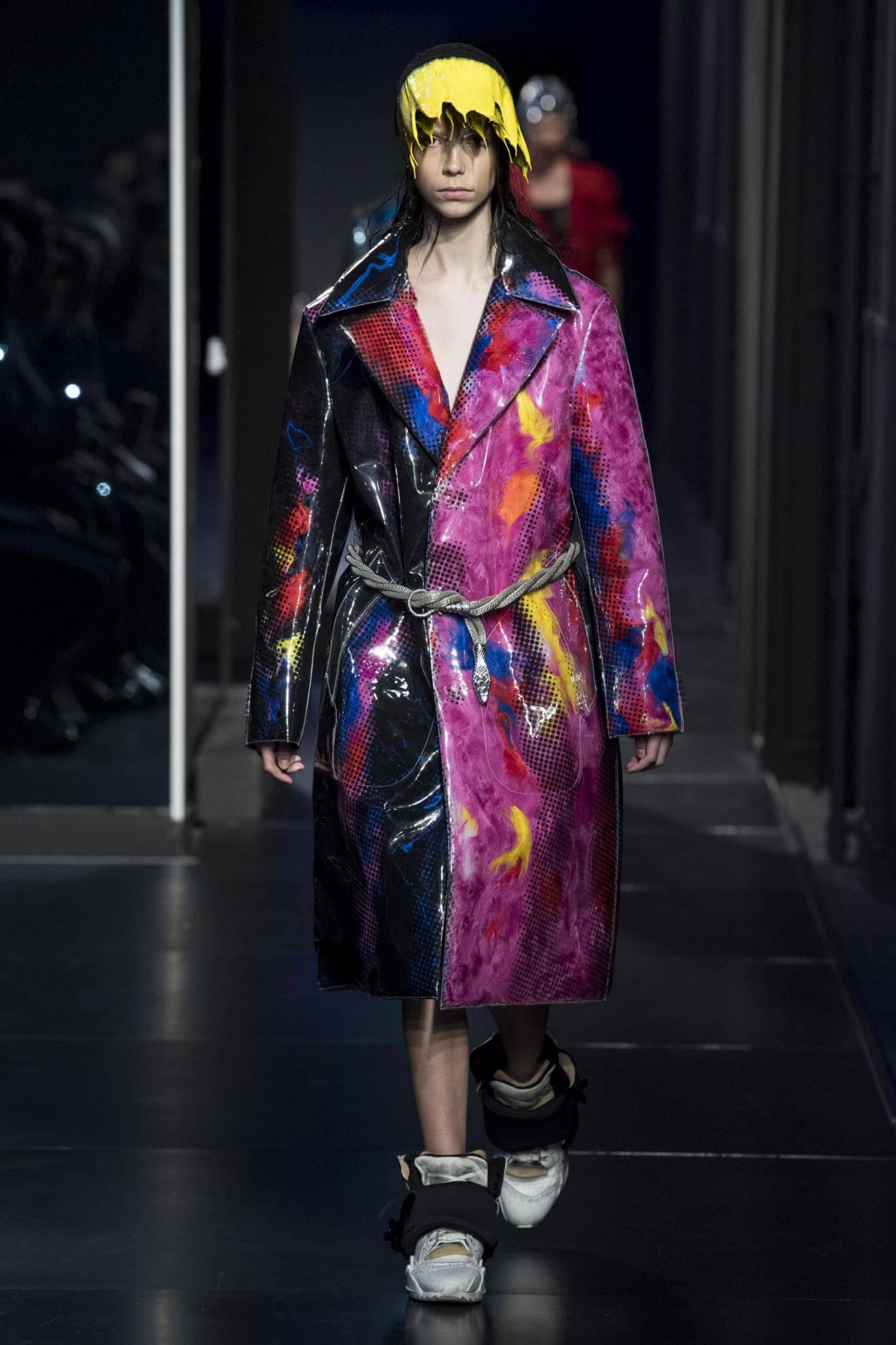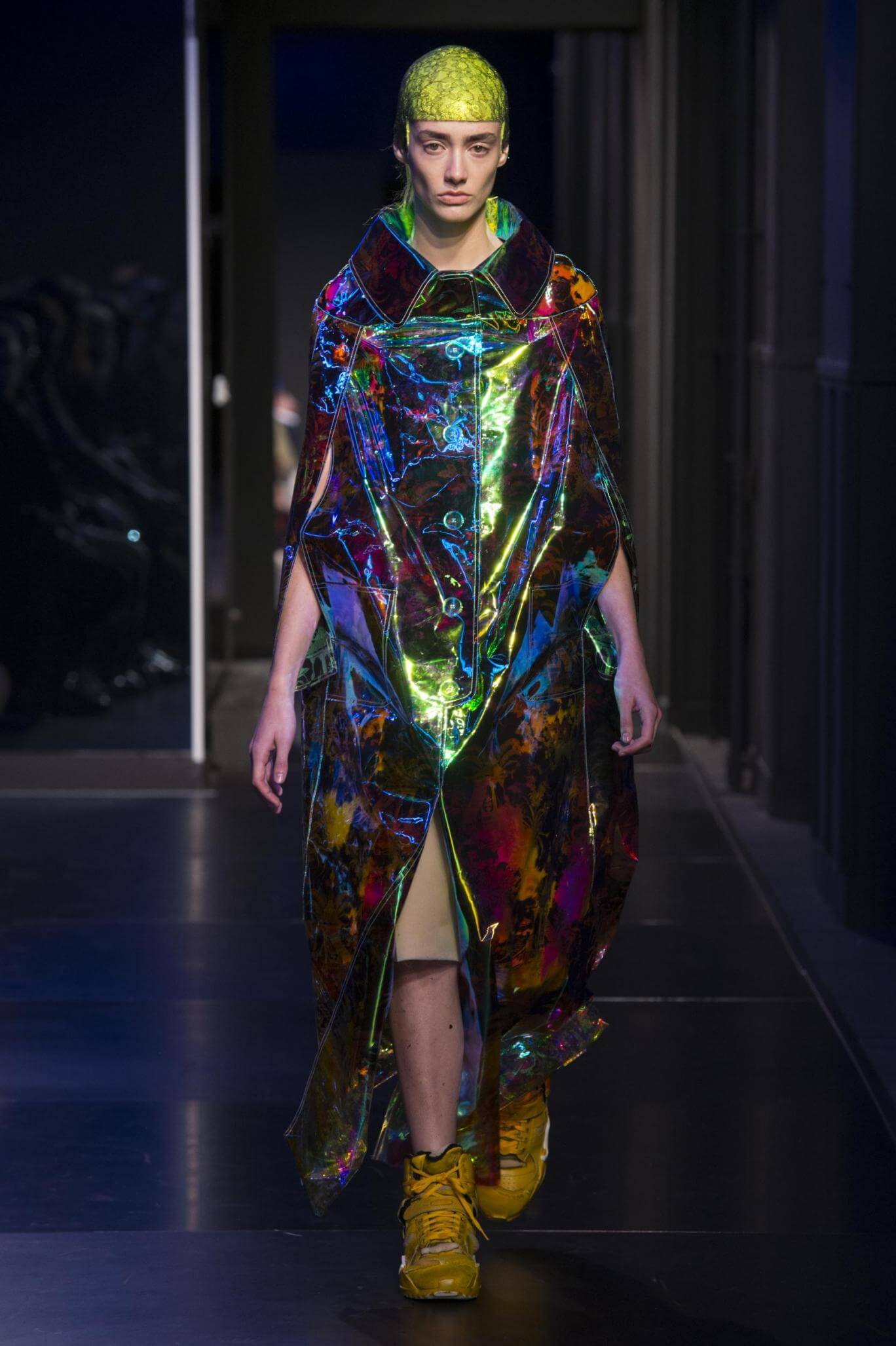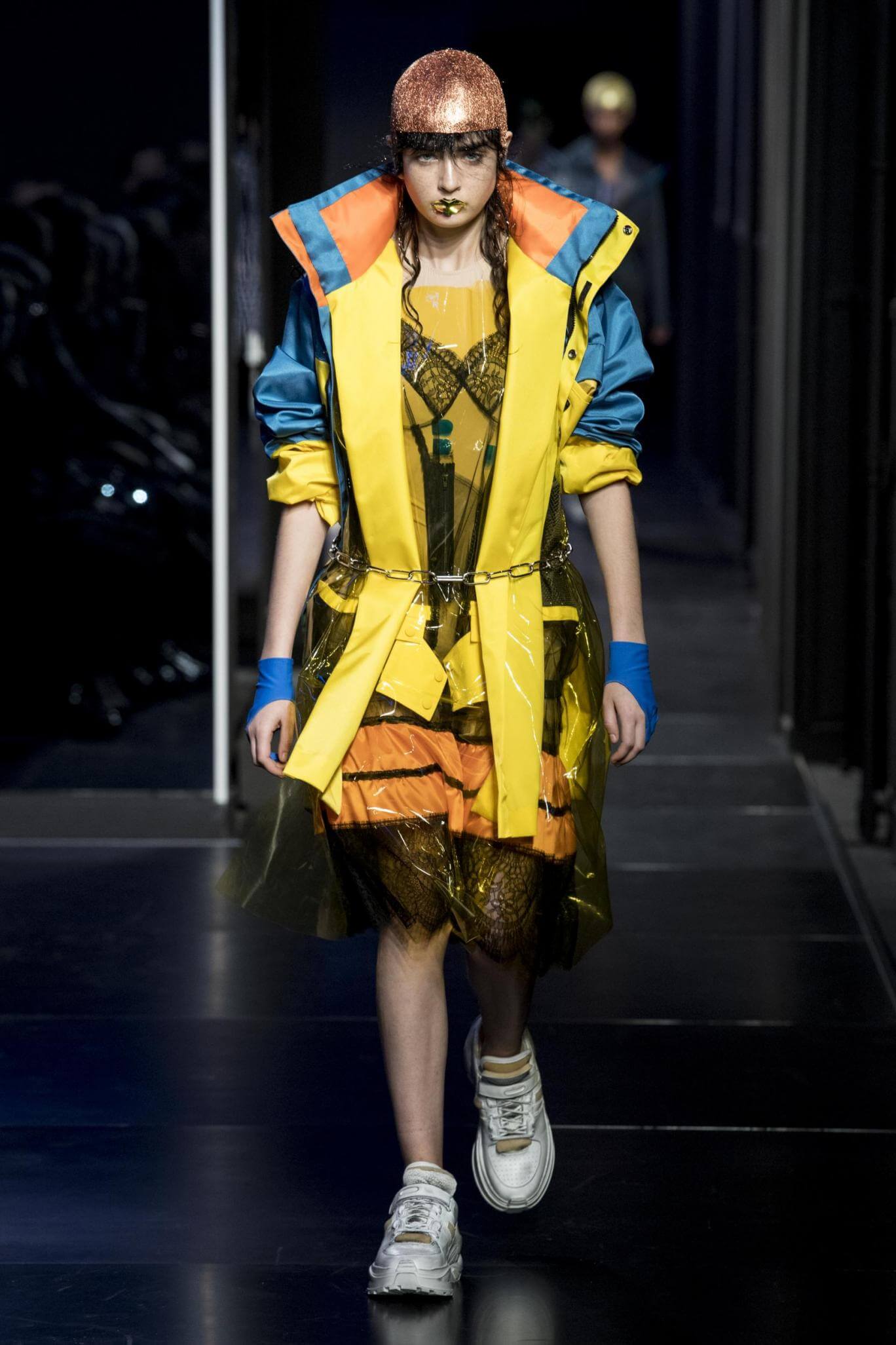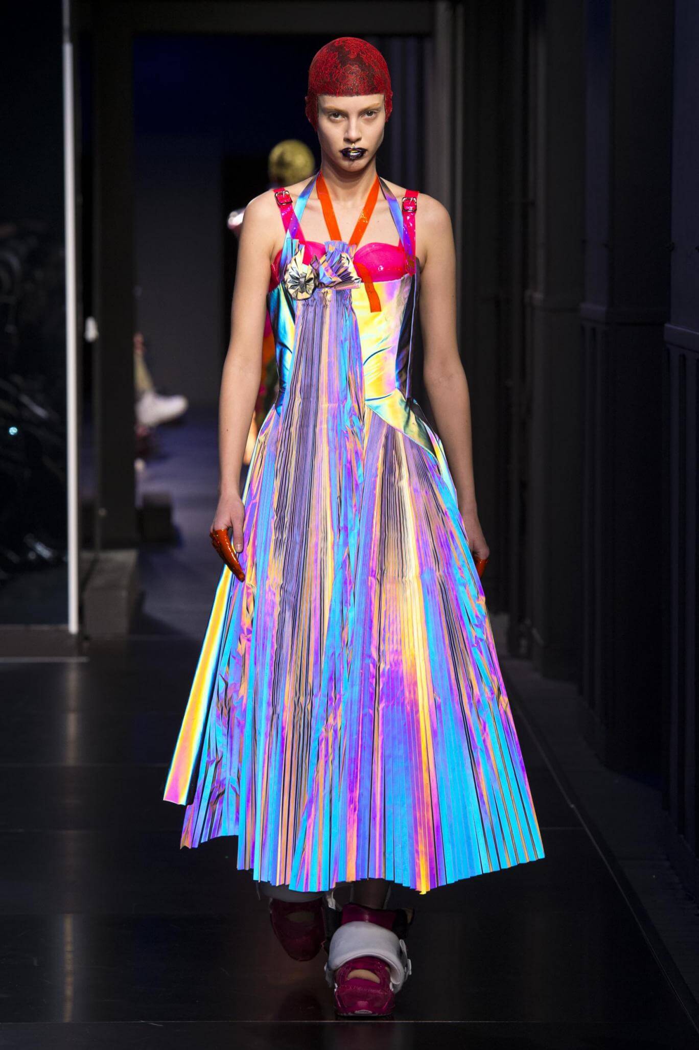 But there is a harmony in all this. We want all that metallic rainbow sheen strobing-under-the-lights-stuff in our lives. We did say we were in the club. Razor sharp knife pleats came to life and plastic trench coats added protection. And then there were sporty modern geisha’s in sneakers, holding iridescent parasols. An etching of femininity in the bras worn war-like on the outside. Inside out, upside down as Margiela has always done it. But wait. Here we must note the black pant suit, the tiny hint of a fashion moment; Martin Margiela’s spirit fused with Galliano’s tailoring. Deep breaths. A remix of Lana Del Rey’s Blue Velvet, got inside our heads, hypnotic. We told you nothing is what it seems. Fantasy challenged reality with textures, prints, layers, puffer jackets morphed into dresses. As Lewis Carroll wrote in Alice’s Adventures in Wonderland: “If I had a world of my own, everything would be nonsense. Nothing would be what it is, because everything would be what it isn’t…You see?” We see. We saw. We like a challenge.