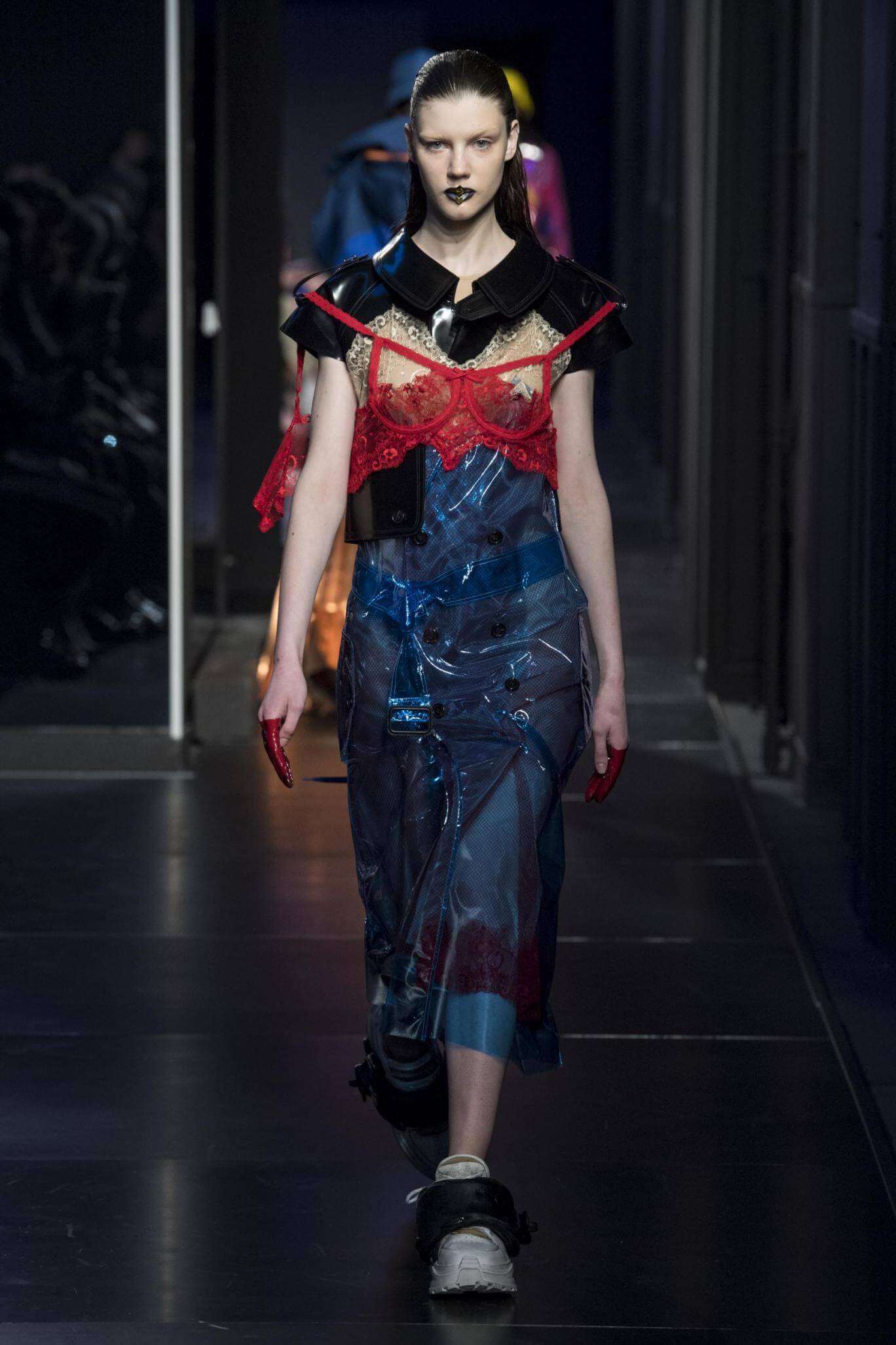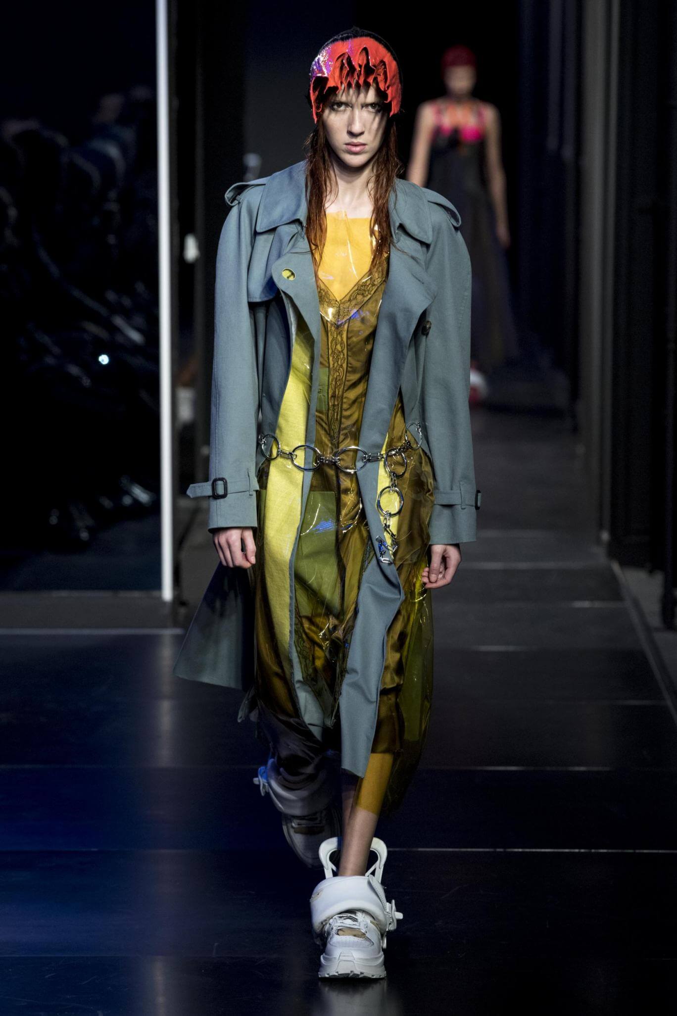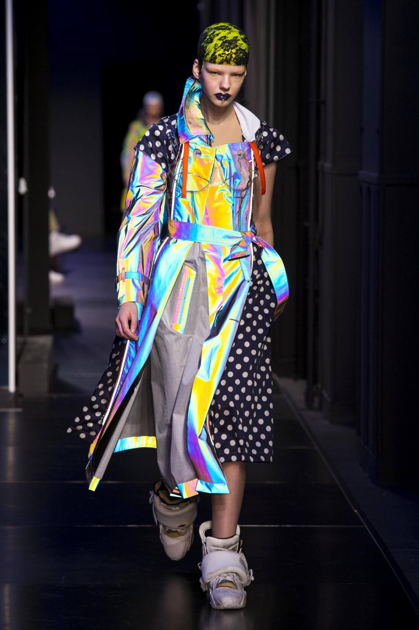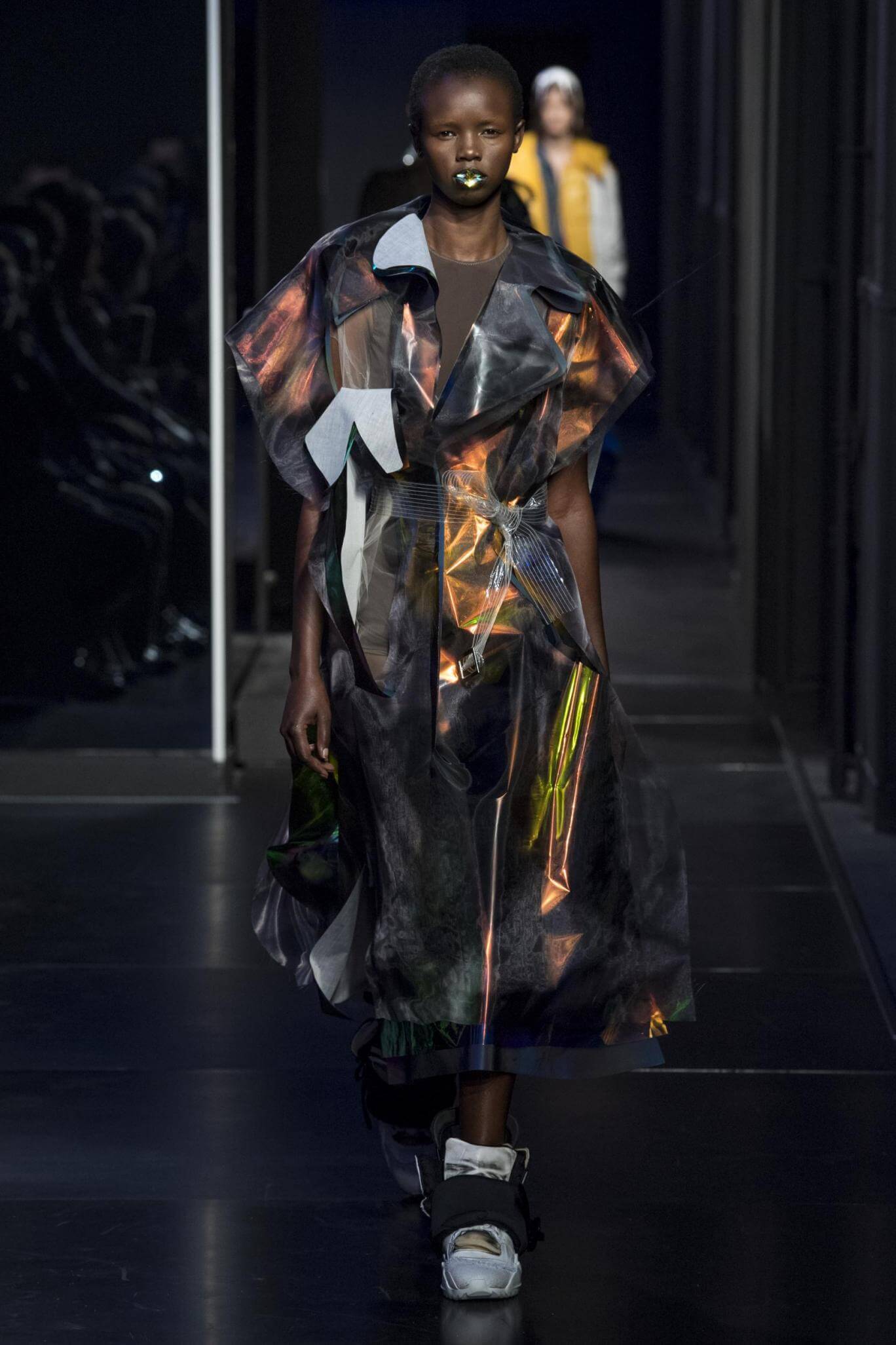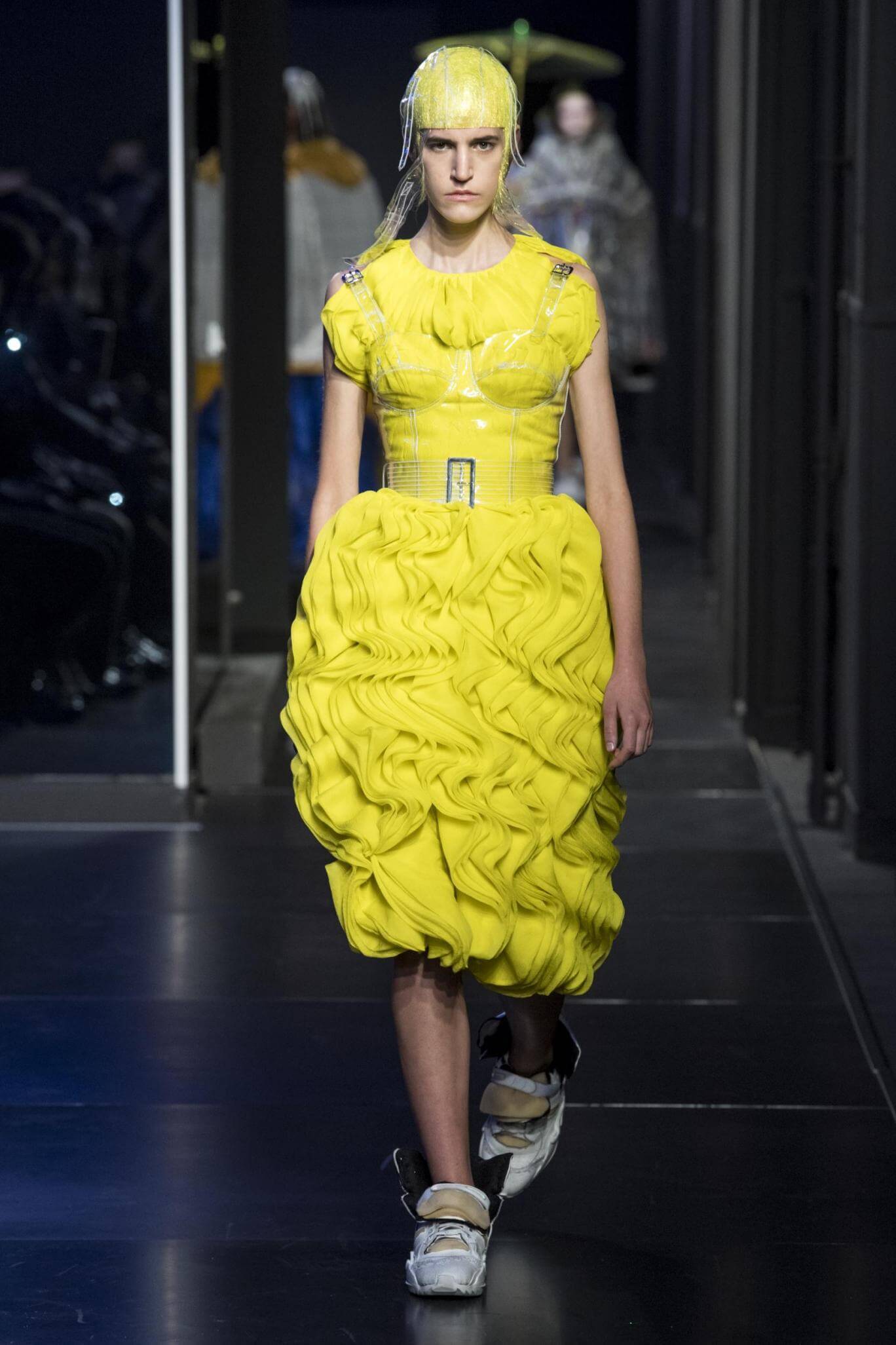 But there is a harmony in all this. We want all that metallic rainbow sheen strobing-under-the-lights-stuff in our lives. We did say we were in the club. Razor sharp knife pleats came to life and plastic trench coats added protection. And then there were sporty modern geisha’s in sneakers, holding iridescent parasols. An etching of femininity in the bras worn war-like on the outside. Inside out, upside down as Margiela has always done it. But wait. Here we must note the black pant suit, the tiny hint of a fashion moment; Martin Margiela’s spirit fused with Galliano’s tailoring. Deep breaths. A remix of Lana Del Rey’s Blue Velvet, got inside our heads, hypnotic. We told you nothing is what it seems. Fantasy challenged reality with textures, prints, layers, puffer jackets morphed into dresses. As Lewis Carroll wrote in Alice’s Adventures in Wonderland: “If I had a world of my own, everything would be nonsense. Nothing would be what it is, because everything would be what it isn’t…You see?” We see. We saw. We like a challenge.