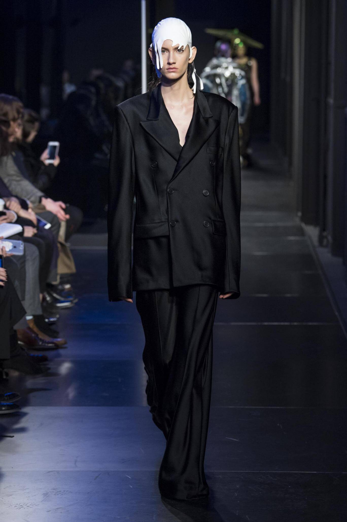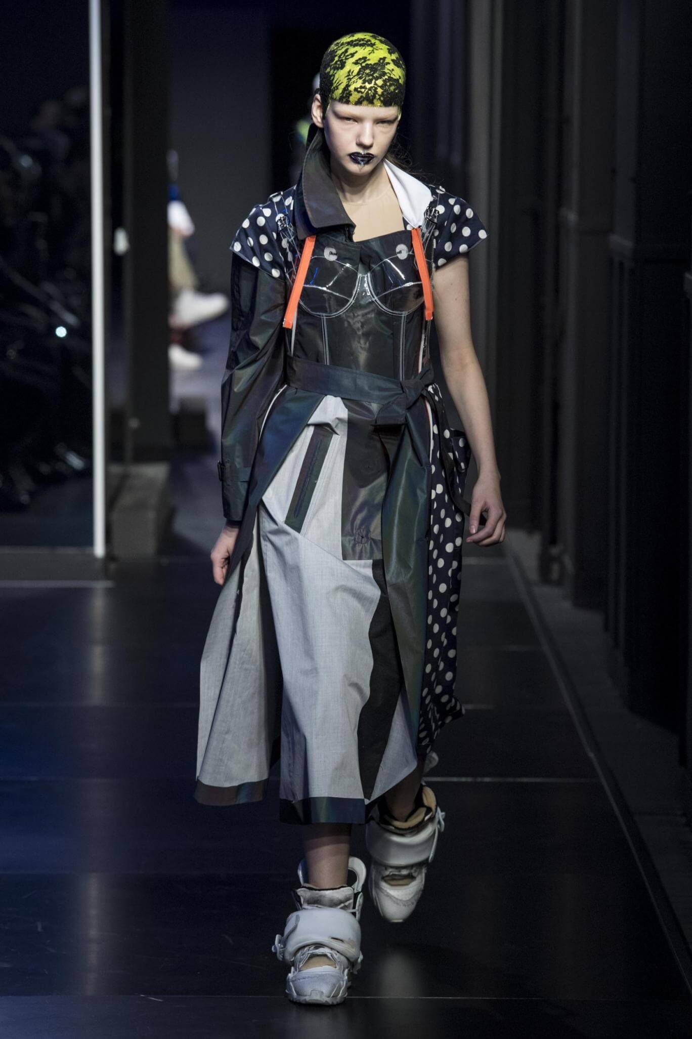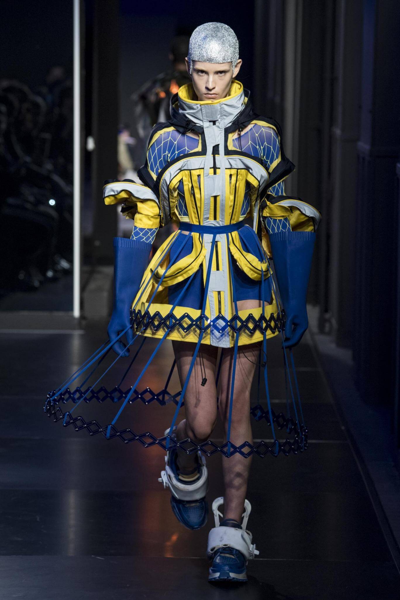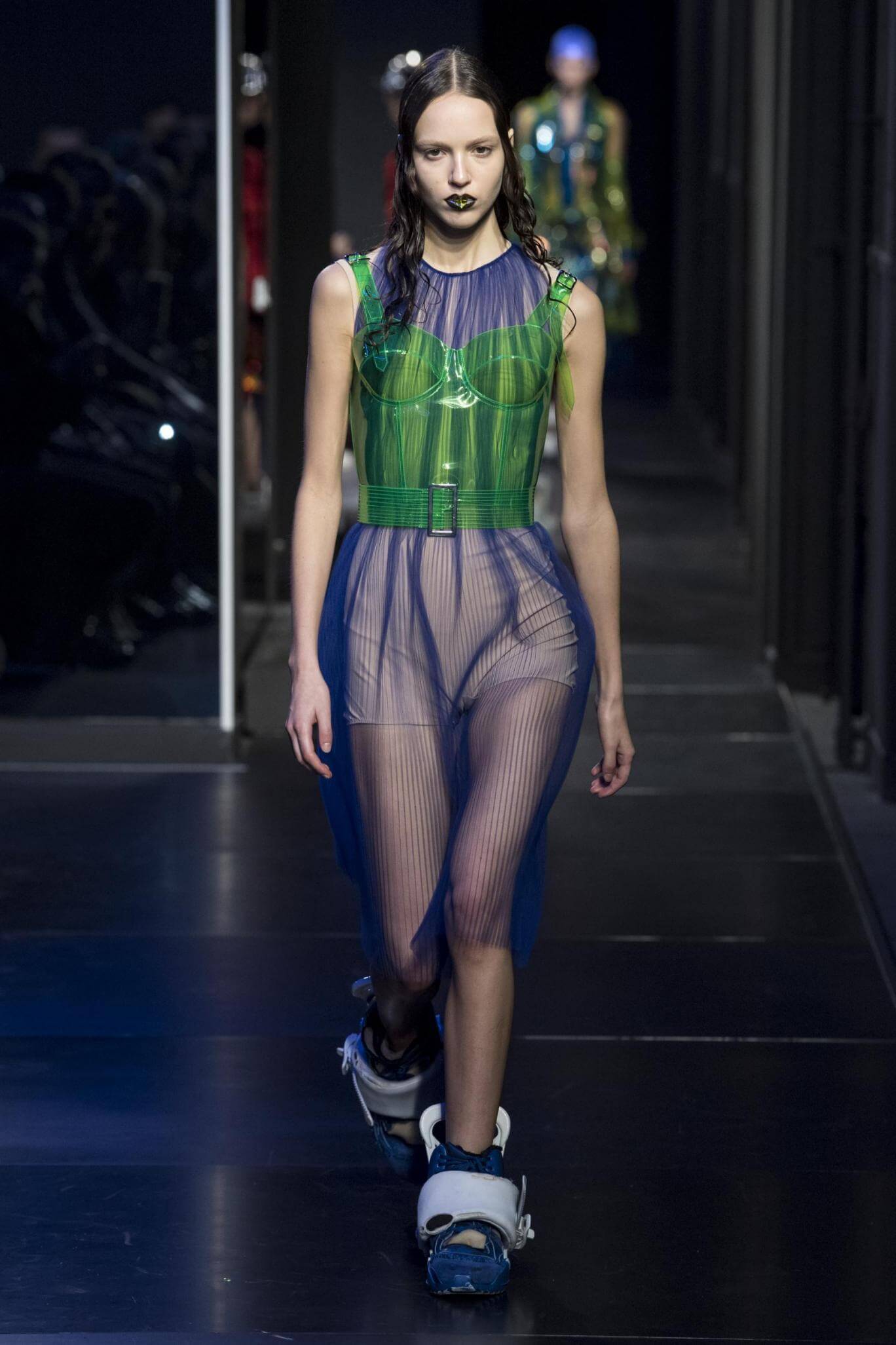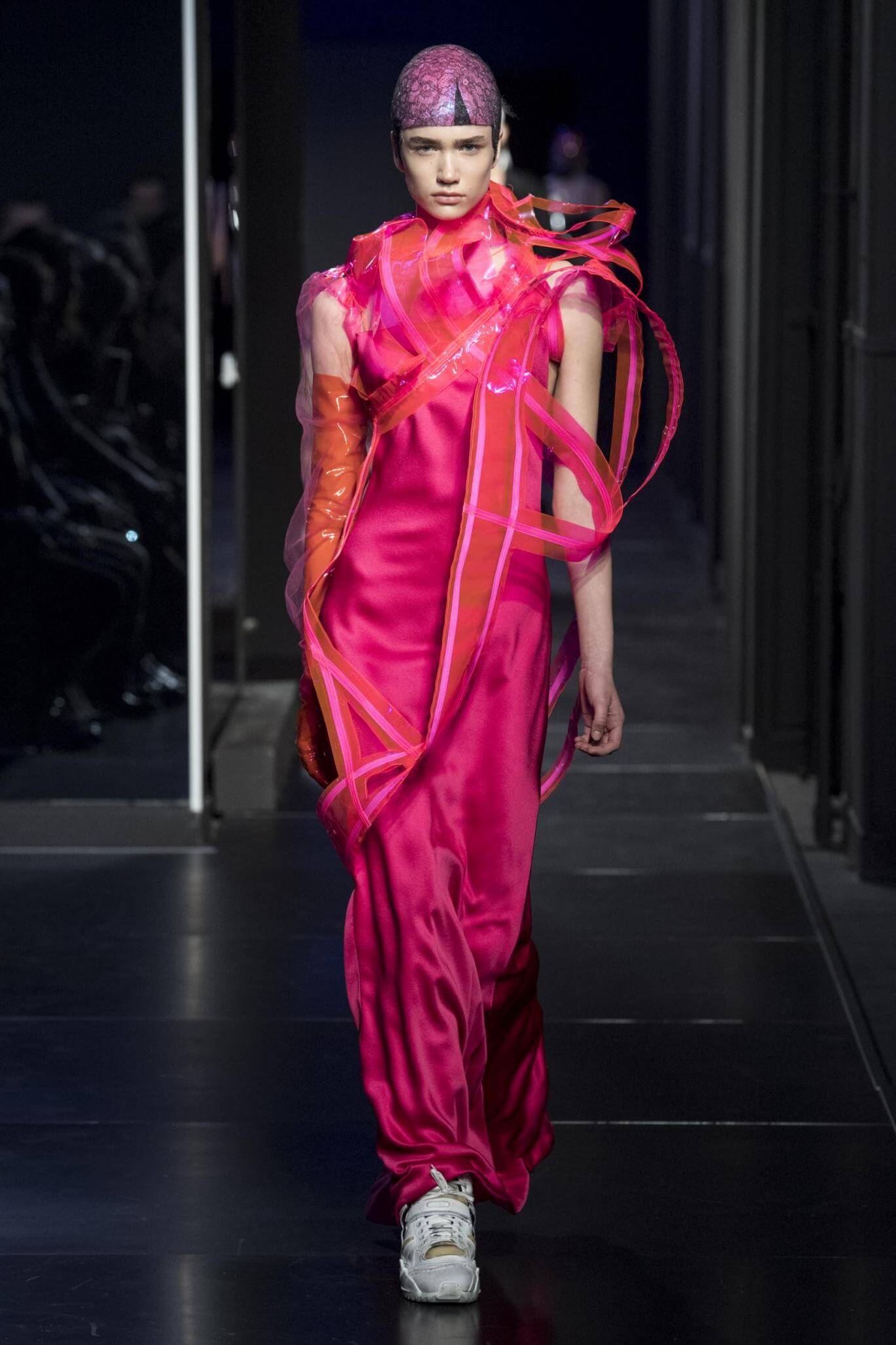 But there is a harmony in all this. We want all that metallic rainbow sheen strobing-under-the-lights-stuff in our lives. We did say we were in the club. Razor sharp knife pleats came to life and plastic trench coats added protection. And then there were sporty modern geisha’s in sneakers, holding iridescent parasols. An etching of femininity in the bras worn war-like on the outside. Inside out, upside down as Margiela has always done it. But wait. Here we must note the black pant suit, the tiny hint of a fashion moment; Martin Margiela’s spirit fused with Galliano’s tailoring. Deep breaths. A remix of Lana Del Rey’s Blue Velvet, got inside our heads, hypnotic. We told you nothing is what it seems. Fantasy challenged reality with textures, prints, layers, puffer jackets morphed into dresses. As Lewis Carroll wrote in Alice’s Adventures in Wonderland: “If I had a world of my own, everything would be nonsense. Nothing would be what it is, because everything would be what it isn’t…You see?” We see. We saw. We like a challenge.