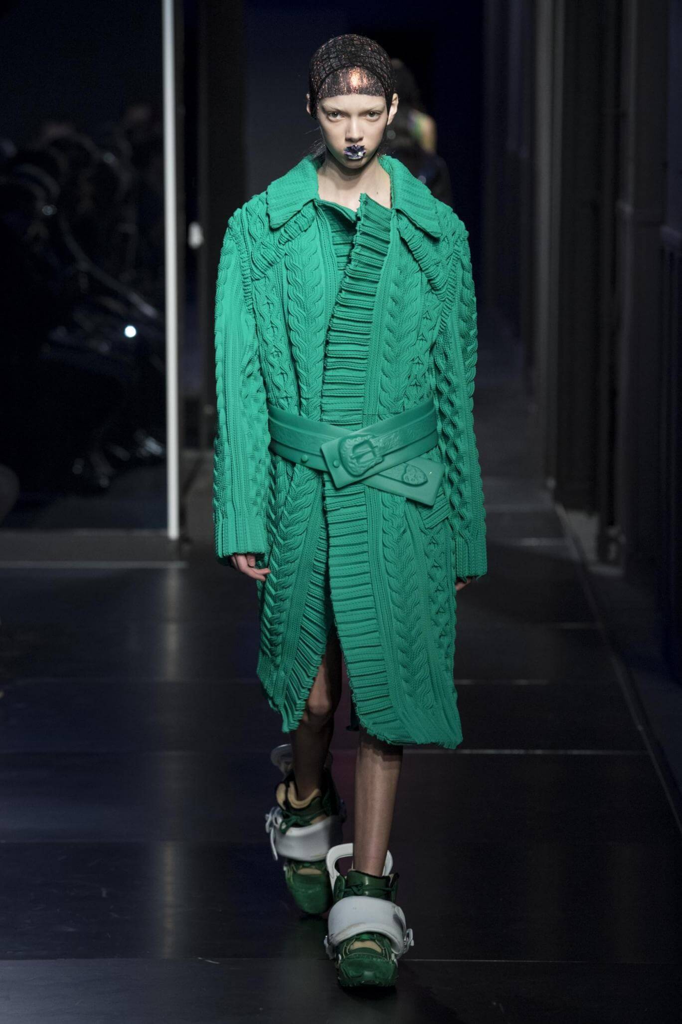 Welcome to Maison Margiela’s distorted wonder-club-land. We in da club this morning. Disorder. Urban chaos. Nothing is what it seems. But then it never has been at Margiela. Twenty years ago, men in white lab coats held up Martin Margiela’s collection on coat hangers. So simple but fabulous. Twenty years on women purposefully charged into this world, an extra terrestrial kind of living room. American installation artist Jessi Reaves had been commissioned by John Galliano to add a disordered structure as a foil for all this quintessential pandemonium. Discordant furniture, chopped up, rearranged, an “unfinished symphony,” as Galliano called it.